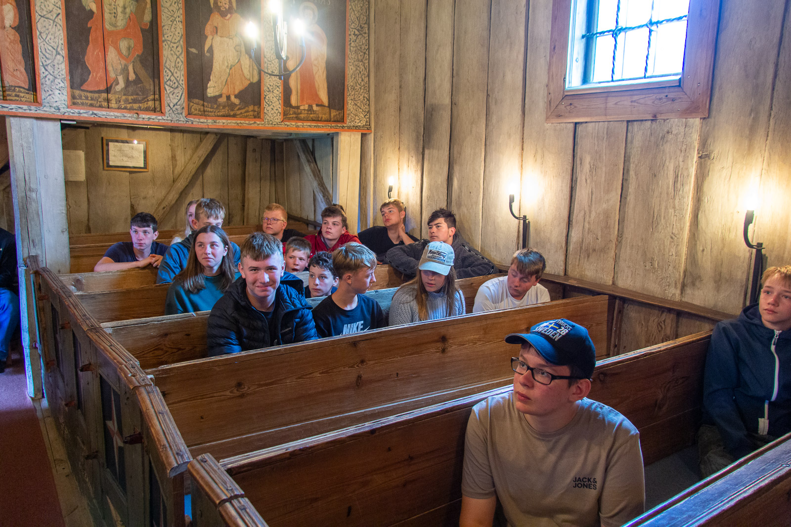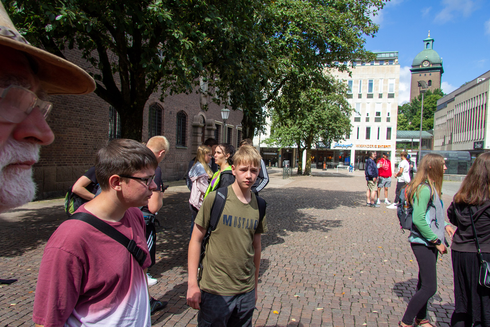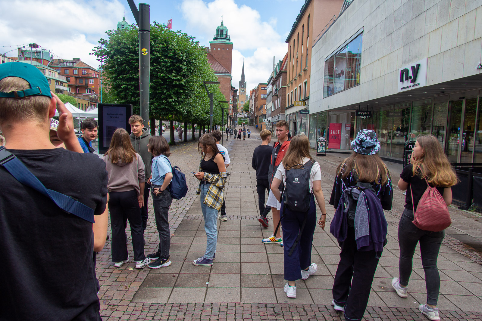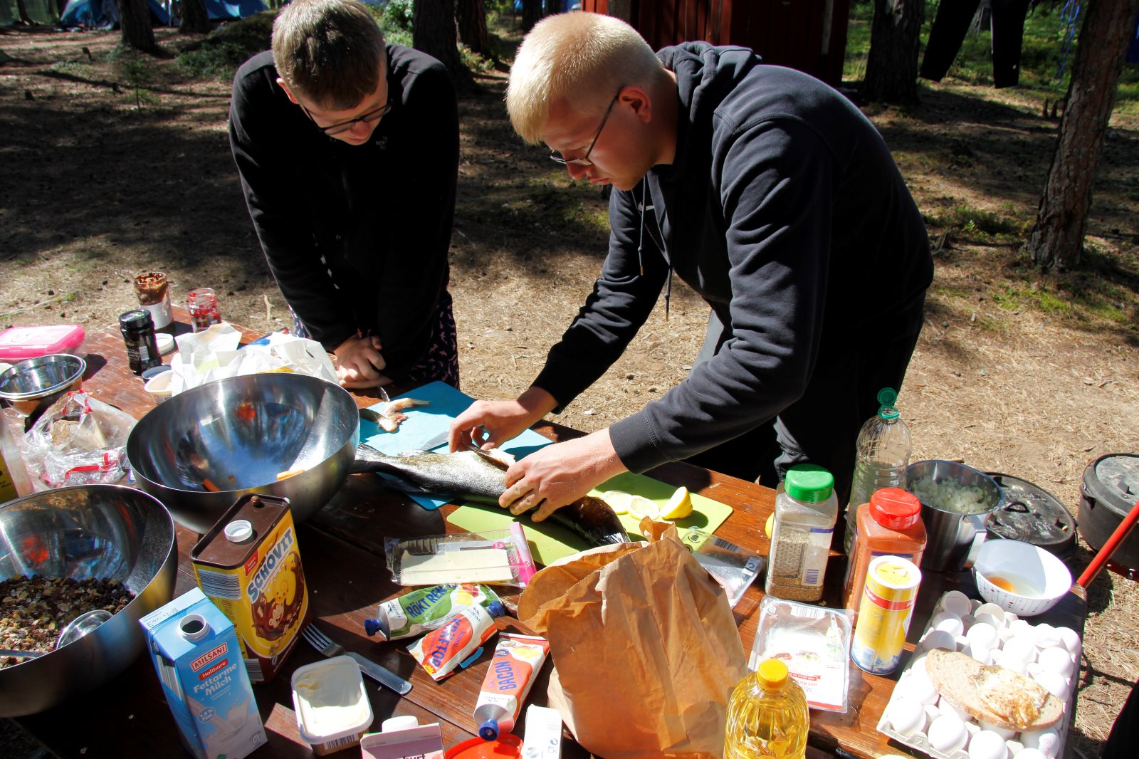 Der Montagmorgen war tatsächlich ruhig. Wahrscheinlich war der Rasen fertig gemäht. 😊 Um zwölf Uhr Mittag ging es los nach Borås. Zunächst in die Innenstadt. Dort konnten wir die Wandgemälde bestaunen und die Geschäfte erkunden. In der Karlskirche gibt es sogar für jeden Besucher in der Bank eine eigene Steckdose. Das wäre vielleicht etwas für unsere Konfis. Es war schon Unterschied zu dem Leben im Zelt und Boot. Dann ging es in den Konsumtempelbereich nach Knalleland. Frank, Johann und ich kauften ein: 10 kg Hackfleisch, 75 Portionen Kartoffelpüree, 4 l Preiselbeeren, 2 l Sahne und acht Packungen Champions daraus entstand das Abendessen Köttbullar. 800 entstanden und alle wurden satt. Und wir haben sogar das erste Mal etwas übriggehabt. (Die Mengen , die von dieser Gruppe gegessen werden, sind im Übrigen ein weiterer Rekord) Ok, es wurde dann noch Stockbrot gebacken. Nach dem Essen gab es eine Yogagruppe und andere versuchten sich mit Angeln und faulenzen. Morgen geht es ans Meer zu den Schären.