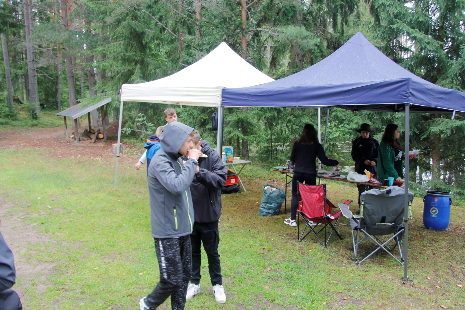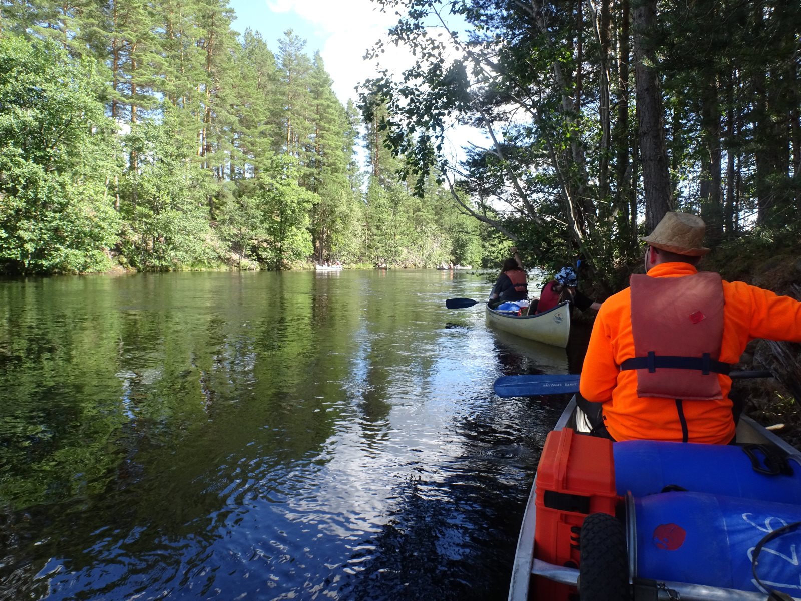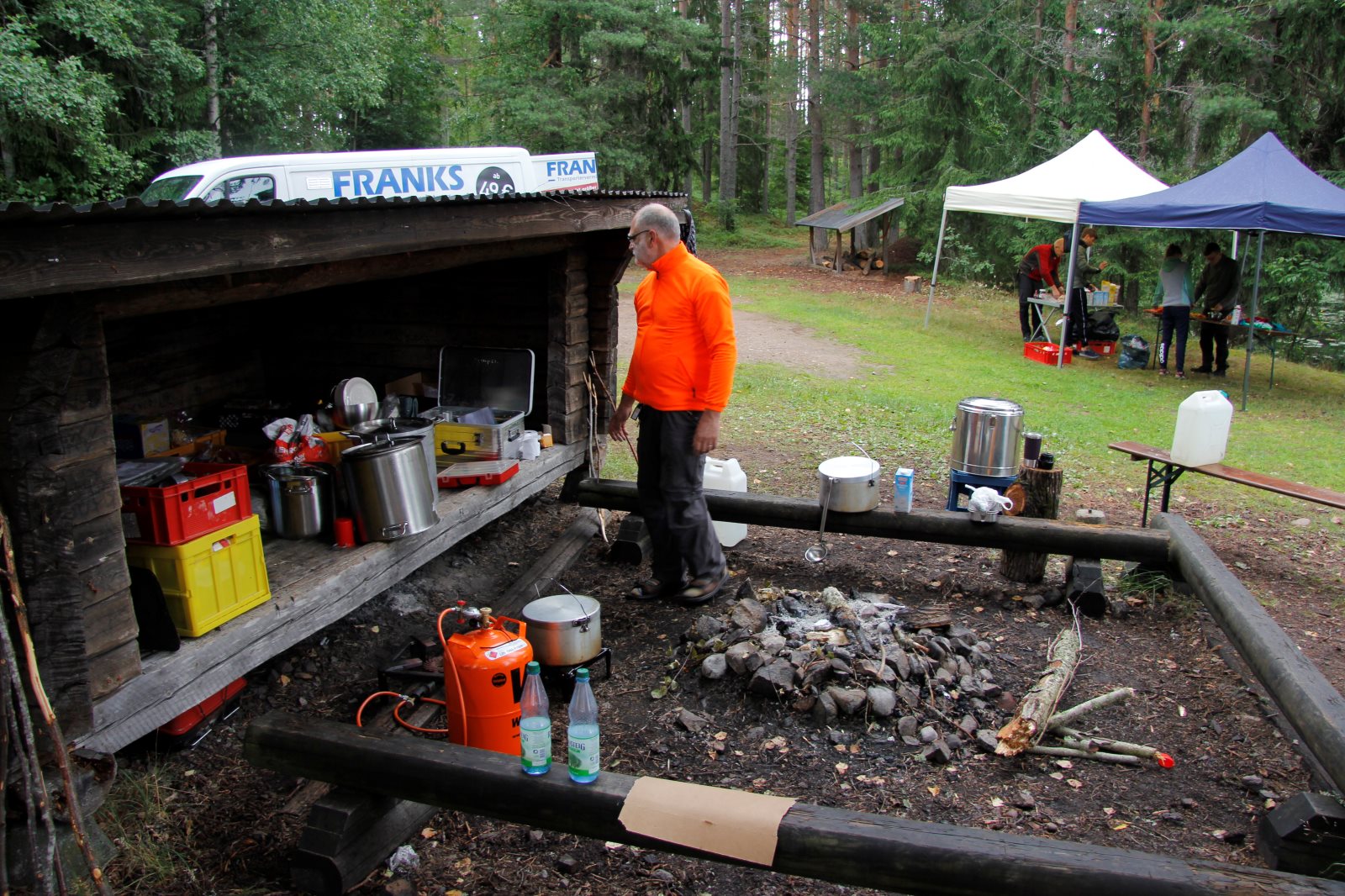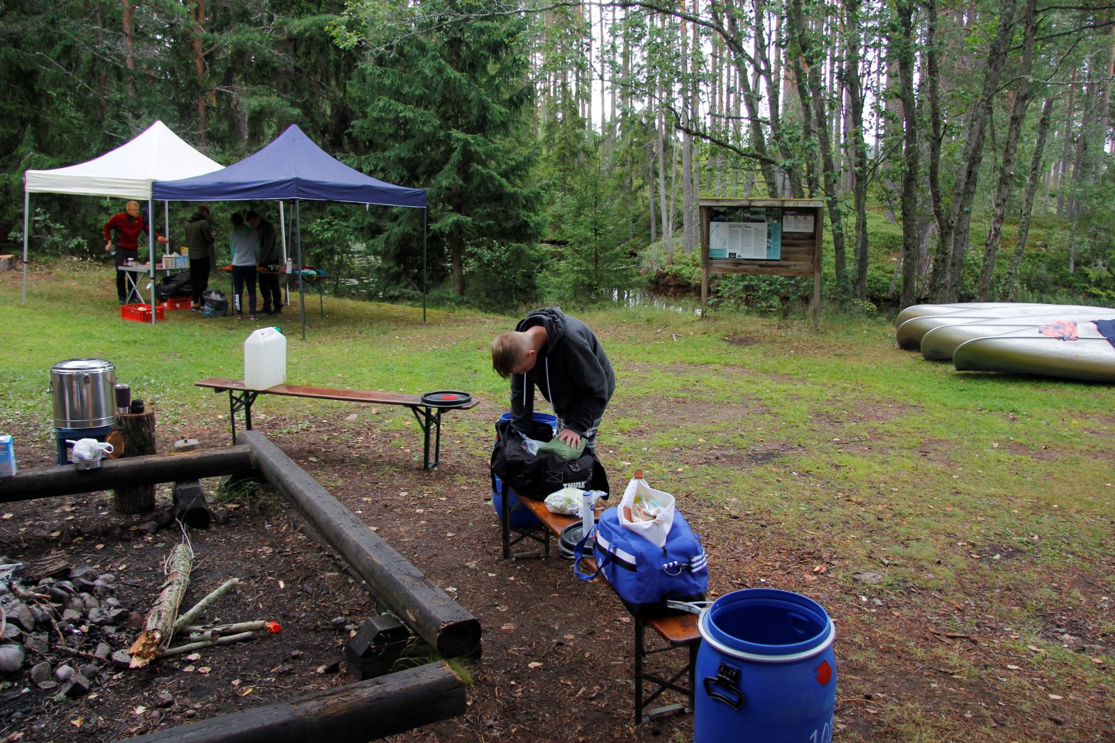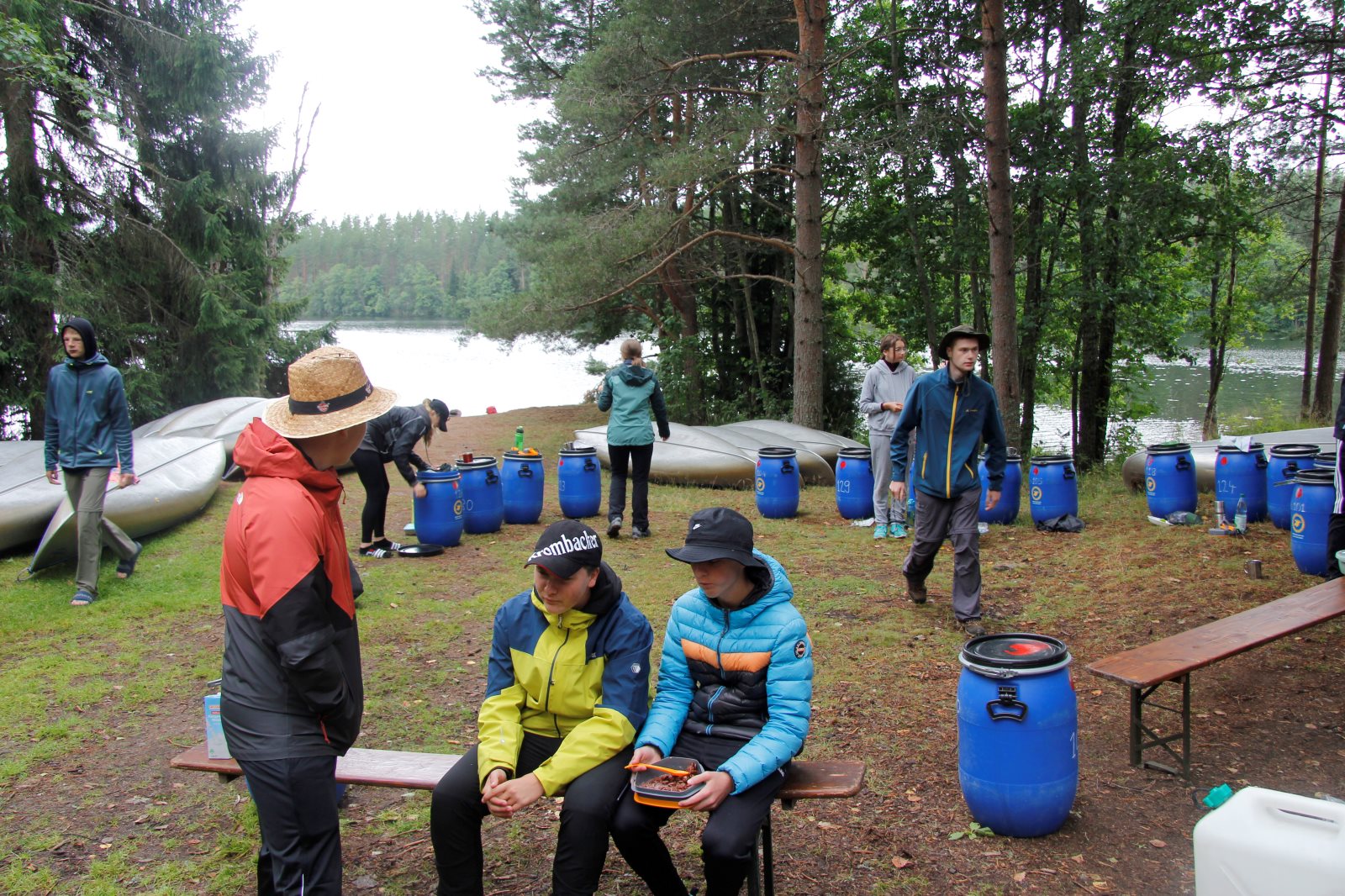 Ruhig war es am Morgen dieses Dienstages. In der Nacht hatte es noch einmal kräftig geregnet, aber es hielten alle Zelte gut durch. Dann ging es nach dem Frühstück an die Vorbereitung des ersten Kanutages. Die Tonnen mit dem Gepäck wurden gestopft (Es kamen ja jetzt wieder alle an ihr Gepäck) und dann ging es aufs Wasser. Ohne Probleme waren wir alle in die Boote gekommen. Die ersten Angeln waren schon am Vortag zum Einsatz gekommen. Nun wurden sie immer wieder ausgeworfen und leider immer auch wieder leer eingezogen. Beinahe am Tagesziel gingen zwei baden. Die Tonne erwies sich als nicht so dicht wie geplant. Aber das tolle ist, dass wir hier entlang einer alten Schmalspurbahn campen dürfen und auch den Tanzboden nutzen können, der überdacht ist. Das Biwak, das am Fluss liegt, wäre für unsere Gruppe zu klein gewesen. Aber die Leute hier sind sehr zuvorkommend. Die Zelte konnten wir noch trocken aufbauen. Nun regnet es. Morgen soll es trocken bleiben und dann sogar richtig warm werden. Wir werden sehen. Nun sitzen einige zusammen unter Dach und einige haben sich an den Biwakfeuerplatz zurückgezogen. Nach einem Rundgang werde ich mich früher als gestern in die Horizontale begeben. Es war trotz dem Wetter ein lustiger und interessanter Tag.