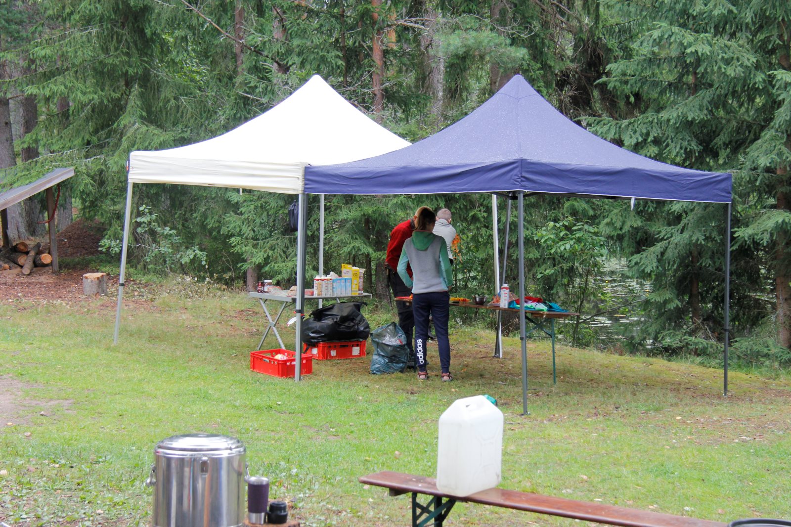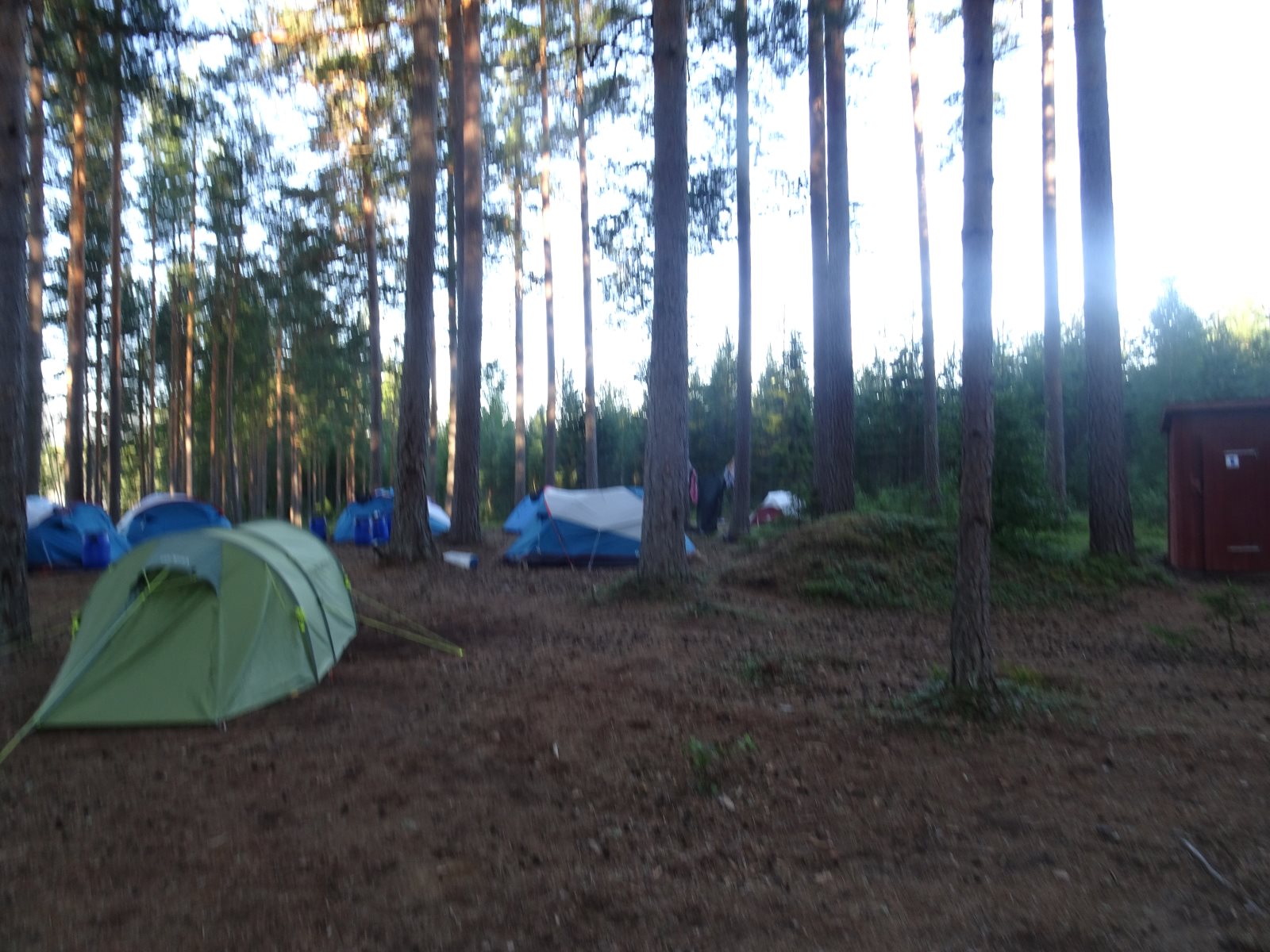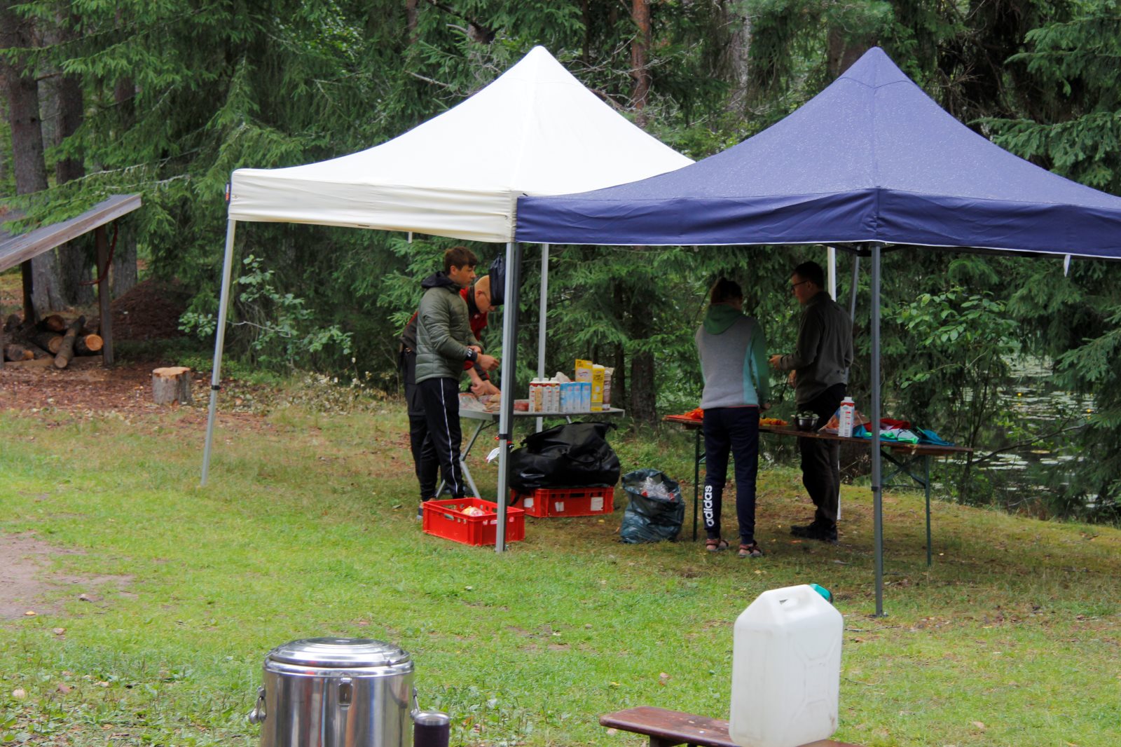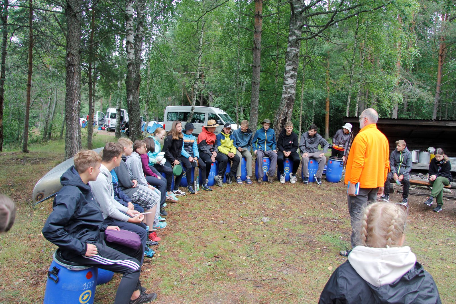Ruhig war es am Morgen dieses Dienstages. In der Nacht hatte es noch einmal kräftig geregnet, aber es hielten alle Zelte gut durch. Dann ging es nach dem Frühstück an die Vorbereitung des ersten Kanutages. Die Tonnen mit dem Gepäck wurden gestopft (Es kamen ja jetzt wieder alle an ihr Gepäck) und dann ging es aufs Wasser. Ohne Probleme waren wir alle in die Boote gekommen. Die ersten Angeln waren schon am Vortag zum Einsatz gekommen. Nun wurden sie immer wieder ausgeworfen und leider immer auch wieder leer eingezogen. Beinahe am Tagesziel gingen zwei baden. Die Tonne erwies sich als nicht so dicht wie geplant. Aber das tolle ist, dass wir hier entlang einer alten Schmalspurbahn campen dürfen und auch den Tanzboden nutzen können, der überdacht ist. Das Biwak, das am Fluss liegt, wäre für unsere Gruppe zu klein gewesen. Aber die Leute hier sind sehr zuvorkommend. Die Zelte konnten wir noch trocken aufbauen. Nun regnet es. Morgen soll es trocken bleiben und dann sogar richtig warm werden. Wir werden sehen. Nun sitzen einige zusammen unter Dach und einige haben sich an den Biwakfeuerplatz zurückgezogen. Nach einem Rundgang werde ich mich früher als gestern in die Horizontale begeben. Es war trotz dem Wetter ein lustiger und interessanter Tag.