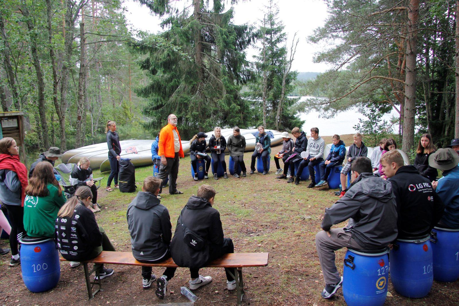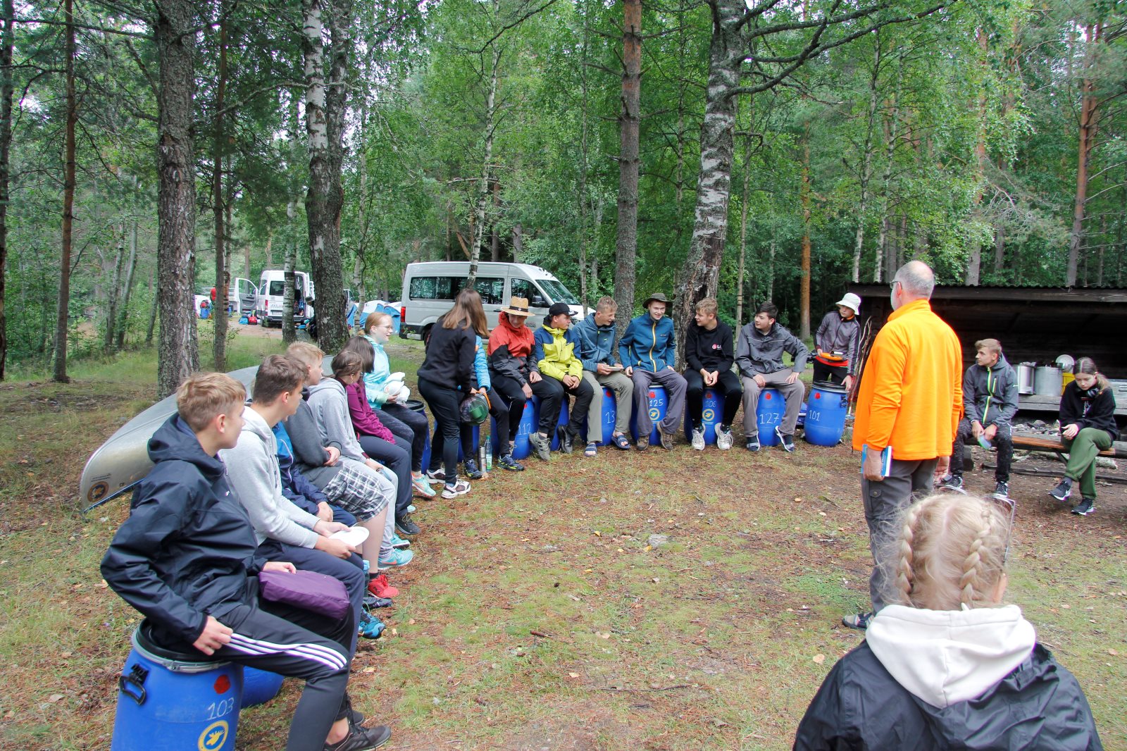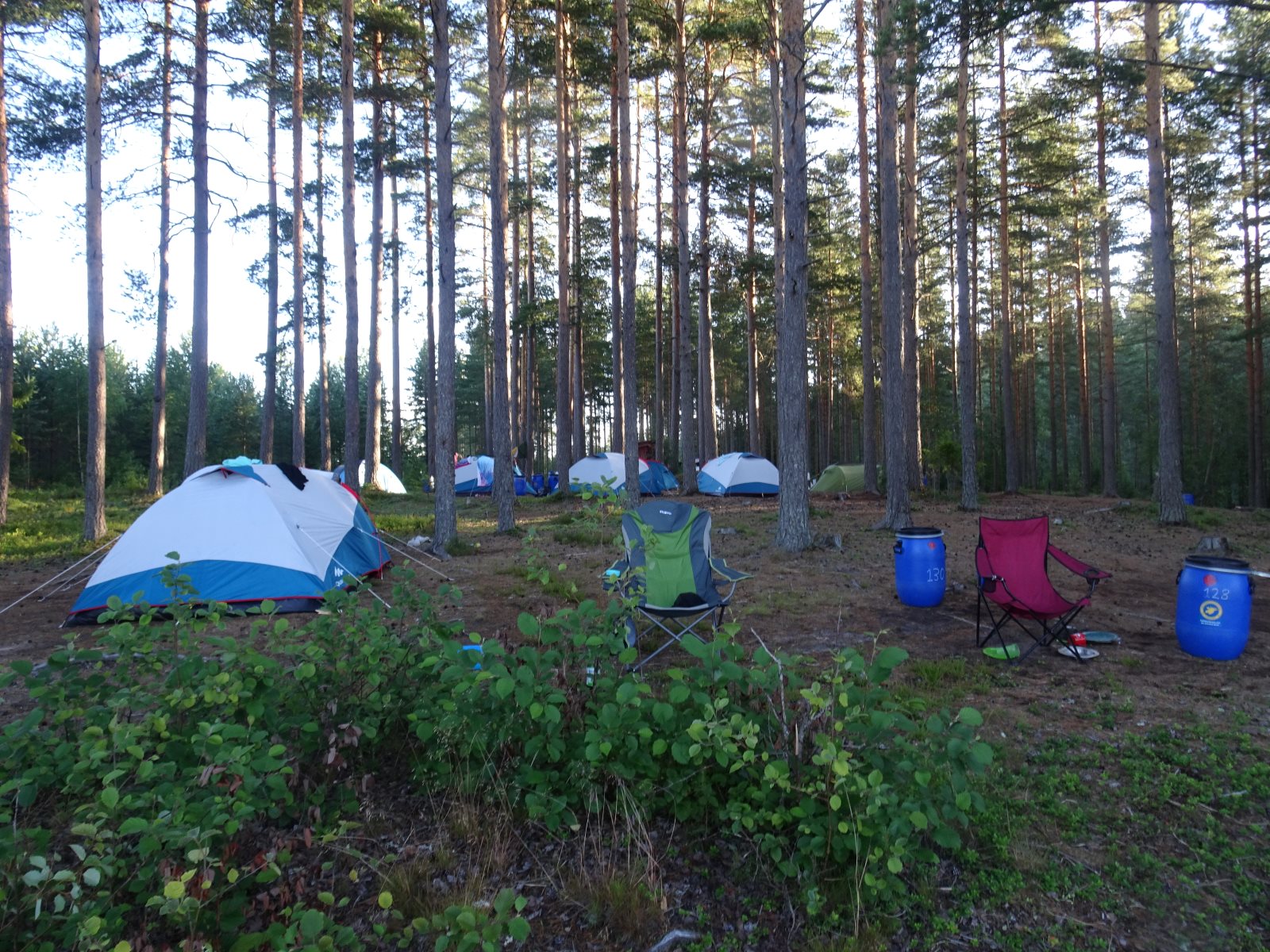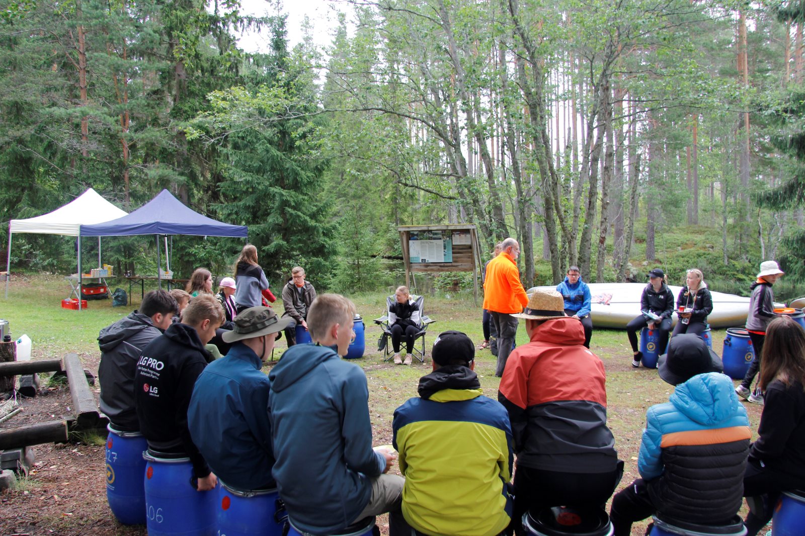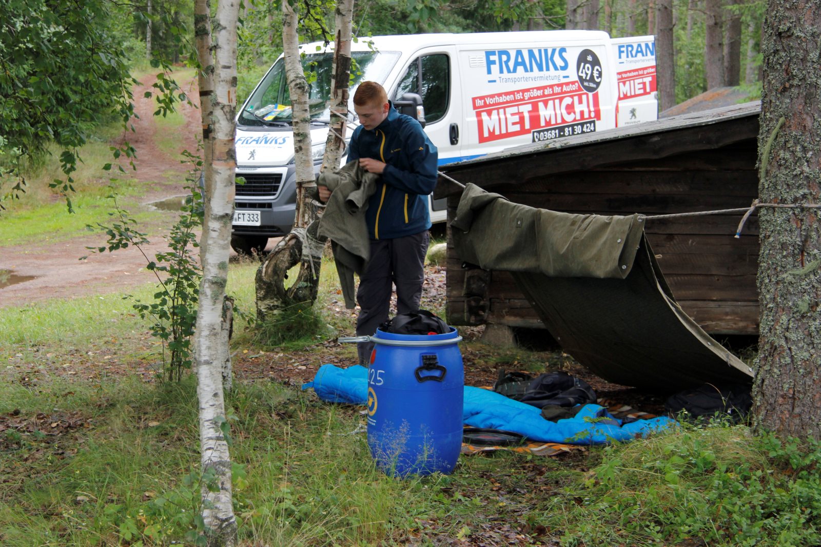 Ruhig war es am Morgen dieses Dienstages. In der Nacht hatte es noch einmal kräftig geregnet, aber es hielten alle Zelte gut durch. Dann ging es nach dem Frühstück an die Vorbereitung des ersten Kanutages. Die Tonnen mit dem Gepäck wurden gestopft (Es kamen ja jetzt wieder alle an ihr Gepäck) und dann ging es aufs Wasser. Ohne Probleme waren wir alle in die Boote gekommen. Die ersten Angeln waren schon am Vortag zum Einsatz gekommen. Nun wurden sie immer wieder ausgeworfen und leider immer auch wieder leer eingezogen. Beinahe am Tagesziel gingen zwei baden. Die Tonne erwies sich als nicht so dicht wie geplant. Aber das tolle ist, dass wir hier entlang einer alten Schmalspurbahn campen dürfen und auch den Tanzboden nutzen können, der überdacht ist. Das Biwak, das am Fluss liegt, wäre für unsere Gruppe zu klein gewesen. Aber die Leute hier sind sehr zuvorkommend. Die Zelte konnten wir noch trocken aufbauen. Nun regnet es. Morgen soll es trocken bleiben und dann sogar richtig warm werden. Wir werden sehen. Nun sitzen einige zusammen unter Dach und einige haben sich an den Biwakfeuerplatz zurückgezogen. Nach einem Rundgang werde ich mich früher als gestern in die Horizontale begeben. Es war trotz dem Wetter ein lustiger und interessanter Tag.