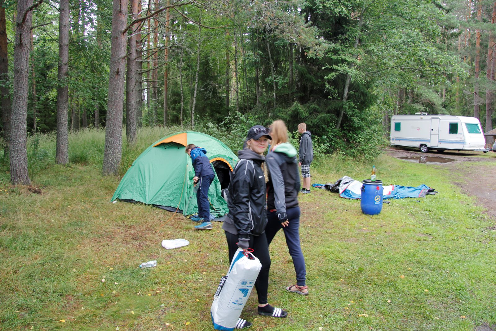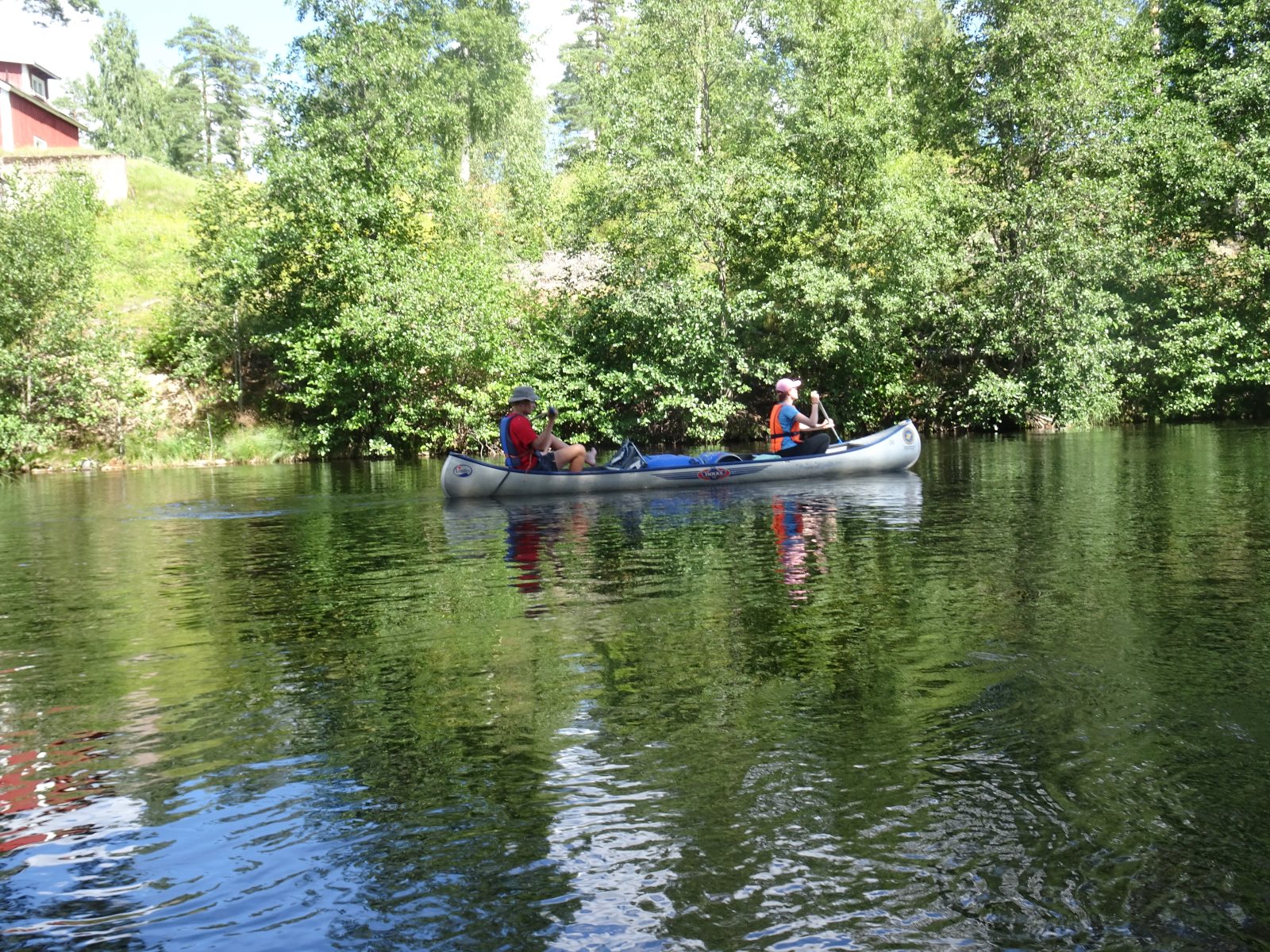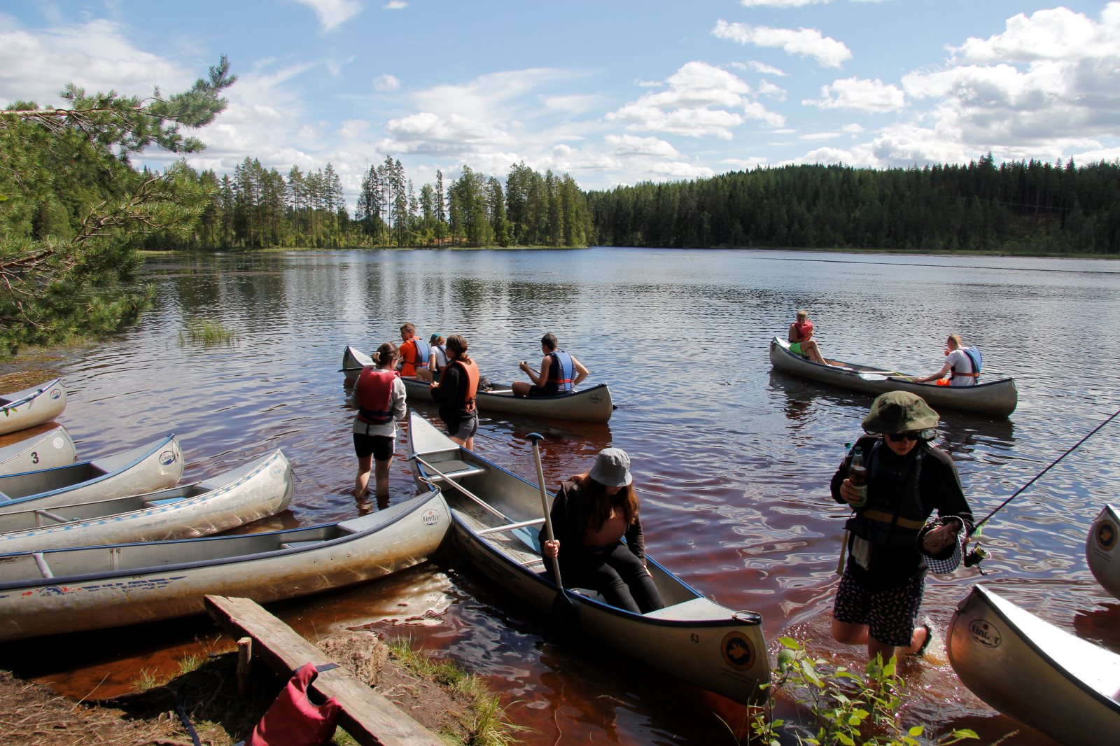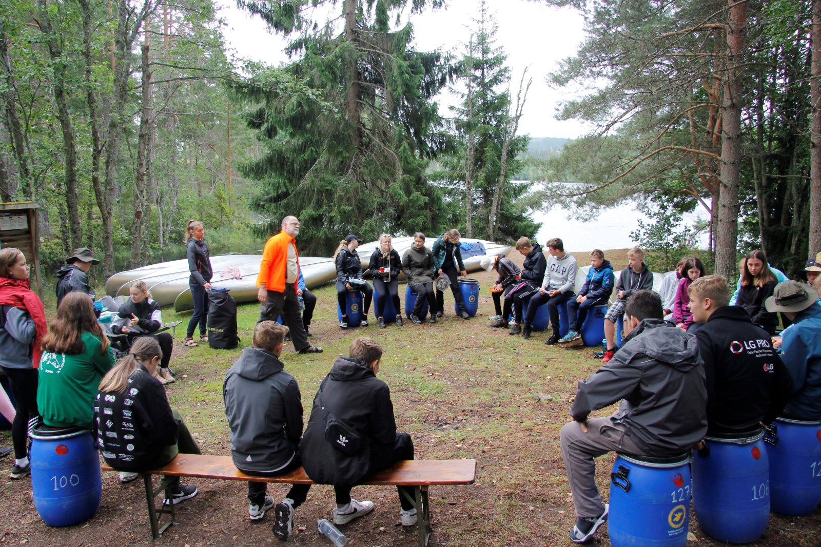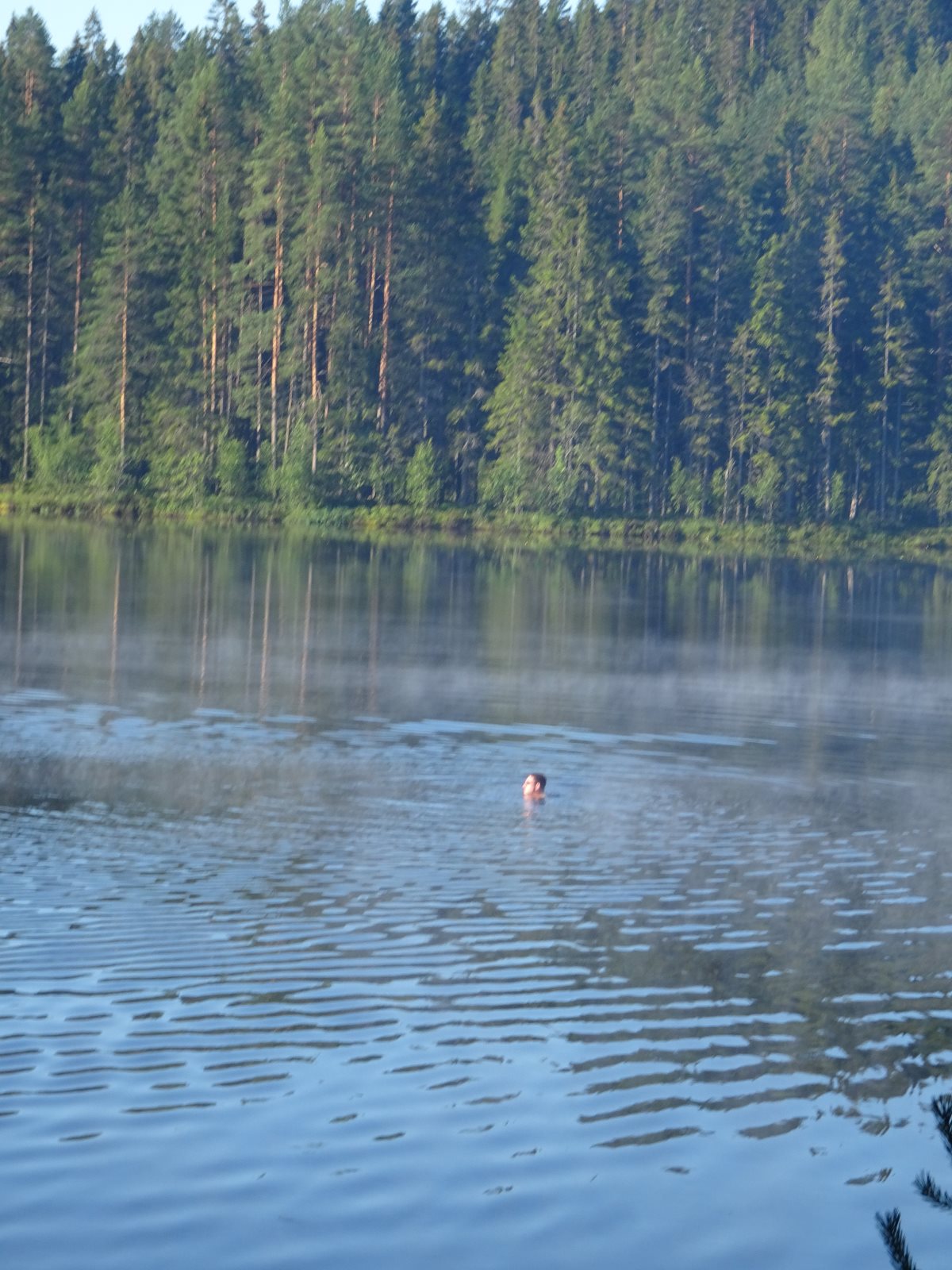 Ruhig war es am Morgen dieses Dienstages. In der Nacht hatte es noch einmal kräftig geregnet, aber es hielten alle Zelte gut durch. Dann ging es nach dem Frühstück an die Vorbereitung des ersten Kanutages. Die Tonnen mit dem Gepäck wurden gestopft (Es kamen ja jetzt wieder alle an ihr Gepäck) und dann ging es aufs Wasser. Ohne Probleme waren wir alle in die Boote gekommen. Die ersten Angeln waren schon am Vortag zum Einsatz gekommen. Nun wurden sie immer wieder ausgeworfen und leider immer auch wieder leer eingezogen. Beinahe am Tagesziel gingen zwei baden. Die Tonne erwies sich als nicht so dicht wie geplant. Aber das tolle ist, dass wir hier entlang einer alten Schmalspurbahn campen dürfen und auch den Tanzboden nutzen können, der überdacht ist. Das Biwak, das am Fluss liegt, wäre für unsere Gruppe zu klein gewesen. Aber die Leute hier sind sehr zuvorkommend. Die Zelte konnten wir noch trocken aufbauen. Nun regnet es. Morgen soll es trocken bleiben und dann sogar richtig warm werden. Wir werden sehen. Nun sitzen einige zusammen unter Dach und einige haben sich an den Biwakfeuerplatz zurückgezogen. Nach einem Rundgang werde ich mich früher als gestern in die Horizontale begeben. Es war trotz dem Wetter ein lustiger und interessanter Tag.
