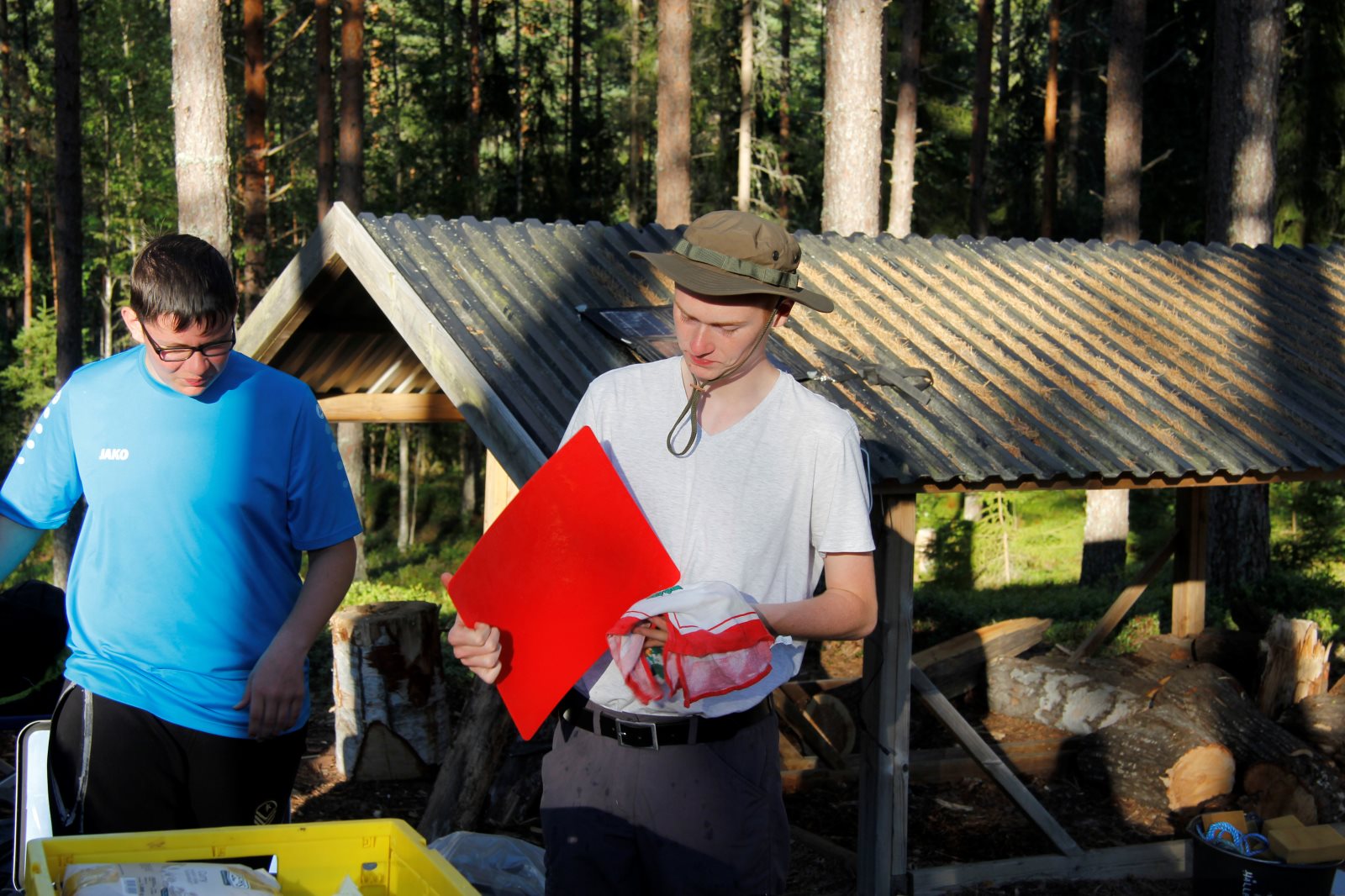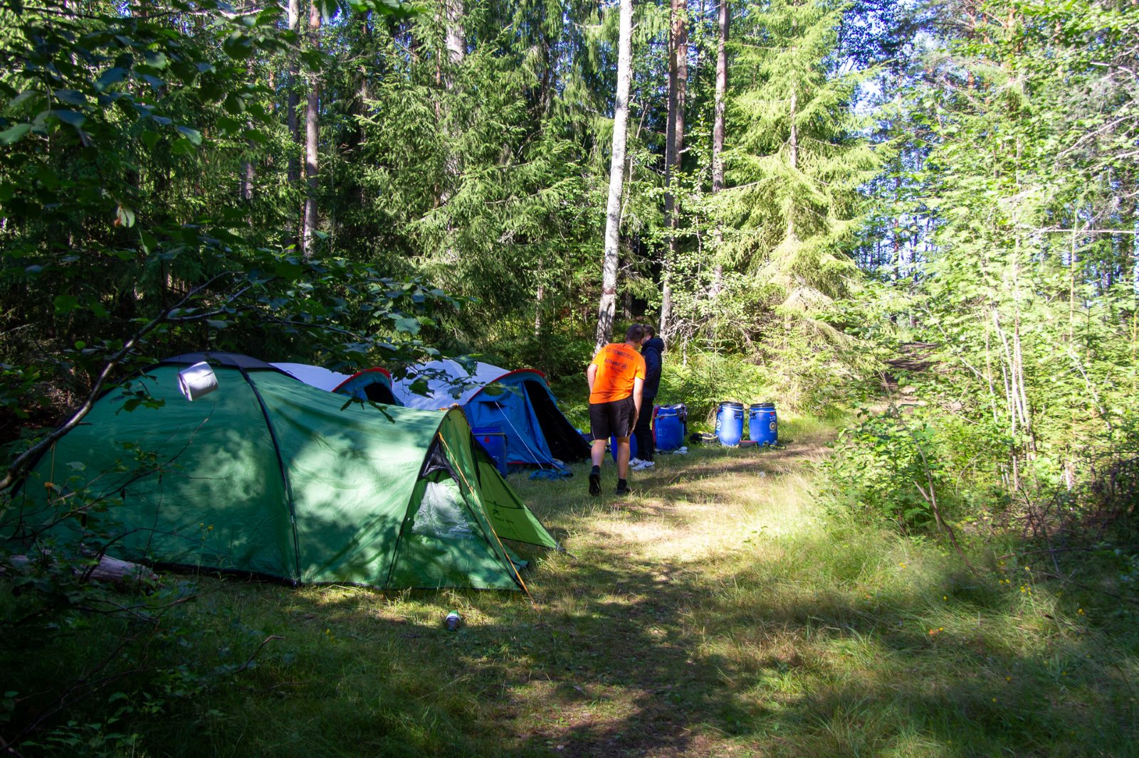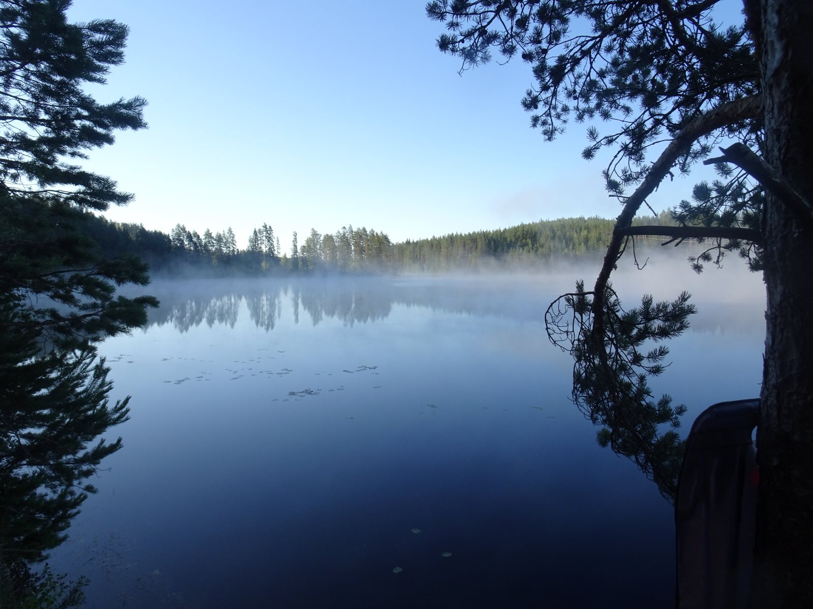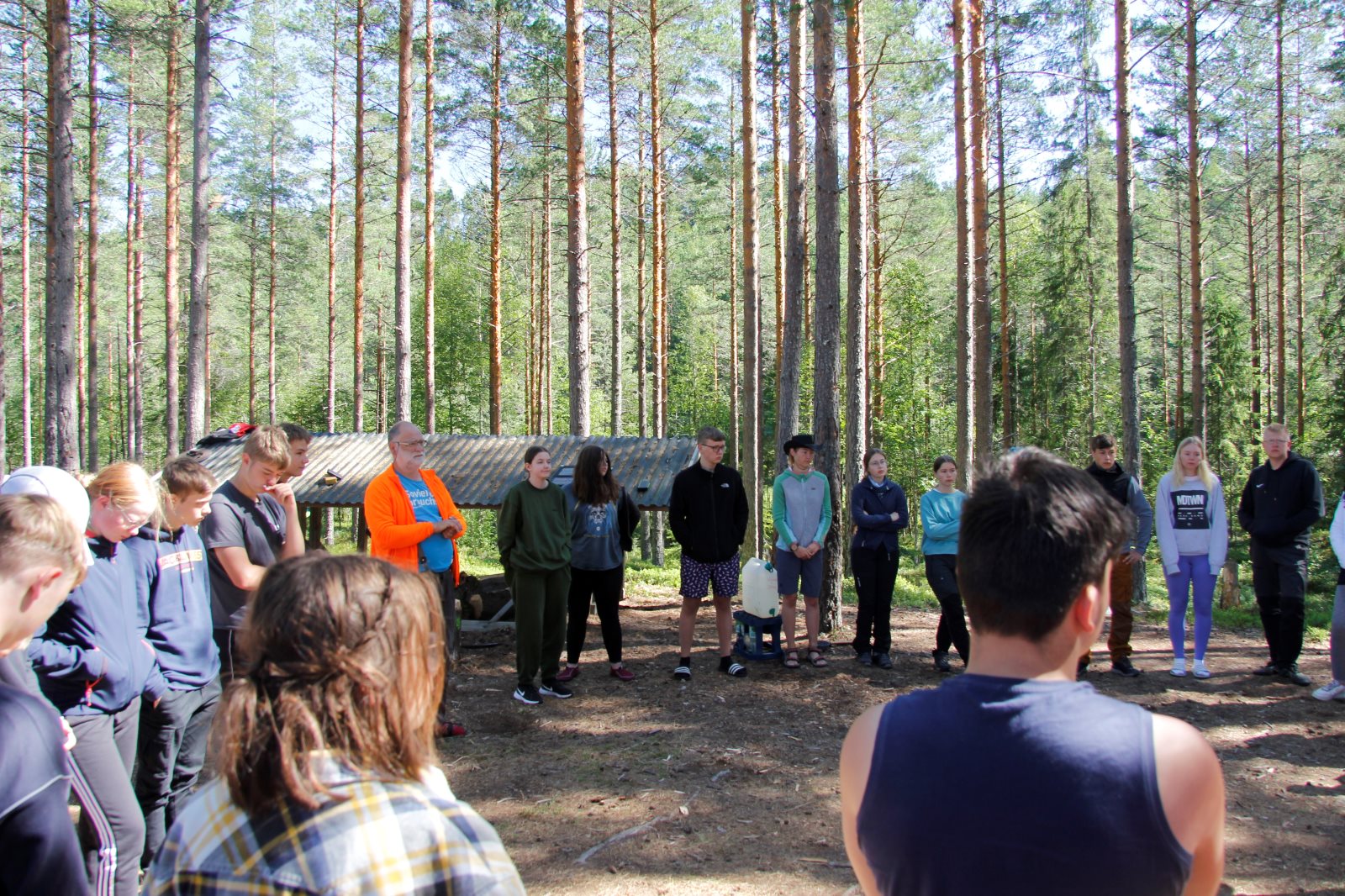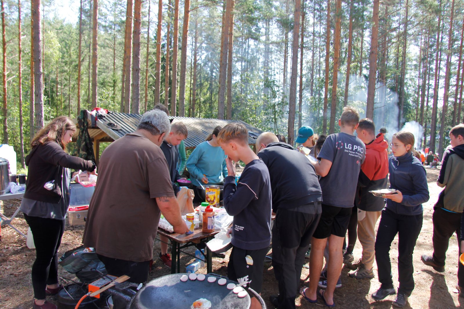 Ruhig war es am Morgen dieses Dienstages. In der Nacht hatte es noch einmal kräftig geregnet, aber es hielten alle Zelte gut durch. Dann ging es nach dem Frühstück an die Vorbereitung des ersten Kanutages. Die Tonnen mit dem Gepäck wurden gestopft (Es kamen ja jetzt wieder alle an ihr Gepäck) und dann ging es aufs Wasser. Ohne Probleme waren wir alle in die Boote gekommen. Die ersten Angeln waren schon am Vortag zum Einsatz gekommen. Nun wurden sie immer wieder ausgeworfen und leider immer auch wieder leer eingezogen. Beinahe am Tagesziel gingen zwei baden. Die Tonne erwies sich als nicht so dicht wie geplant. Aber das tolle ist, dass wir hier entlang einer alten Schmalspurbahn campen dürfen und auch den Tanzboden nutzen können, der überdacht ist. Das Biwak, das am Fluss liegt, wäre für unsere Gruppe zu klein gewesen. Aber die Leute hier sind sehr zuvorkommend. Die Zelte konnten wir noch trocken aufbauen. Nun regnet es. Morgen soll es trocken bleiben und dann sogar richtig warm werden. Wir werden sehen. Nun sitzen einige zusammen unter Dach und einige haben sich an den Biwakfeuerplatz zurückgezogen. Nach einem Rundgang werde ich mich früher als gestern in die Horizontale begeben. Es war trotz dem Wetter ein lustiger und interessanter Tag.