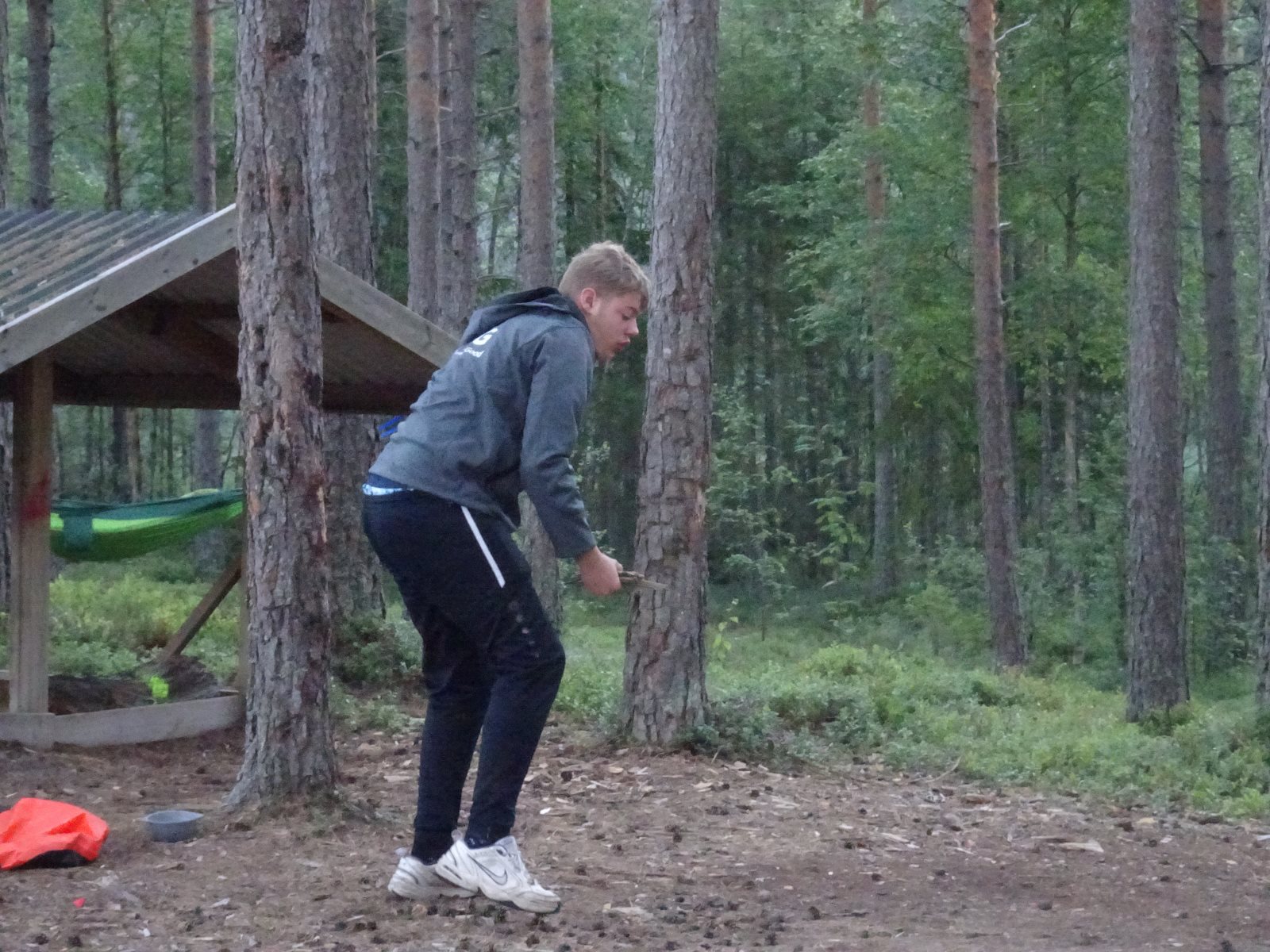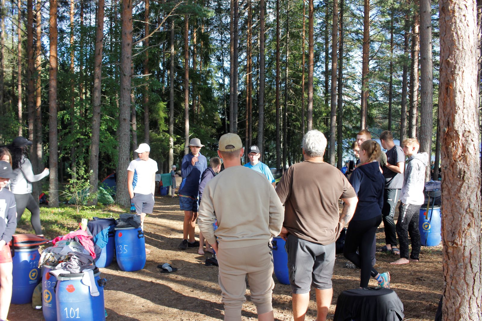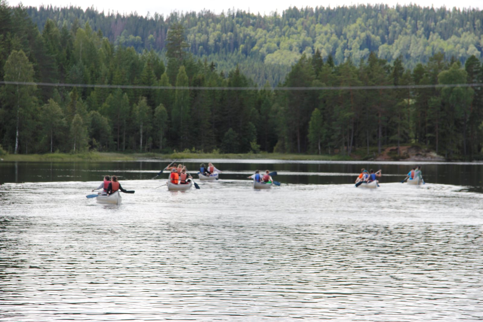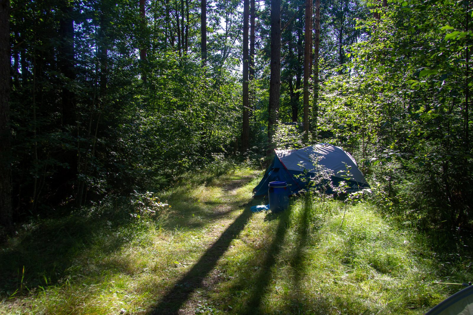 Ruhig war es am Morgen dieses Dienstages. In der Nacht hatte es noch einmal kräftig geregnet, aber es hielten alle Zelte gut durch. Dann ging es nach dem Frühstück an die Vorbereitung des ersten Kanutages. Die Tonnen mit dem Gepäck wurden gestopft (Es kamen ja jetzt wieder alle an ihr Gepäck) und dann ging es aufs Wasser. Ohne Probleme waren wir alle in die Boote gekommen. Die ersten Angeln waren schon am Vortag zum Einsatz gekommen. Nun wurden sie immer wieder ausgeworfen und leider immer auch wieder leer eingezogen. Beinahe am Tagesziel gingen zwei baden. Die Tonne erwies sich als nicht so dicht wie geplant. Aber das tolle ist, dass wir hier entlang einer alten Schmalspurbahn campen dürfen und auch den Tanzboden nutzen können, der überdacht ist. Das Biwak, das am Fluss liegt, wäre für unsere Gruppe zu klein gewesen. Aber die Leute hier sind sehr zuvorkommend. Die Zelte konnten wir noch trocken aufbauen. Nun regnet es. Morgen soll es trocken bleiben und dann sogar richtig warm werden. Wir werden sehen. Nun sitzen einige zusammen unter Dach und einige haben sich an den Biwakfeuerplatz zurückgezogen. Nach einem Rundgang werde ich mich früher als gestern in die Horizontale begeben. Es war trotz dem Wetter ein lustiger und interessanter Tag.