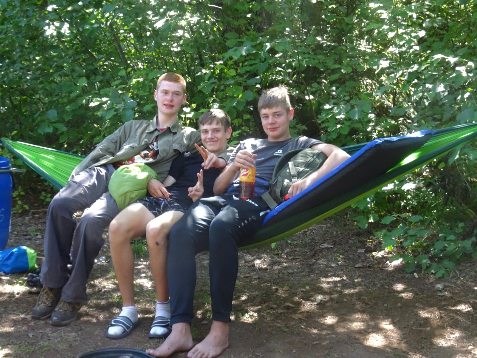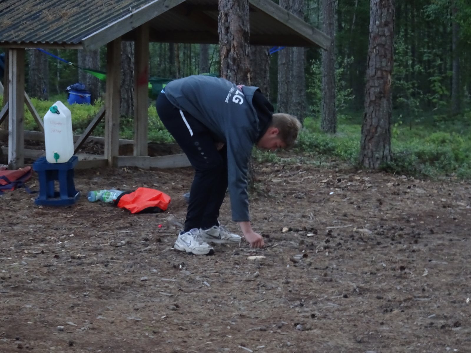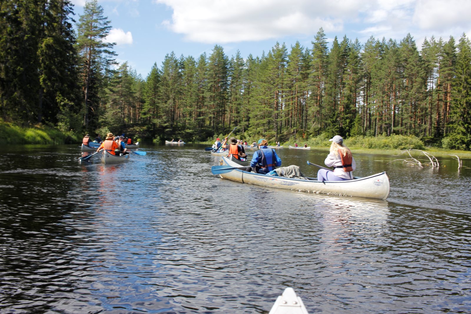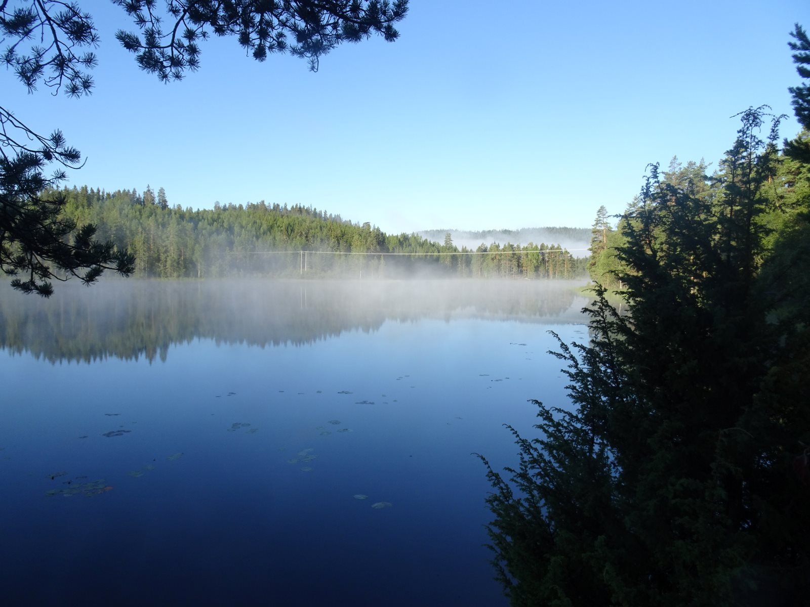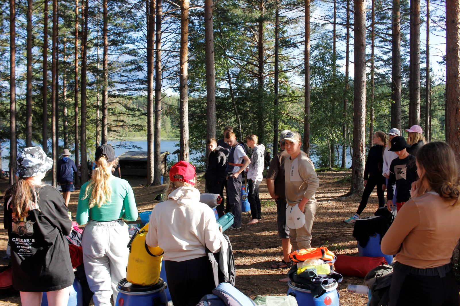 Ruhig war es am Morgen dieses Dienstages. In der Nacht hatte es noch einmal kräftig geregnet, aber es hielten alle Zelte gut durch. Dann ging es nach dem Frühstück an die Vorbereitung des ersten Kanutages. Die Tonnen mit dem Gepäck wurden gestopft (Es kamen ja jetzt wieder alle an ihr Gepäck) und dann ging es aufs Wasser. Ohne Probleme waren wir alle in die Boote gekommen. Die ersten Angeln waren schon am Vortag zum Einsatz gekommen. Nun wurden sie immer wieder ausgeworfen und leider immer auch wieder leer eingezogen. Beinahe am Tagesziel gingen zwei baden. Die Tonne erwies sich als nicht so dicht wie geplant. Aber das tolle ist, dass wir hier entlang einer alten Schmalspurbahn campen dürfen und auch den Tanzboden nutzen können, der überdacht ist. Das Biwak, das am Fluss liegt, wäre für unsere Gruppe zu klein gewesen. Aber die Leute hier sind sehr zuvorkommend. Die Zelte konnten wir noch trocken aufbauen. Nun regnet es. Morgen soll es trocken bleiben und dann sogar richtig warm werden. Wir werden sehen. Nun sitzen einige zusammen unter Dach und einige haben sich an den Biwakfeuerplatz zurückgezogen. Nach einem Rundgang werde ich mich früher als gestern in die Horizontale begeben. Es war trotz dem Wetter ein lustiger und interessanter Tag.