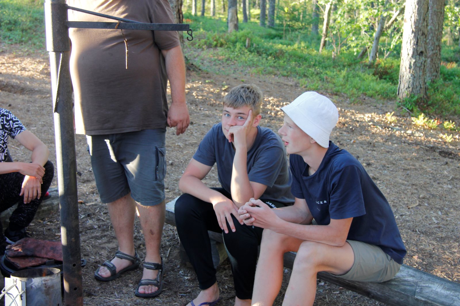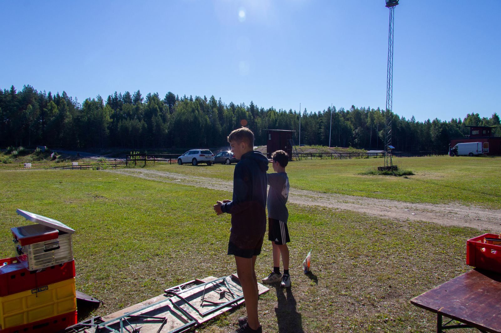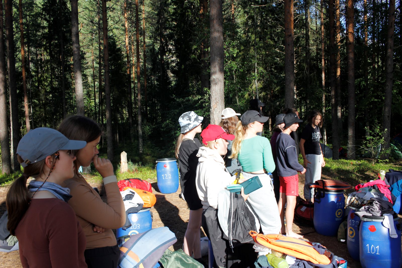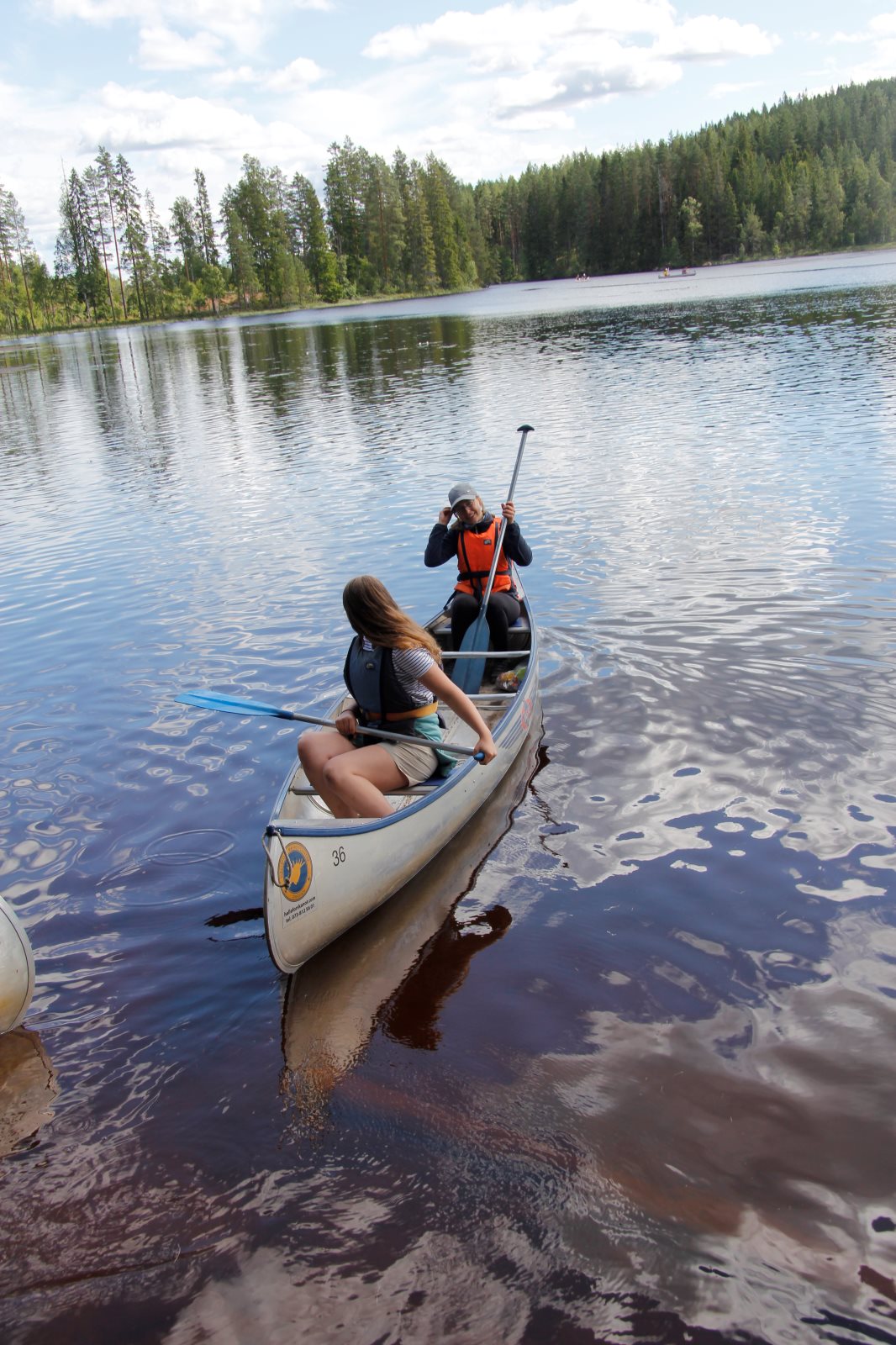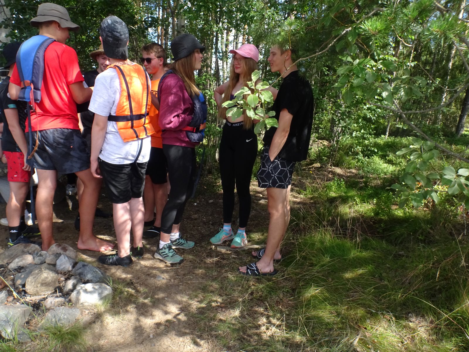 Ruhig war es am Morgen dieses Dienstages. In der Nacht hatte es noch einmal kräftig geregnet, aber es hielten alle Zelte gut durch. Dann ging es nach dem Frühstück an die Vorbereitung des ersten Kanutages. Die Tonnen mit dem Gepäck wurden gestopft (Es kamen ja jetzt wieder alle an ihr Gepäck) und dann ging es aufs Wasser. Ohne Probleme waren wir alle in die Boote gekommen. Die ersten Angeln waren schon am Vortag zum Einsatz gekommen. Nun wurden sie immer wieder ausgeworfen und leider immer auch wieder leer eingezogen. Beinahe am Tagesziel gingen zwei baden. Die Tonne erwies sich als nicht so dicht wie geplant. Aber das tolle ist, dass wir hier entlang einer alten Schmalspurbahn campen dürfen und auch den Tanzboden nutzen können, der überdacht ist. Das Biwak, das am Fluss liegt, wäre für unsere Gruppe zu klein gewesen. Aber die Leute hier sind sehr zuvorkommend. Die Zelte konnten wir noch trocken aufbauen. Nun regnet es. Morgen soll es trocken bleiben und dann sogar richtig warm werden. Wir werden sehen. Nun sitzen einige zusammen unter Dach und einige haben sich an den Biwakfeuerplatz zurückgezogen. Nach einem Rundgang werde ich mich früher als gestern in die Horizontale begeben. Es war trotz dem Wetter ein lustiger und interessanter Tag.