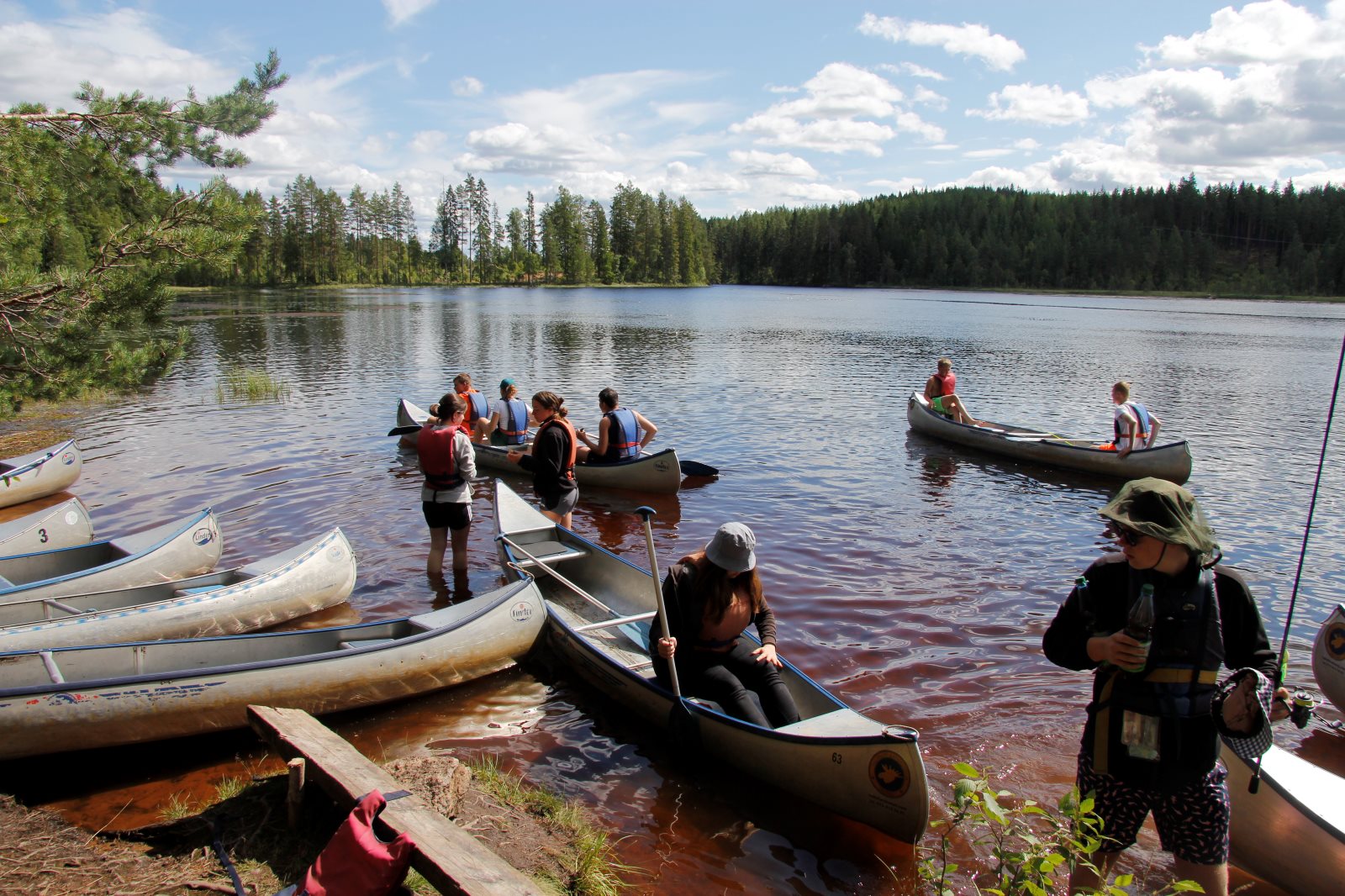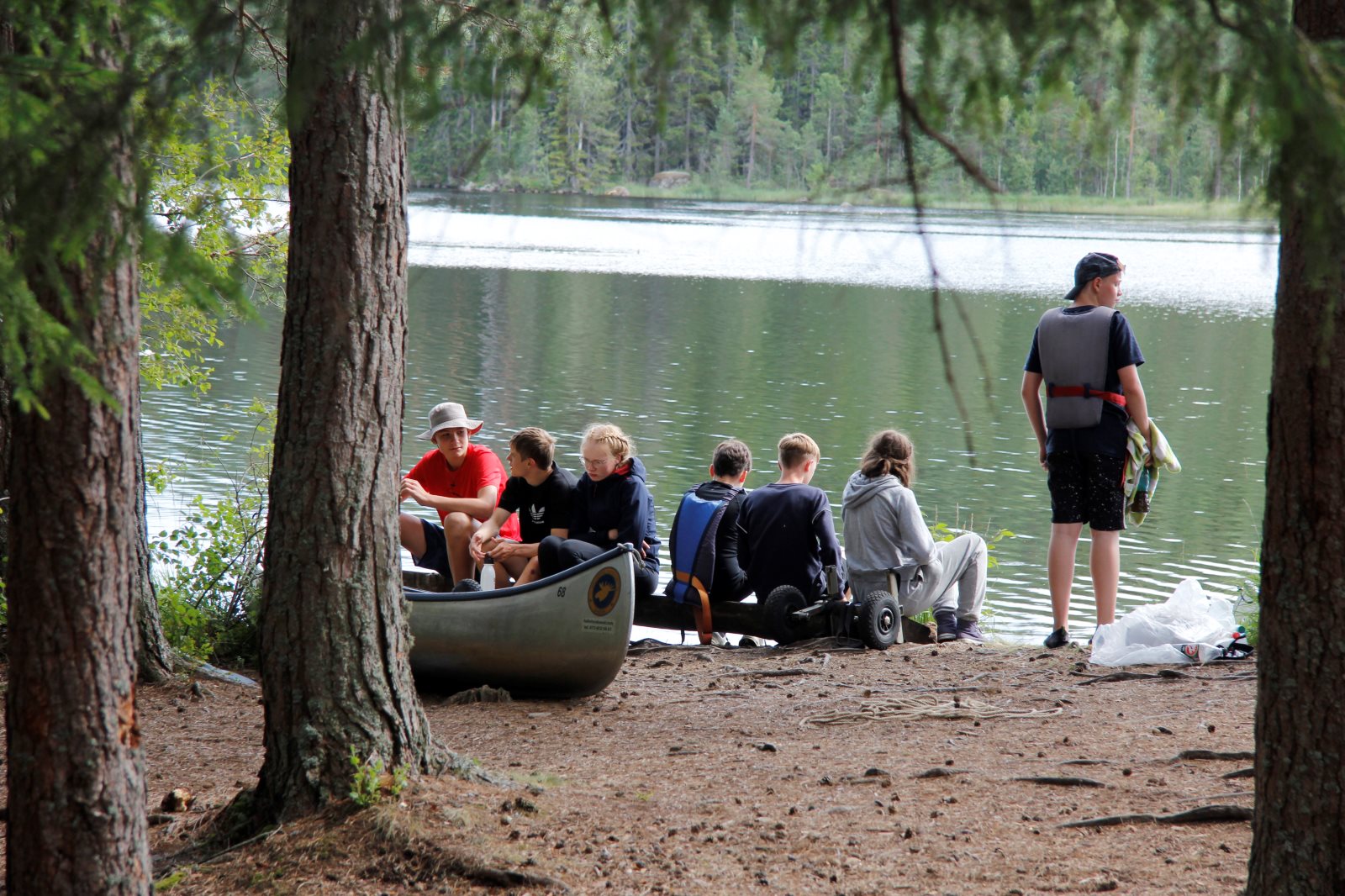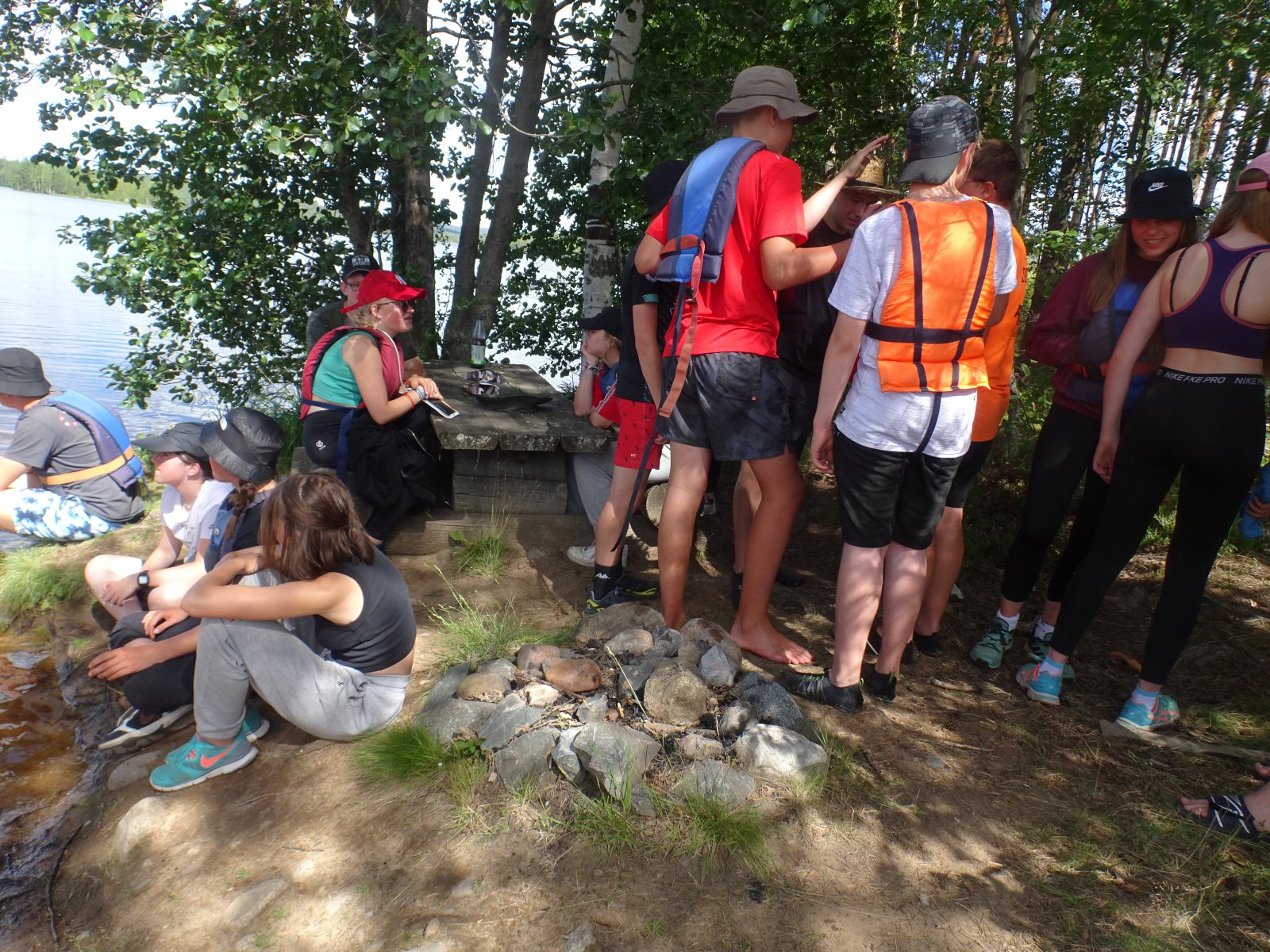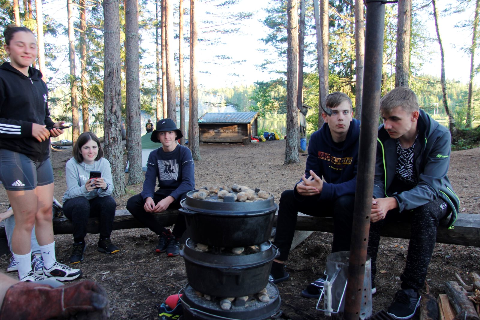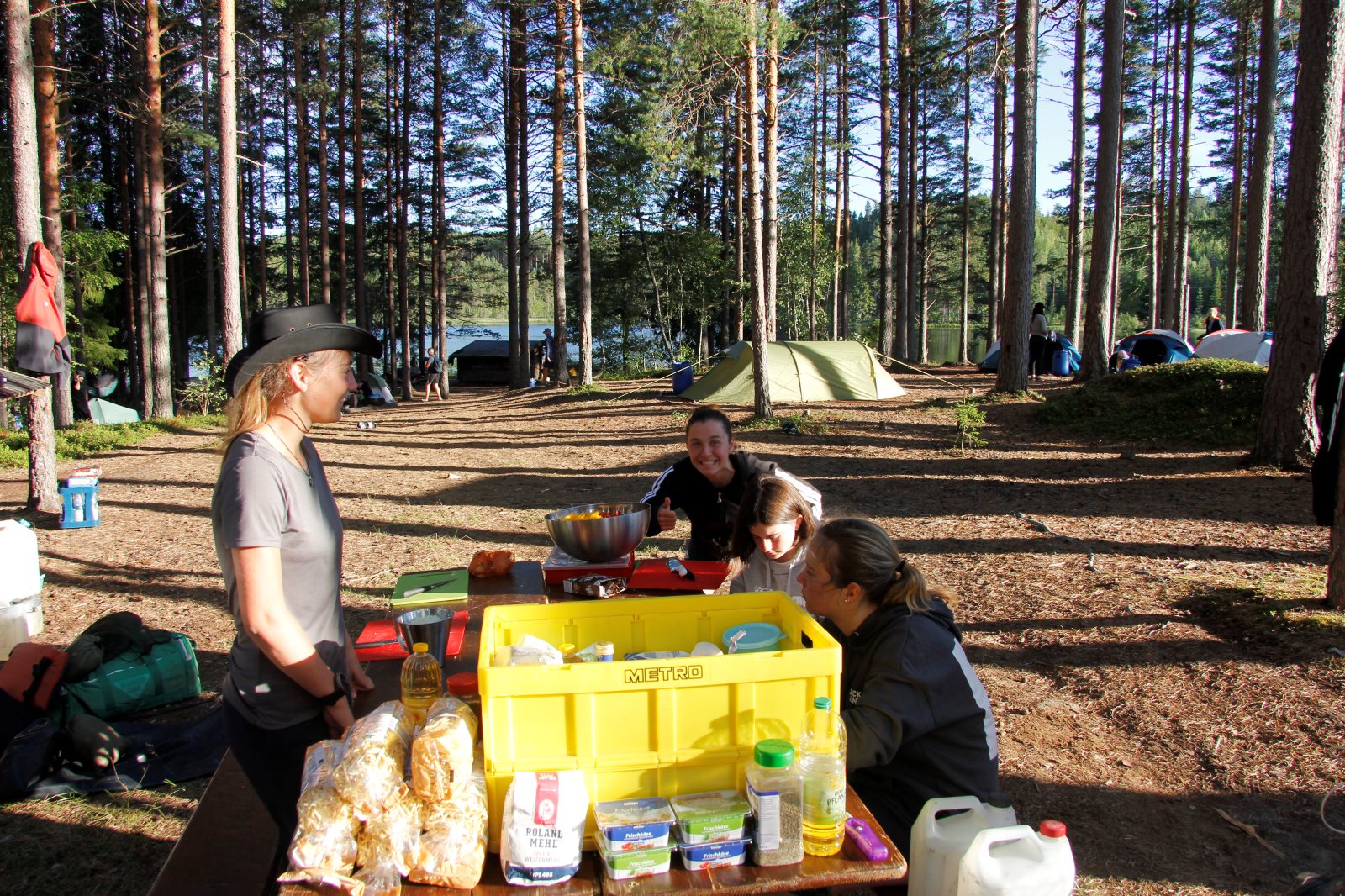 Nach den Anstrengungen des vergangenen Tages wurden alle erst später munter. Es war ja klar, dass wir auf diesem Platz zwei Nächte bleiben. Also nutzten wir die Zeit zum Ausschlafen und holten die bislang nicht durchgeführte Namensrunde nach. Nach einem ausführlichen Frühstück ging ein Teil der Gruppe auf den See um zu Paddeln und / oder zu Angeln. Ein anderer Teil blieb im Lager und spaltete z.B. Holz für das Feuer. Zum Abend hin wurde wieder gekocht und zwar zauberte Frank ein leckeres Couscous mit Wurstgulasch. Äpfel gab es zum Nachtisch. Morgenwird es dann wieder aufs Wasser gehen, auf dem ein paar Anglerjetzt noch sind (Petri Heil). Es ist die vorletzte Tour mit einer langen Umtrage, die dem Begriff „Kanuwandern“ einen ganz neuen Klang geben. Ein paar Leute sitzen noch am Feuer und Frank bereitet noch die „Bud Spencer Gedächtnis Bohnen“ für morgen vor.