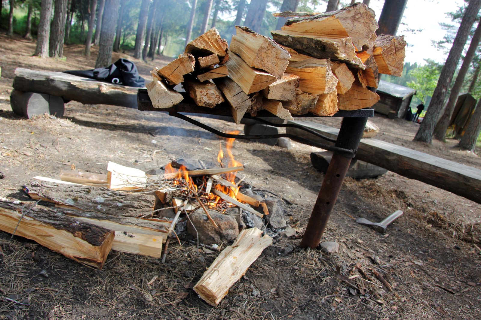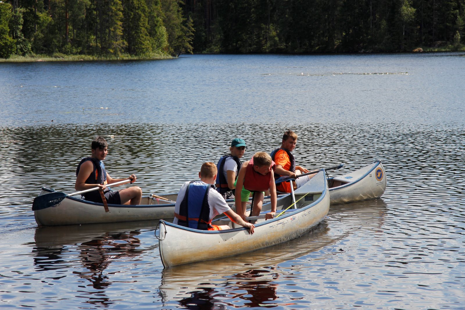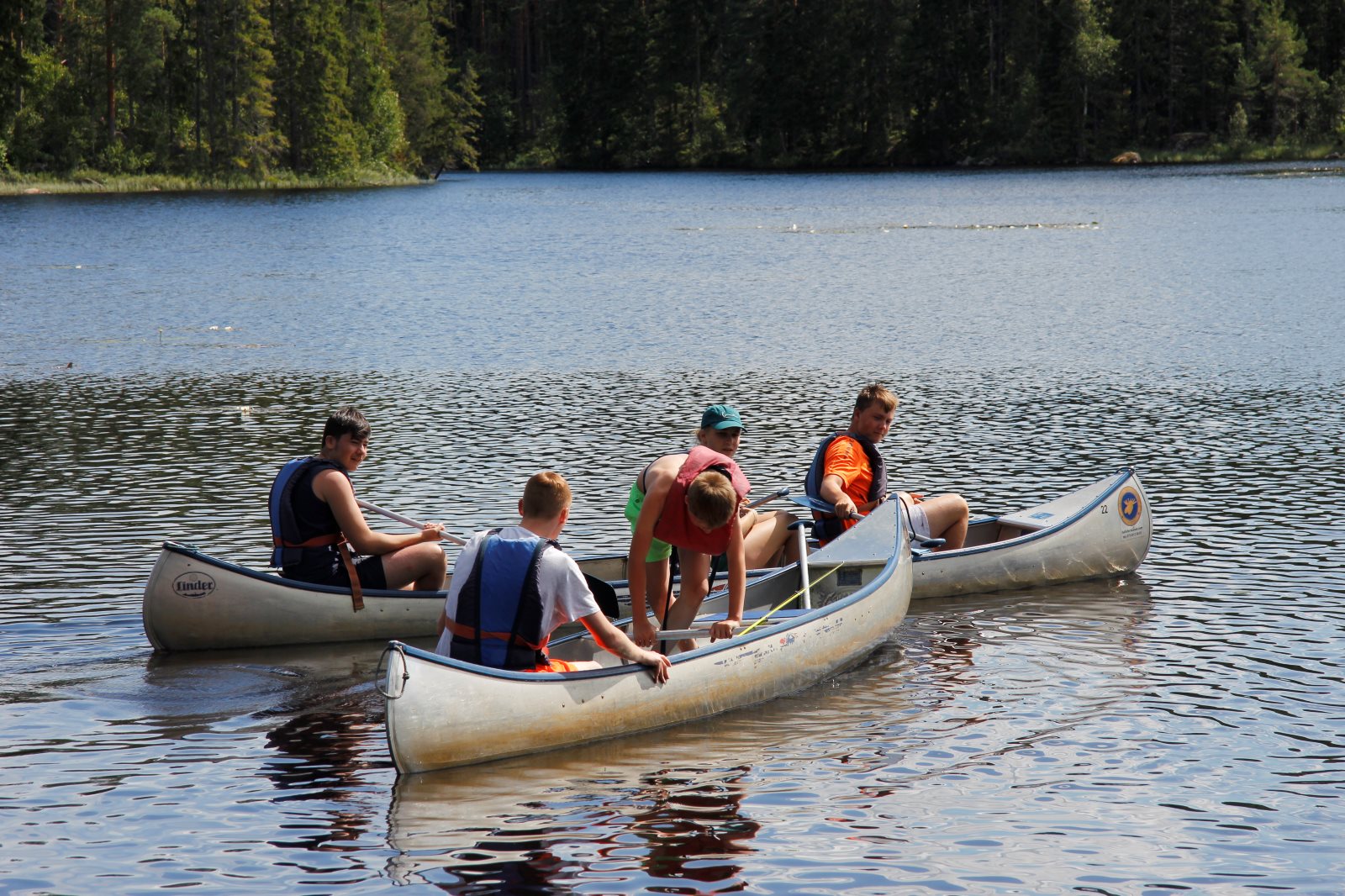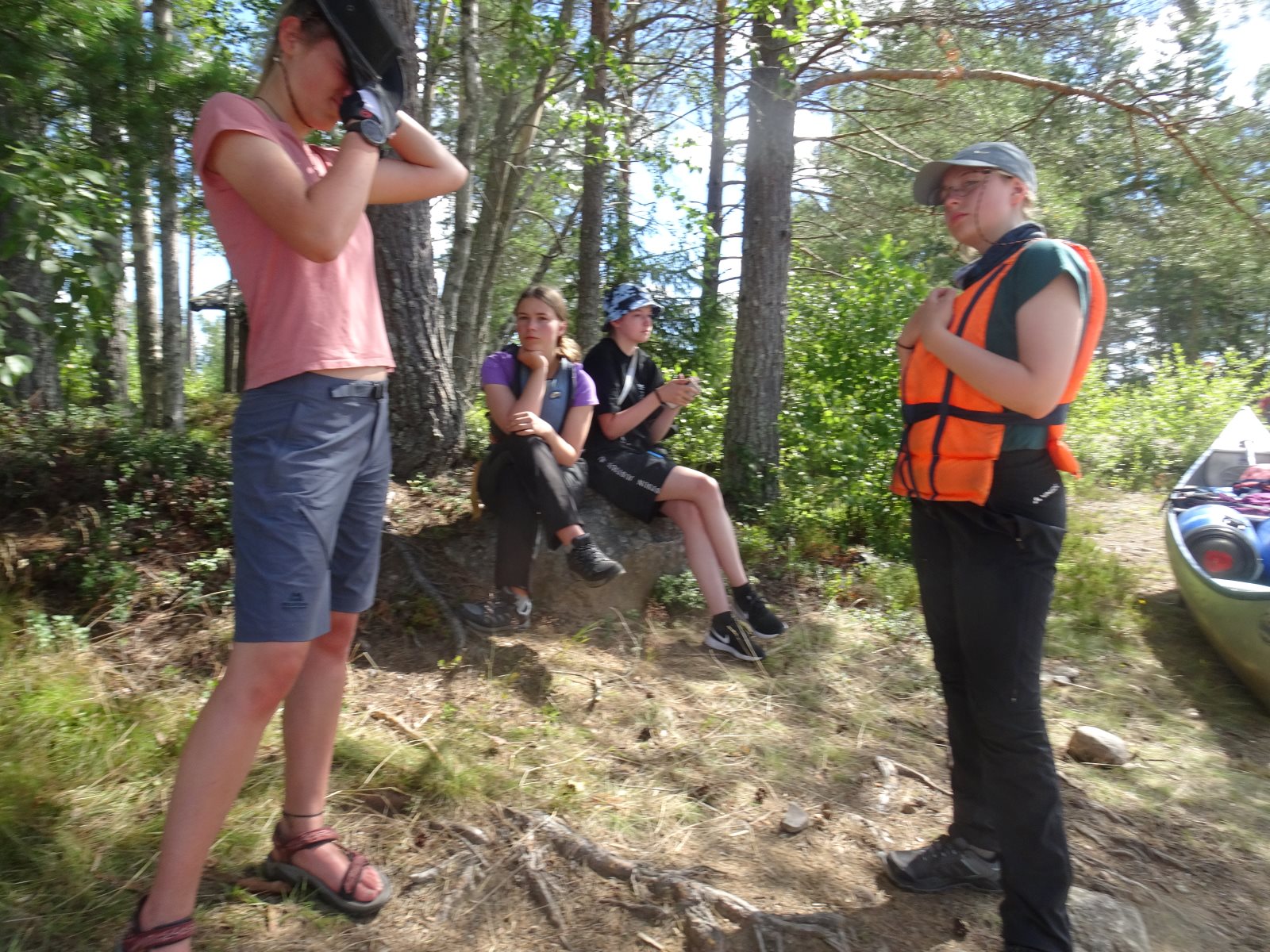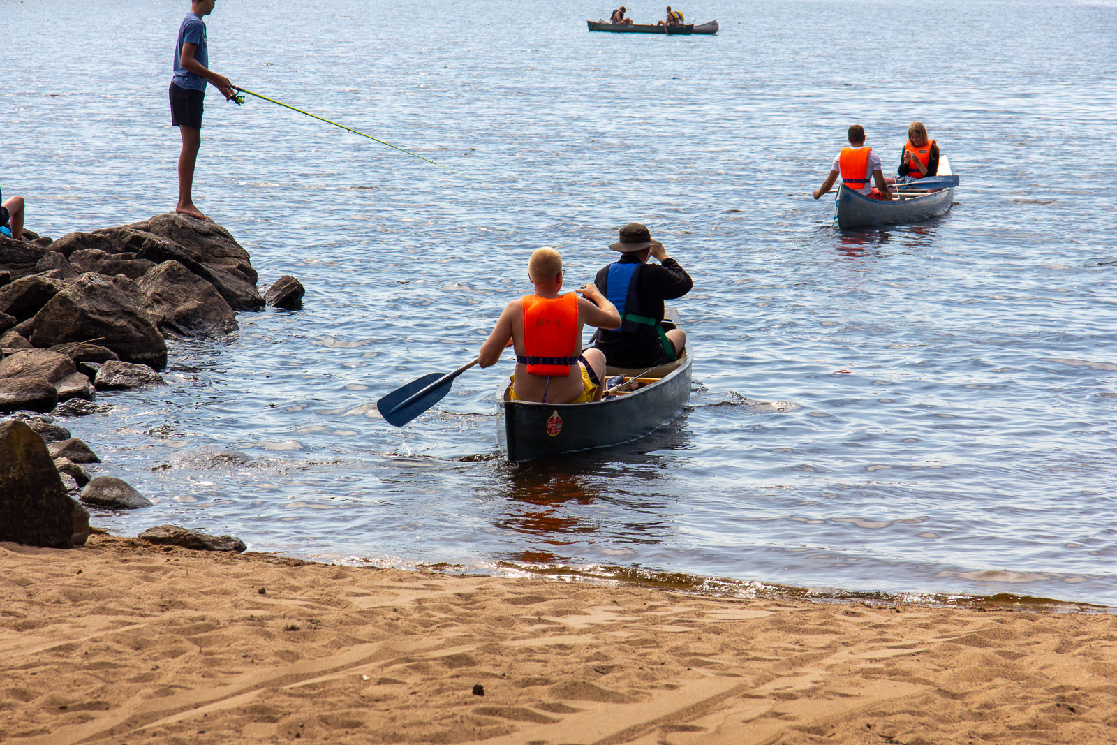 Nach den Anstrengungen des vergangenen Tages wurden alle erst später munter. Es war ja klar, dass wir auf diesem Platz zwei Nächte bleiben. Also nutzten wir die Zeit zum Ausschlafen und holten die bislang nicht durchgeführte Namensrunde nach. Nach einem ausführlichen Frühstück ging ein Teil der Gruppe auf den See um zu Paddeln und / oder zu Angeln. Ein anderer Teil blieb im Lager und spaltete z.B. Holz für das Feuer. Zum Abend hin wurde wieder gekocht und zwar zauberte Frank ein leckeres Couscous mit Wurstgulasch. Äpfel gab es zum Nachtisch. Morgenwird es dann wieder aufs Wasser gehen, auf dem ein paar Anglerjetzt noch sind (Petri Heil). Es ist die vorletzte Tour mit einer langen Umtrage, die dem Begriff „Kanuwandern“ einen ganz neuen Klang geben. Ein paar Leute sitzen noch am Feuer und Frank bereitet noch die „Bud Spencer Gedächtnis Bohnen“ für morgen vor.