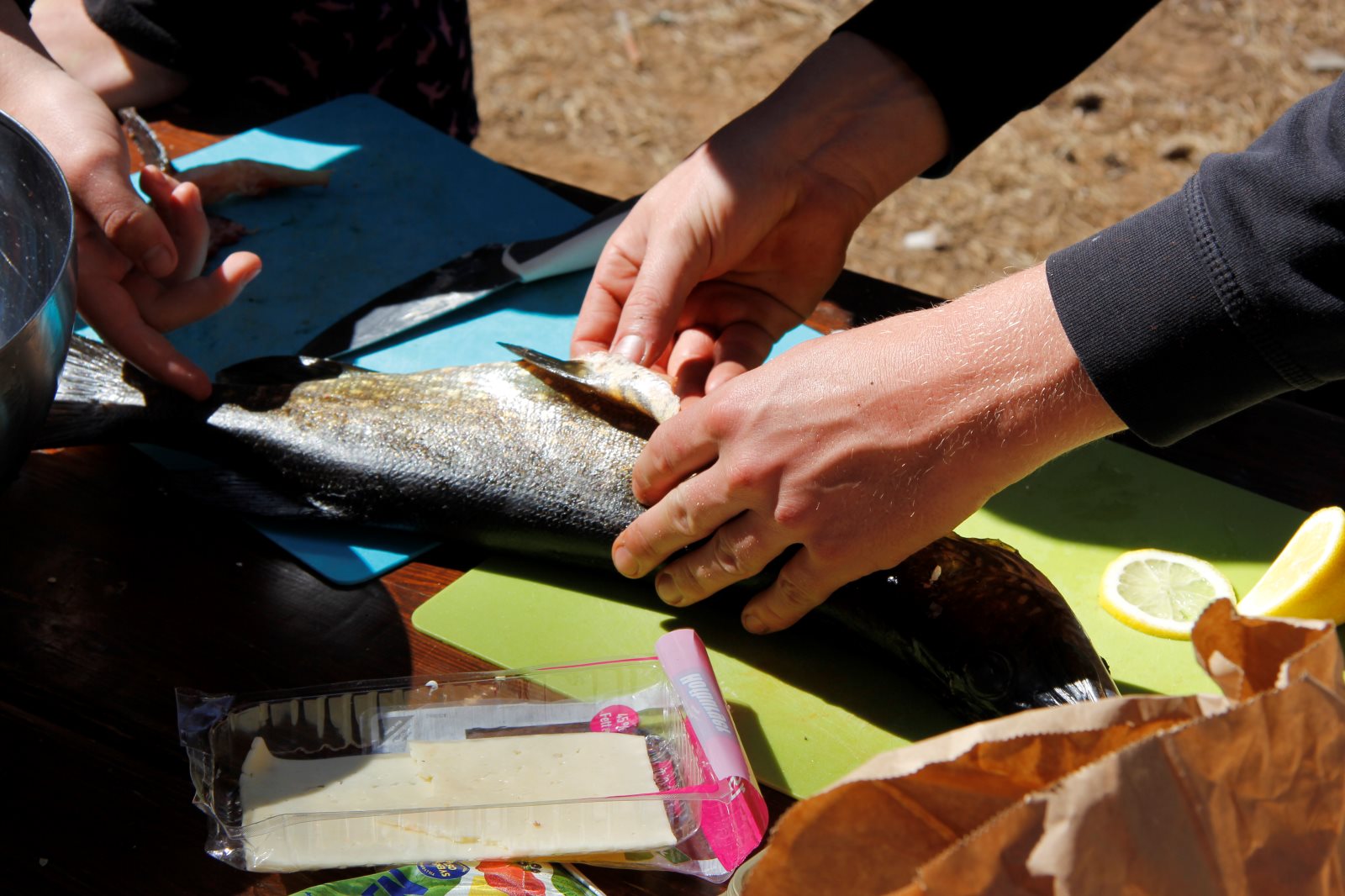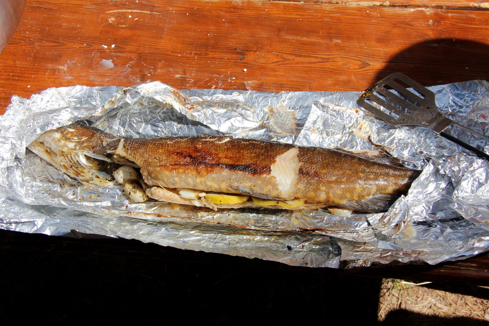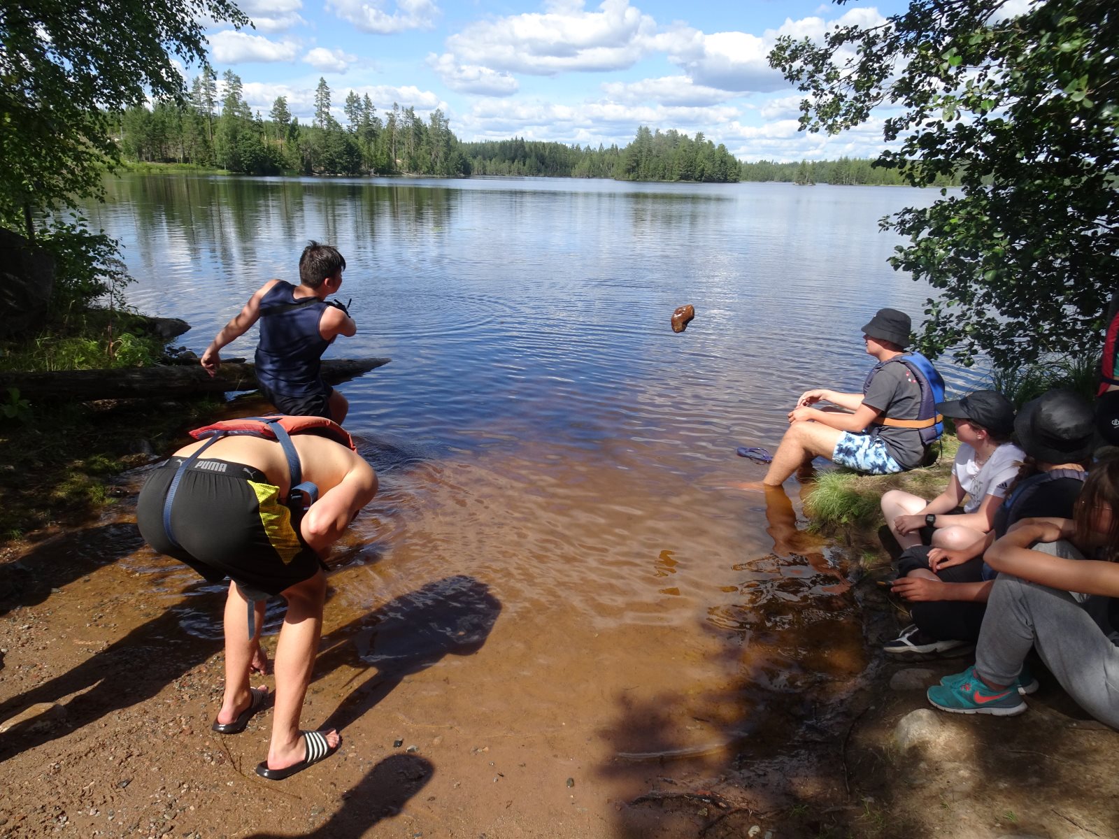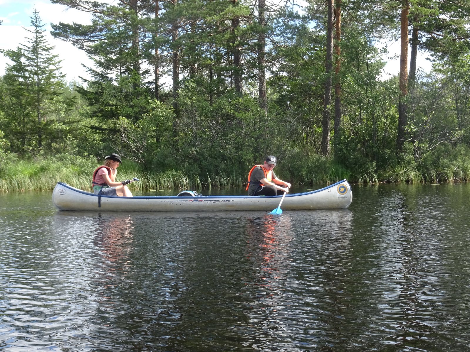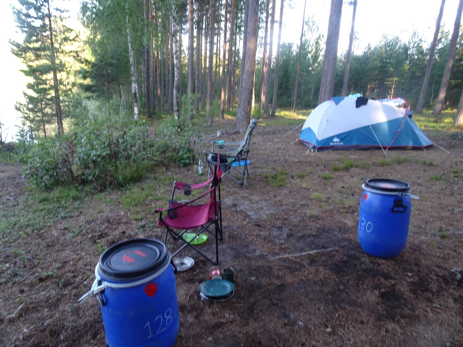 Früh morgens war sie zu sehen, die Sonne. Und sie blieb uns bis Abends erhalten. Aber kein Tag ohne einen neuen Rekord! Der erste war das Problem mit dem Auto am ersten Abend. Dann das Kentern am zweiten Tag und die Feststellung, dass am zweiten Frühstück noch keine Nutella offen war, dafür aber sechs Kilo Tortelini vertilgt wurde (reicht üblicher weise für 50 Personen). Heute kam das zweite Kentern hinzu. Und es ist der zweite Tag auf dem Wasser ohne einen Fischfang. (Obwohl die Angel häufig im Wasser waren.) Das Paddeln verlief gut ansonsten gut. Tim ist allerdings erkrankt, hoffen wir das Beste. Gut, dass wir morgen sowieso erst einmal hier bleiben wollten. Auf unserem Biwak ist auch eine Gruppe aus Berlin.