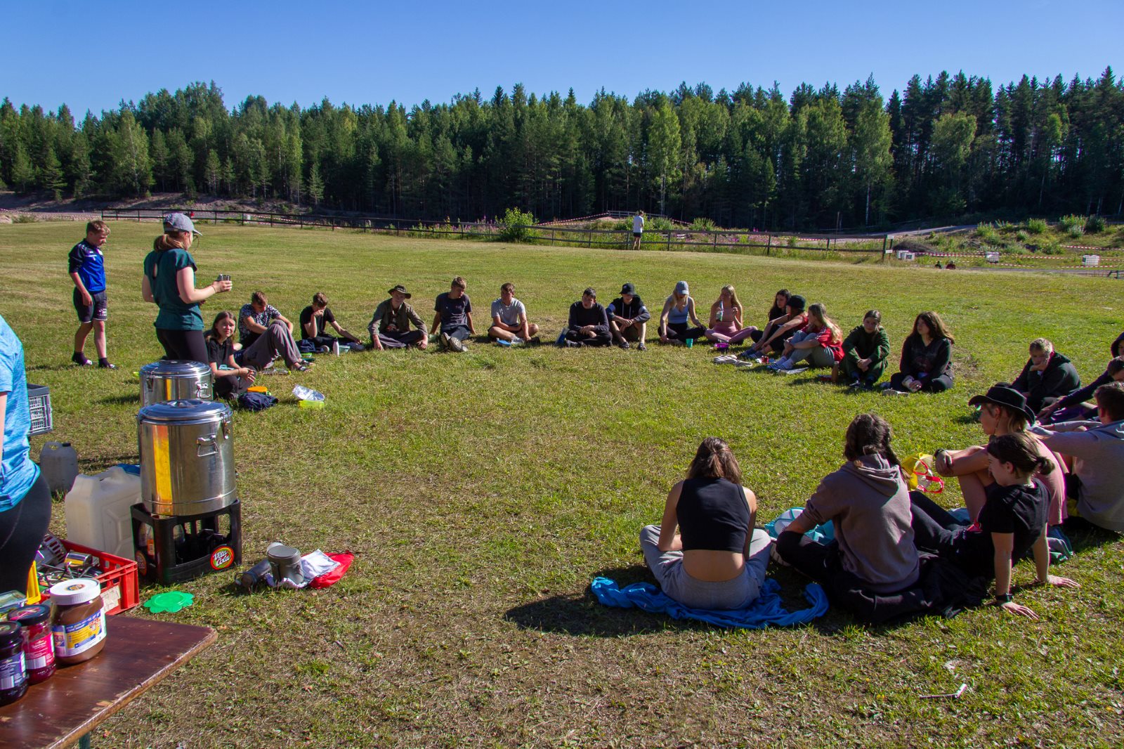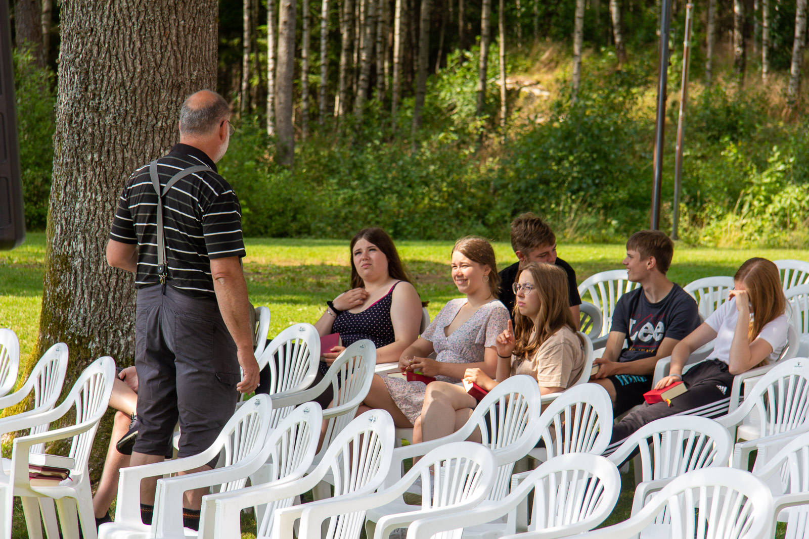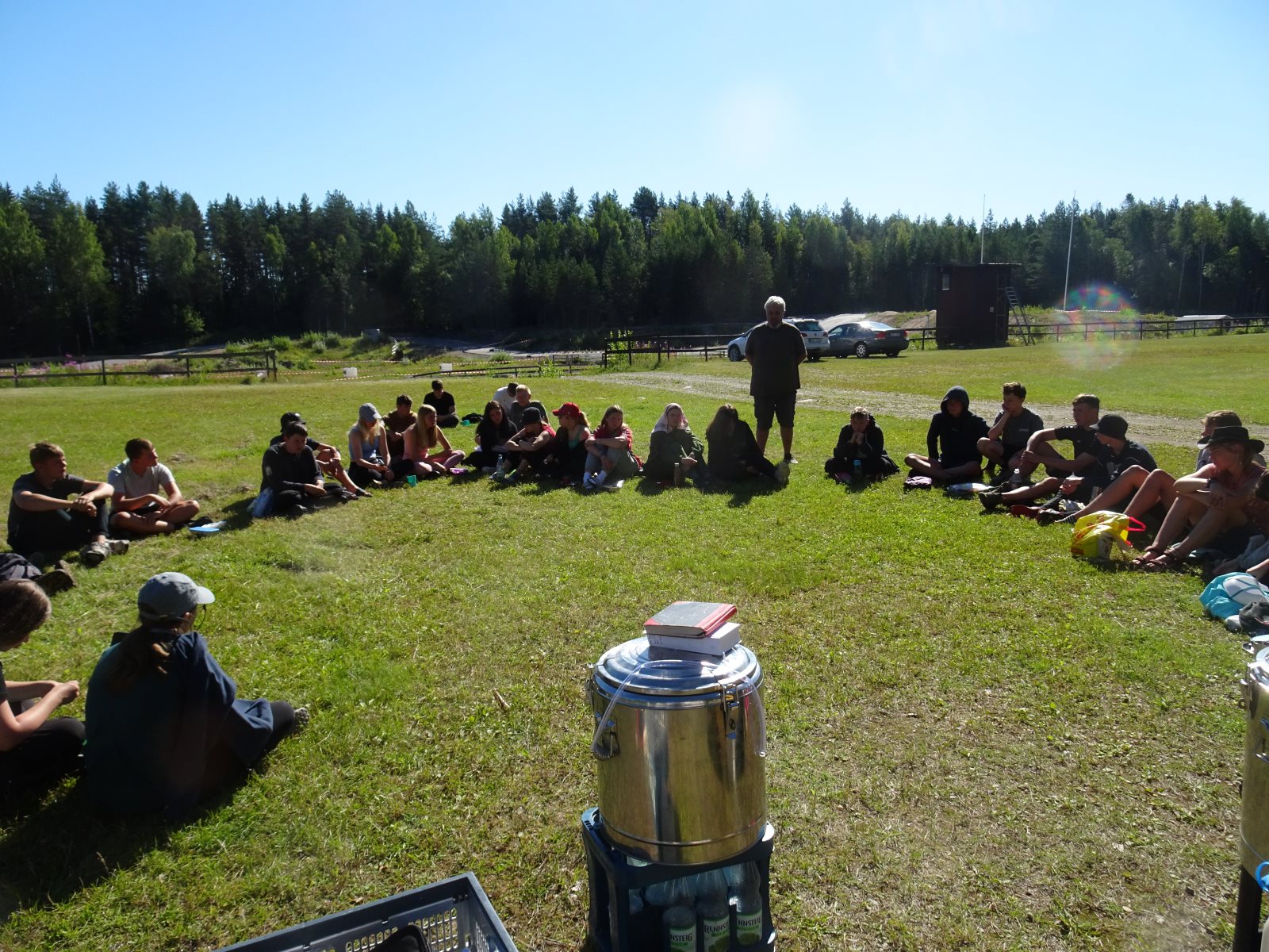 Sonntagmorgen es ist ruhig. Bis auf den Rasenmäher vom Nachbarn und das Auto, das mit Frank und Erwin vom Hof fährt, um einzukaufen. Die Lebensmittelläden haben auch am Sonntag geöffnet. Das Frühstück verdient nicht so richtig seinen Namen. Es ist schon 10.30 Uhr bis es losgeht. Aber alle sind zufrieden, ging es doch die Nacht davor erst um zwei ins Bett. Um ein Uhr Mittag kamen dann die Frauen der Gemeinde, die das Kaffeetrinken nach dem Gottesdienst vorbereiteten. Die Stühle im Garten wurden mit unserer Hilfe schnell hingestellt. Dafür wurden wir auch zum Kaffee und dem Kaka (Kakaokuchen) eingeladen. Der Einladung zum Gottesdienst kamen auch einige unserer Gruppe nach. Die anderen waren auf und im See unterwegs. Das ein oder andere konnte man im Gottesdienst erkennen. Und die Lieder kamen uns zum Teil auch bekannt vor. Es war ein interessantes Erlebnis. Nach dem Kaffee wurden noch geangelt und nichts gefangen, das Lagerfeuerholz gesammelt und einfach „geknafft“. Das Abendessen, es gab Hähnchengeschnetzeltes, Reis und Salat, wurde von…nein nicht Frank, der war auf dem See um nichts zu fangen…von Erwin und dem Tischdienst zubereitet. Es war für Frank sehr ungewohnt. Auch ich wurde der Küche verwiesen. Geschmeckt hat es auf alle Fälle und es wurde wieder alles gegessen (Es waren 45 Portionen zubereitet.) Nun sind einige noch am See oder dem Feuer und haben ihren Spaß, dem hat auch das verlorene Spiel der deutschen Frauen in der EM keinen Abbruch getan. Insgesamt wird es schon ruhiger, wenn auch bis dahin, dass alle ihr Bettaufsuchen noch etwas Zeit ins Land gehen wird.