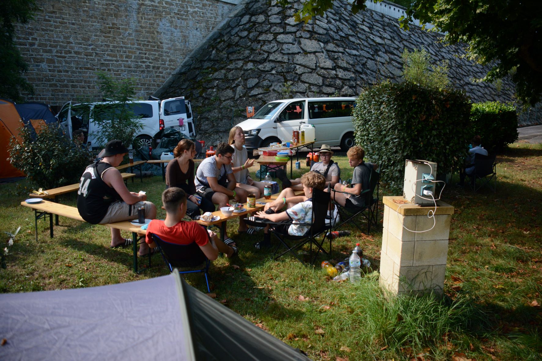 Auf der Fahrt zurück zum Zeltplatz wurde noch das Fleisch für den Rotweinschmortopf Mont Ventoux eingekauft. Während das Essen garte, war bei einigen Schwimmbad und bei den anderen ein Spaziergang zur Burg angesagt. Mit dem Essen klang auch dieser Tag mit Fußball, Volleyball und Kartenspielen aus.