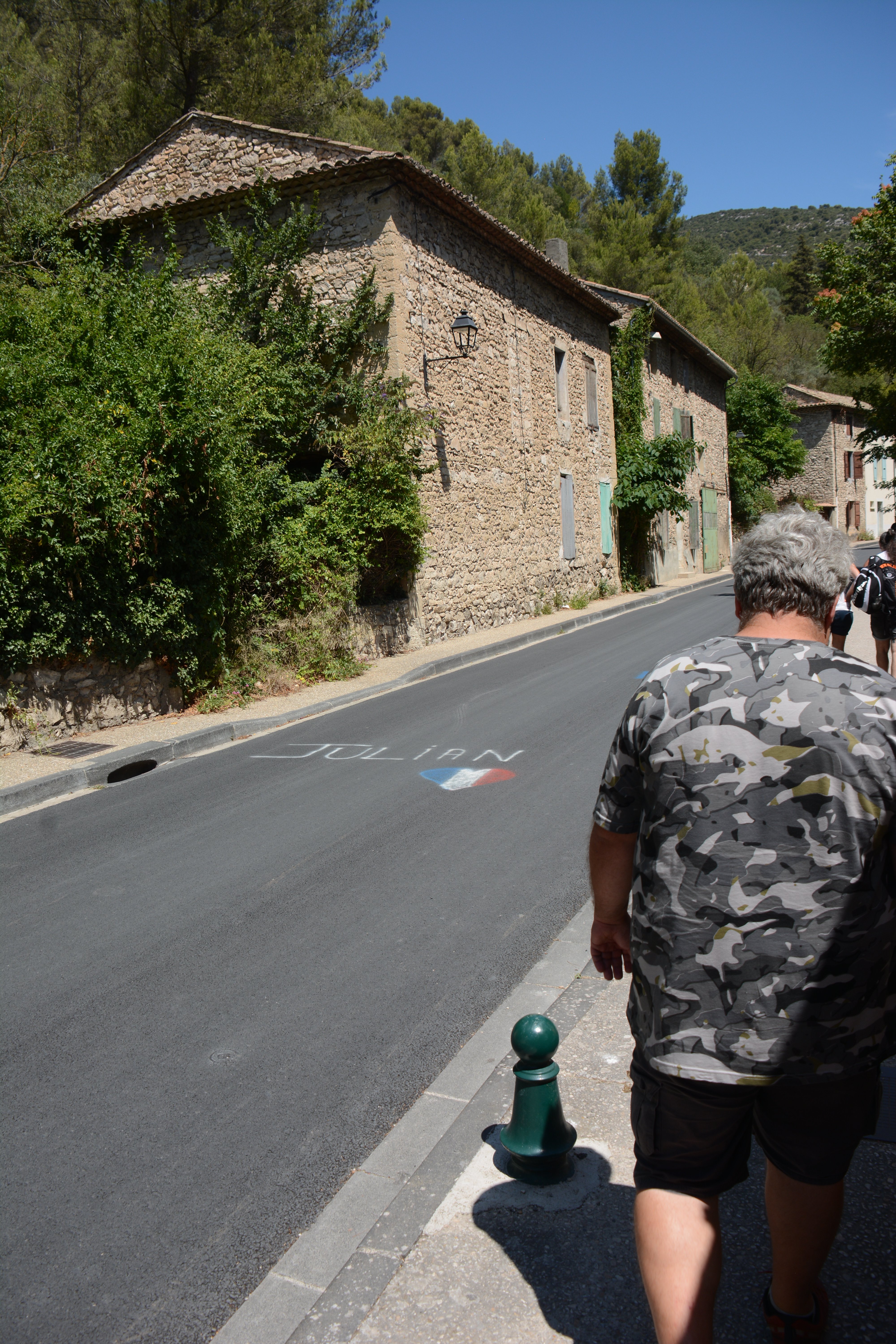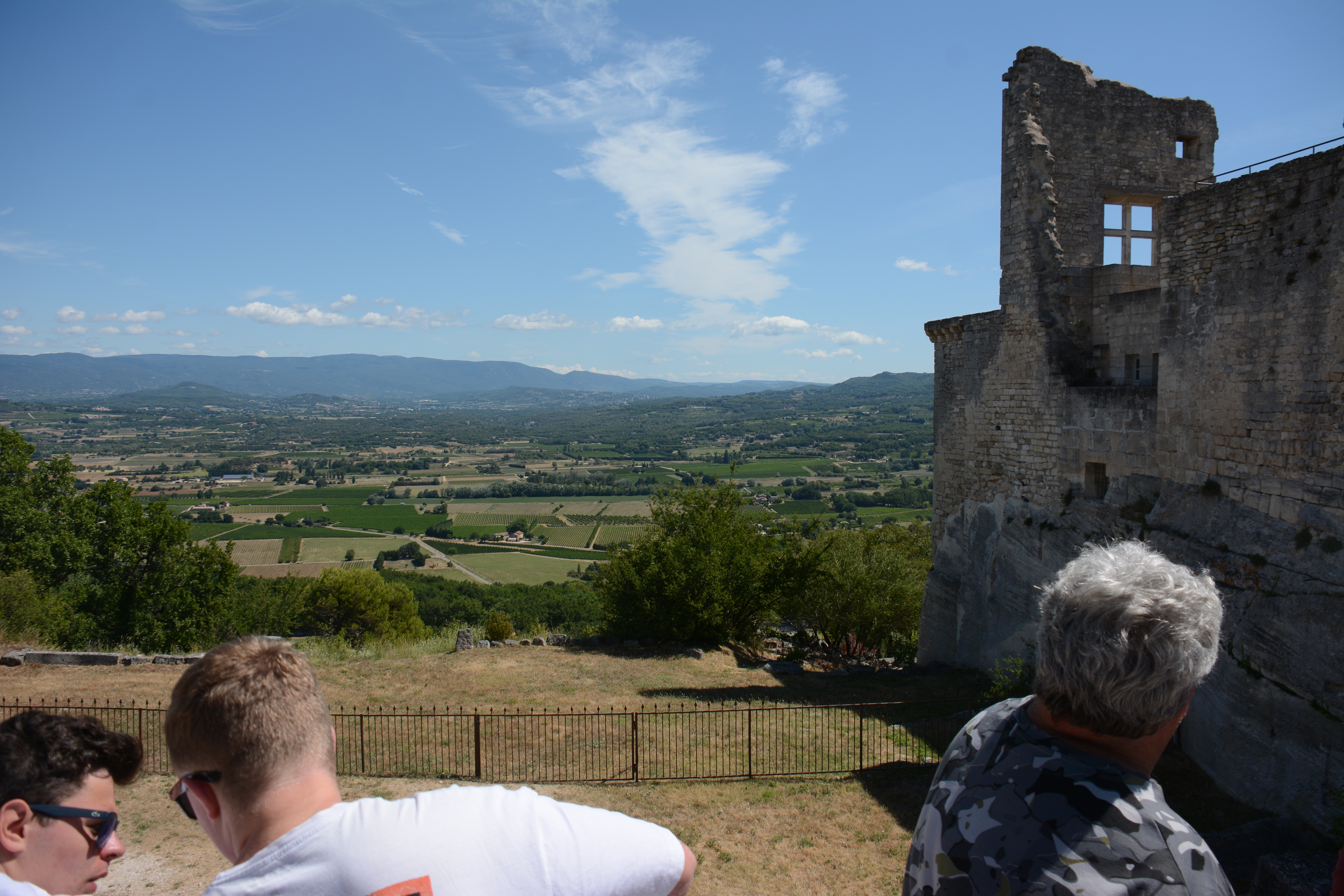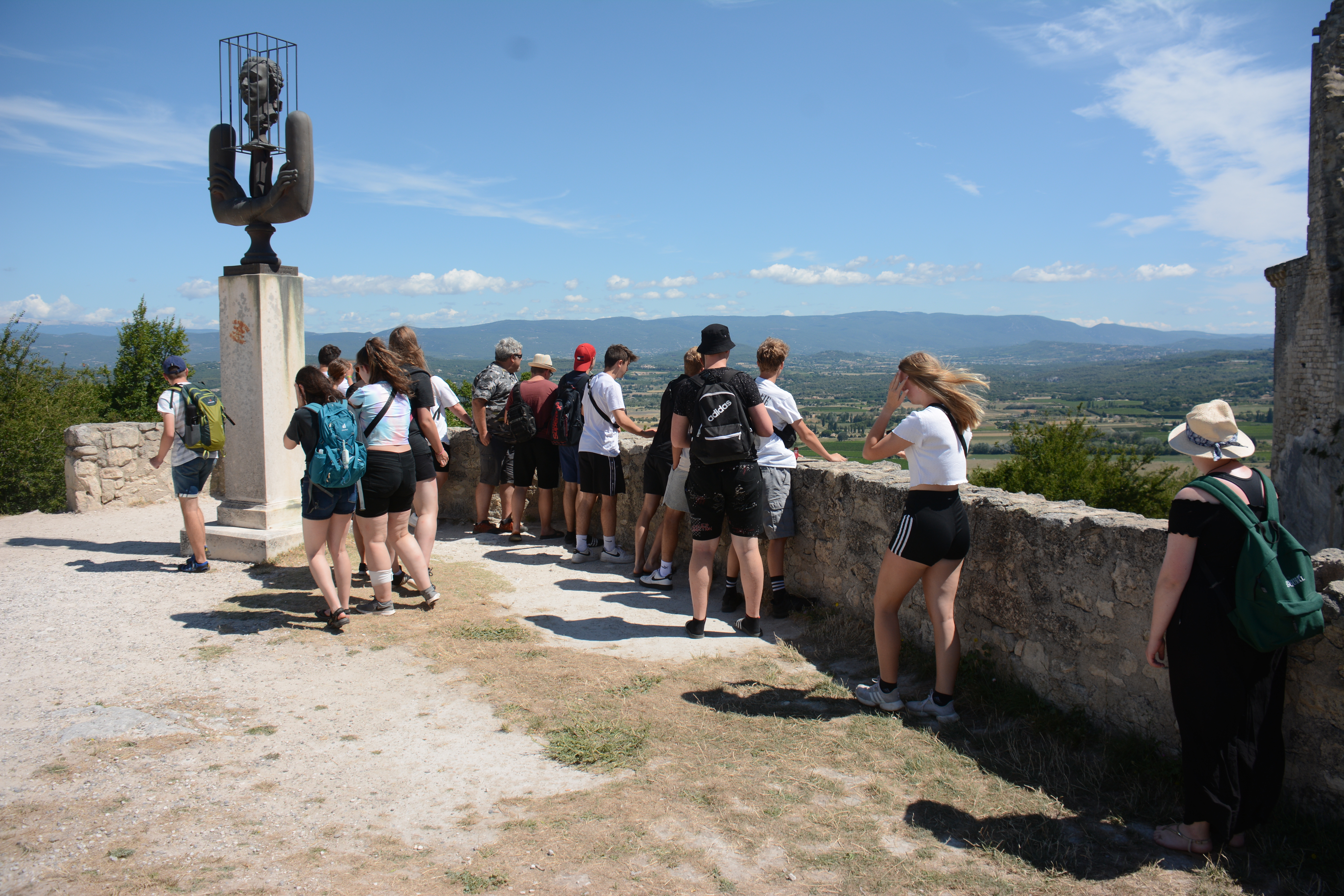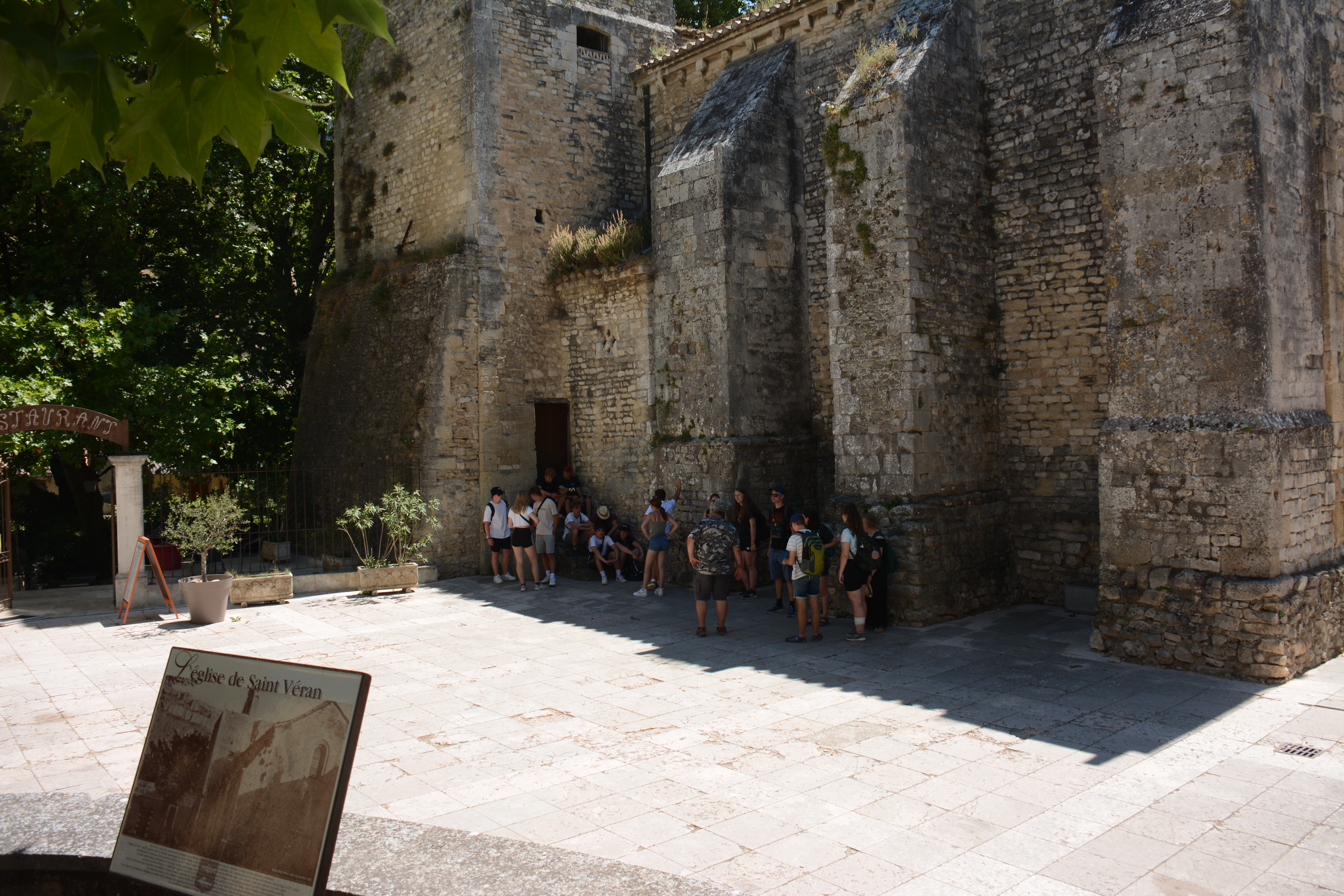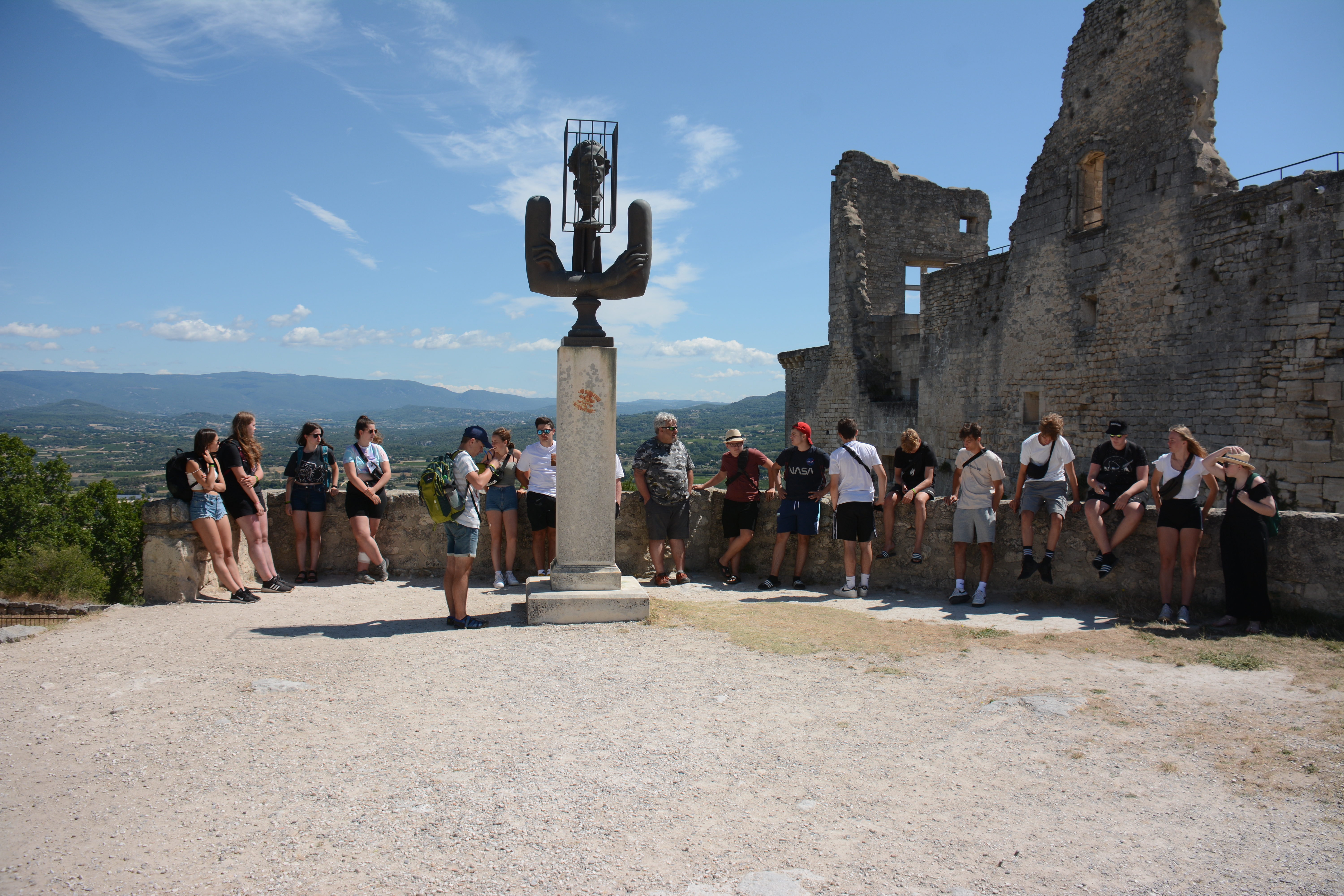 Heute Morgen konnten die Jugendlichen entscheiden, ob es zu dem Ort Les Baux geht, übrigens der Namensgeber für Bauxit, und dort einzutauchen in die Geschichte auch der Hugenotten, oder ob wir lieber einen Einblick in die Dörfchen der Provence nehmen wollen. Das Ergebnis war, dass wir nach Lacoste fuhren dem Stammsitz von Marquis de Sade. Dieser Marquis ist, wie von Frank zu erfahren war, der mehr seiner 74 Jahren in Gefängnissen und Irrenanstalten verbrachte als draußen. Nach ihm wurde auch der Sadismus benannt. In Lacoste kann man deutlich sehen, wie der Herrscher über dem „Gesinde“ residierte. Das Interesse an dem Örtchen war in der Gruppe unterschiedlich stark 😉