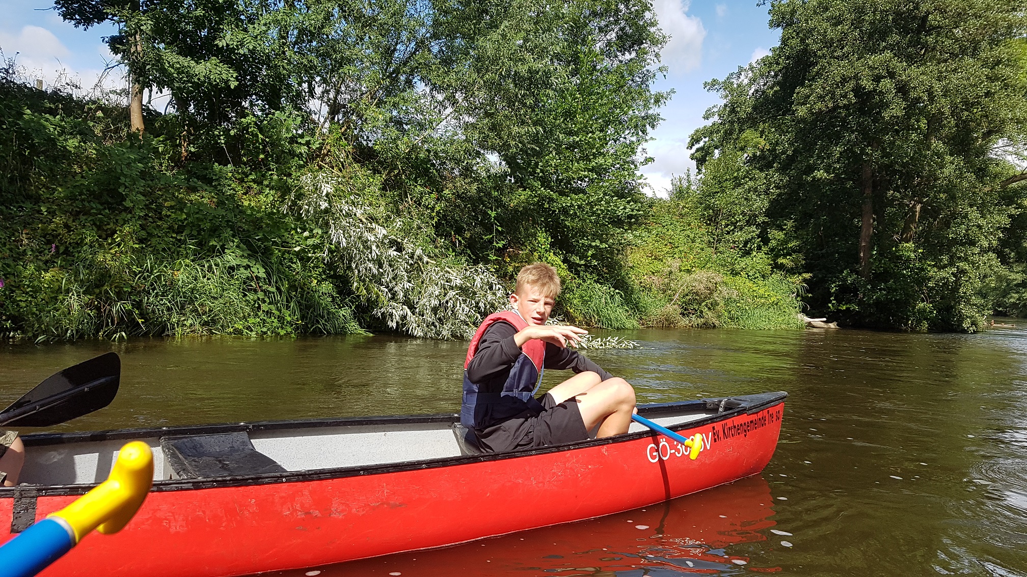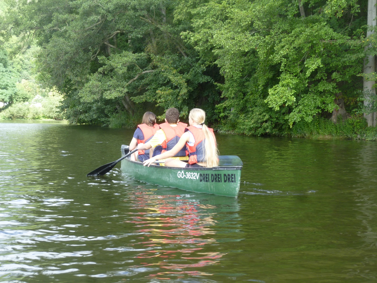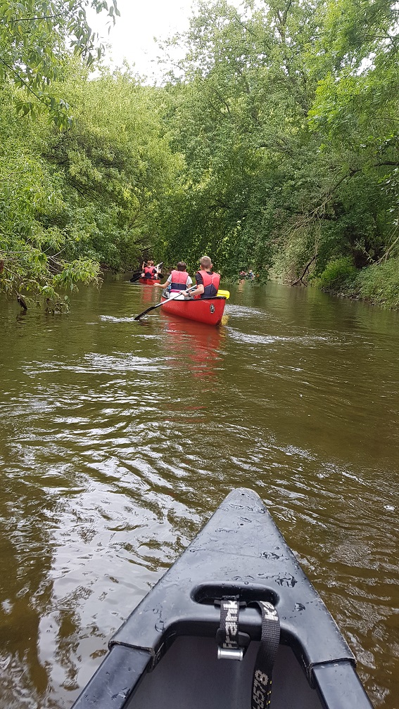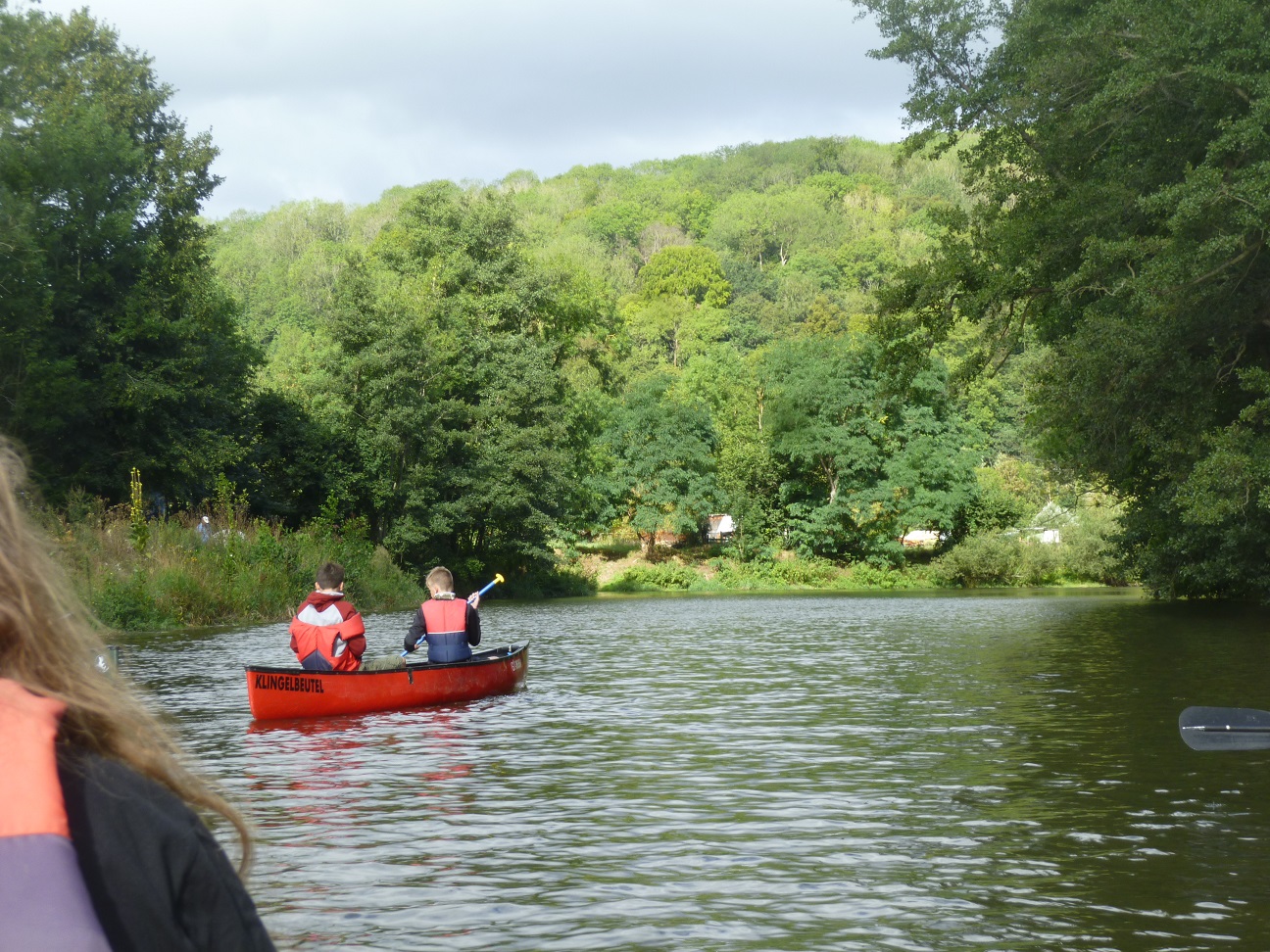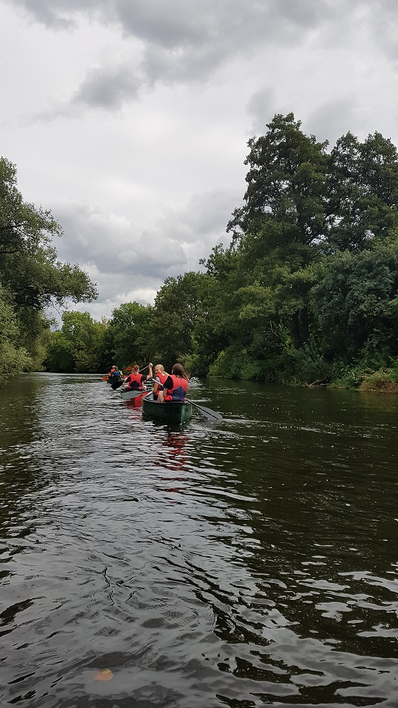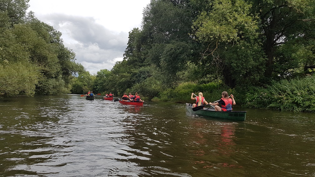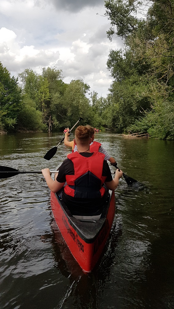 Nach fachmännischer Einweisung von Joni, einem unserer Freizeit-Teamer, paddelte unsere Gruppe in Zweier- und Dreierkanus munter und abenteuerlustig los. Einige hatten bereits Vorerfahrungen hierin, andere erprobten ihre neu gesammelten Kenntnisse direkt im Praktischen aus. Bereits nach wenigen Minuten kenterte bereits ein Grüppchen ganz plötzlich. Die frische Abkühlung des Flusses sollte die Freude und den Spaß an der Tour jedoch nicht mindern. Stattdessen wurde herzhaft gelacht und sich gegenseitig beim Umwuchten der Kanus tatkräftig beigestanden. Ein ganz schöner Kraftakt, insbesondere dann, wenn einige Wassermengen den Innenbereich des Kanus erfasst haben! Kurze Verschnaufspause für die -mehr oder minder freiwilligen- Wasserratten und schon….ging’s weiter inmitten die wilde Schönheit der Natur. Mangrovenartig und zauberhaft wölbten sich Bäume eng an eng am Flussrand. Man gewann den Eindruck sich in einer anderen Welt zu befinden.