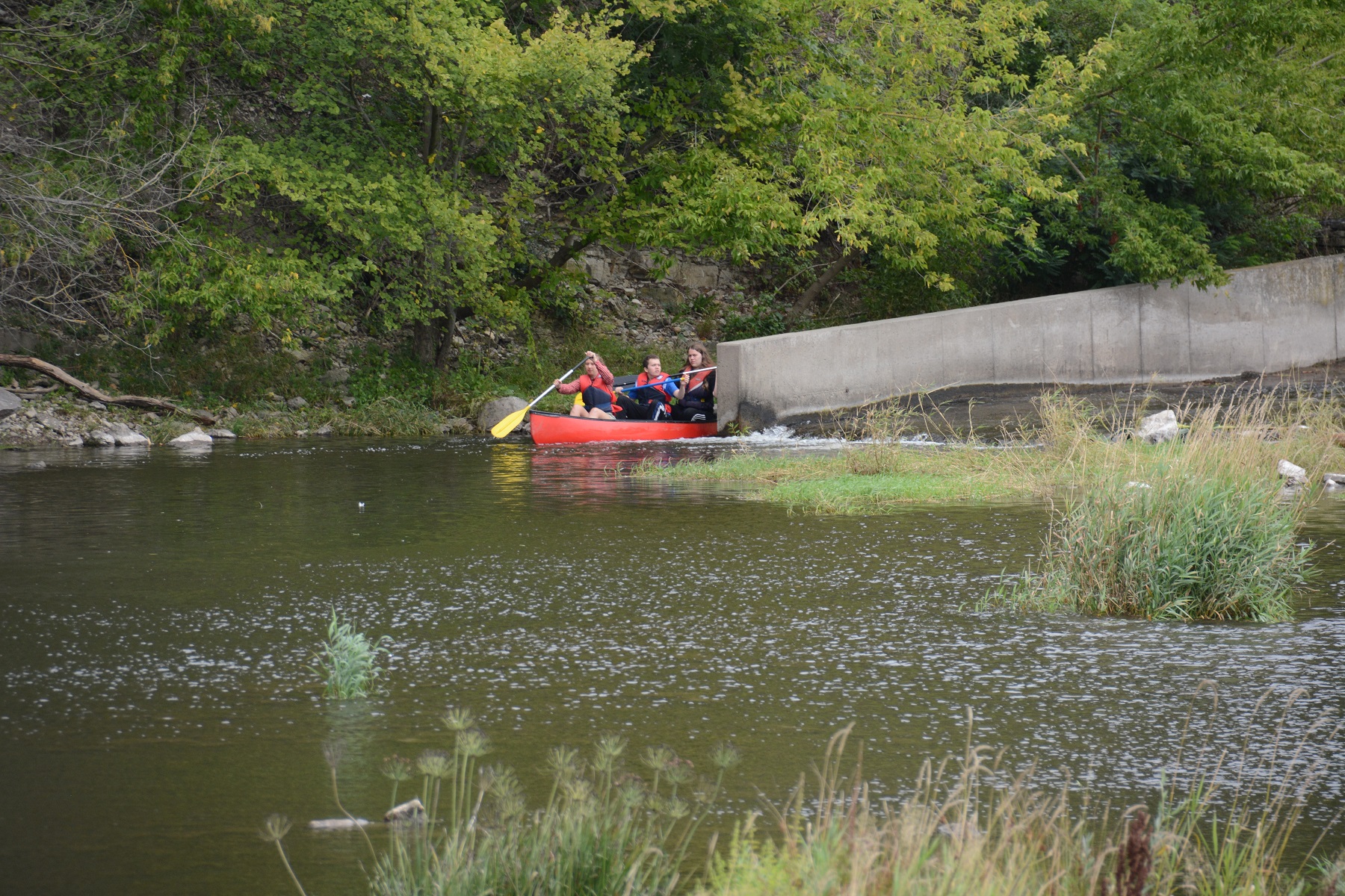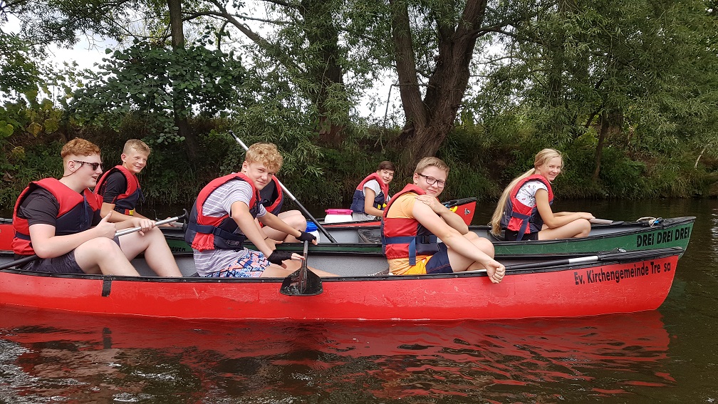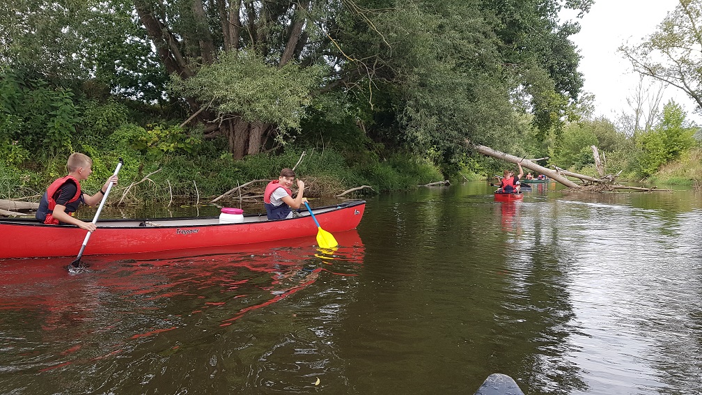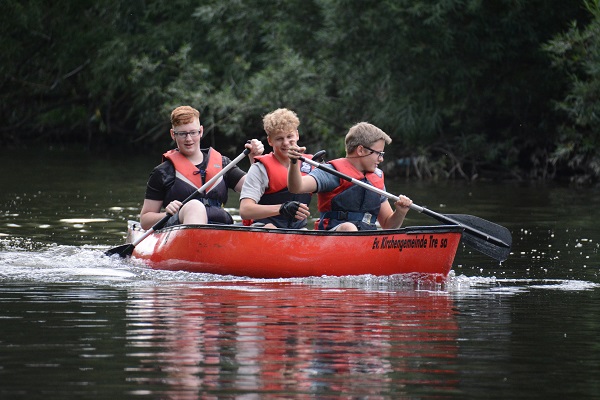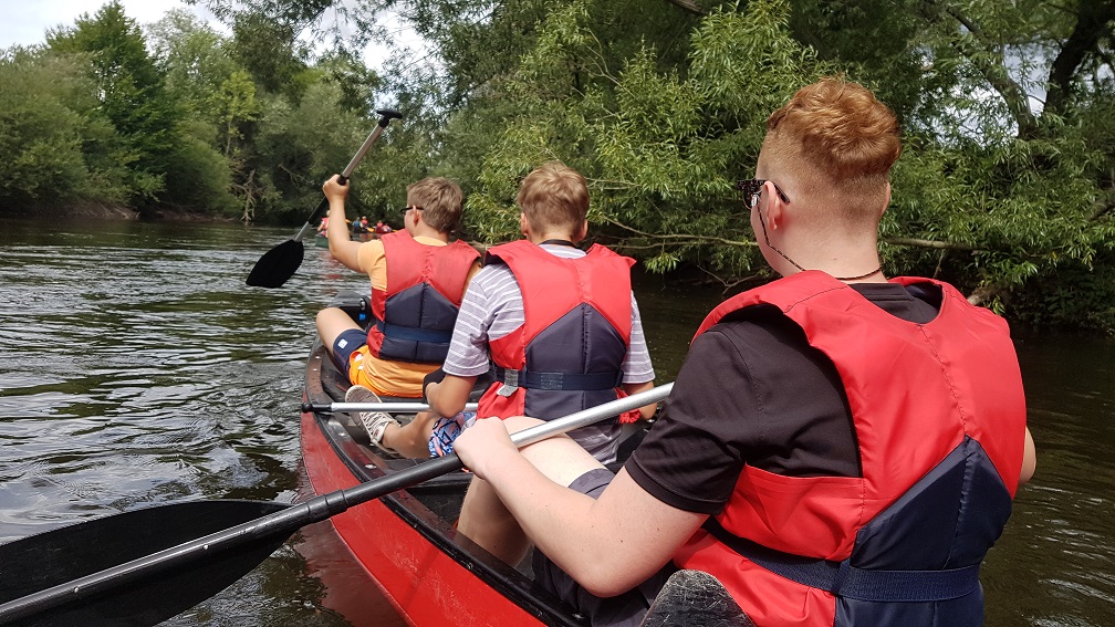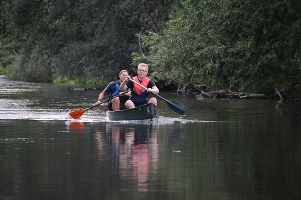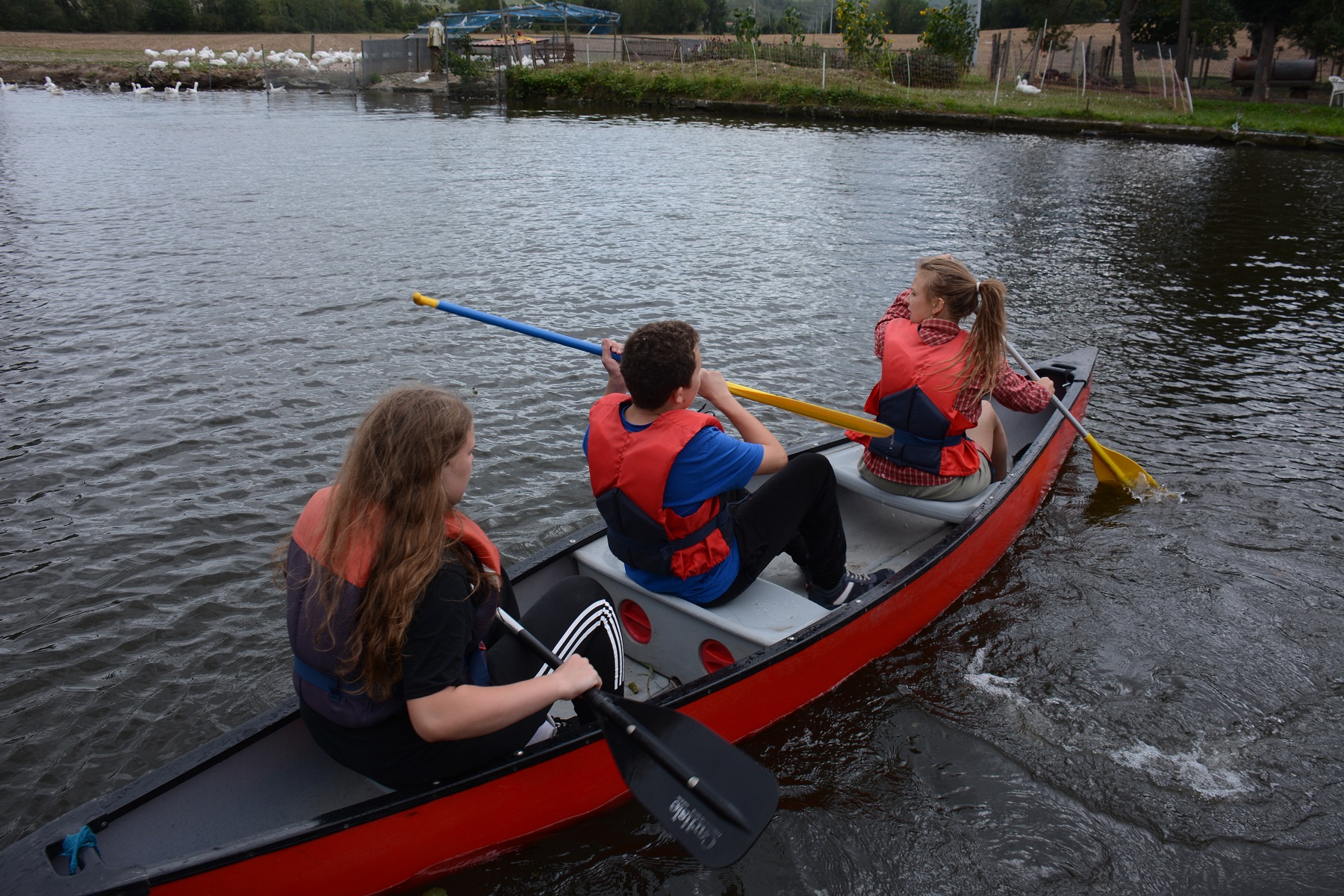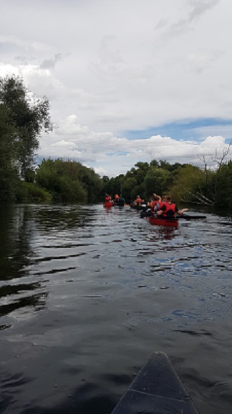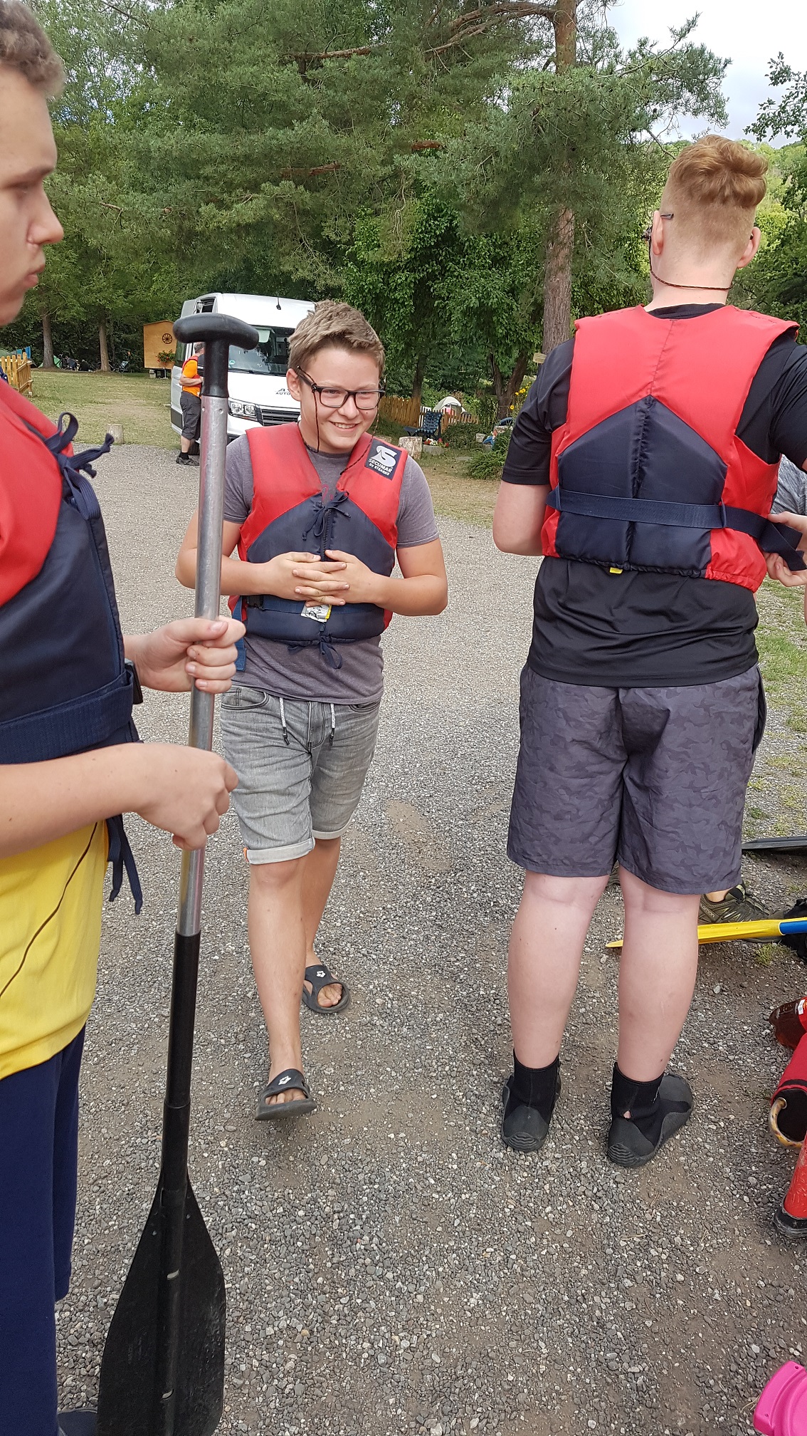 Nach fachmännischer Einweisung von Joni, einem unserer Freizeit-Teamer, paddelte unsere Gruppe in Zweier- und Dreierkanus munter und abenteuerlustig los. Einige hatten bereits Vorerfahrungen hierin, andere erprobten ihre neu gesammelten Kenntnisse direkt im Praktischen aus. Bereits nach wenigen Minuten kenterte bereits ein Grüppchen ganz plötzlich. Die frische Abkühlung des Flusses sollte die Freude und den Spaß an der Tour jedoch nicht mindern. Stattdessen wurde herzhaft gelacht und sich gegenseitig beim Umwuchten der Kanus tatkräftig beigestanden. Ein ganz schöner Kraftakt, insbesondere dann, wenn einige Wassermengen den Innenbereich des Kanus erfasst haben! Kurze Verschnaufspause für die -mehr oder minder freiwilligen- Wasserratten und schon….ging’s weiter inmitten die wilde Schönheit der Natur. Mangrovenartig und zauberhaft wölbten sich Bäume eng an eng am Flussrand. Man gewann den Eindruck sich in einer anderen Welt zu befinden.