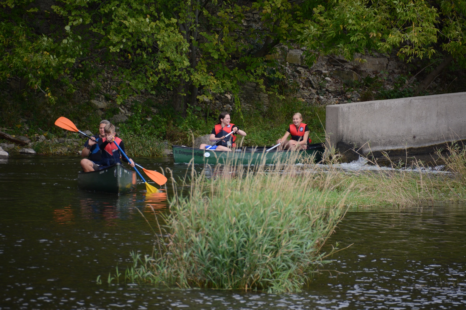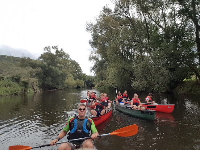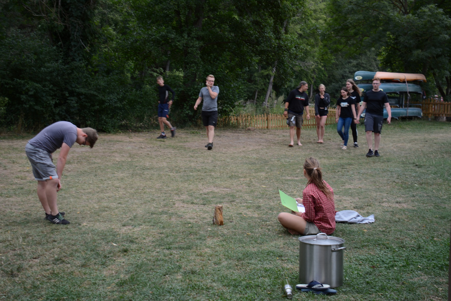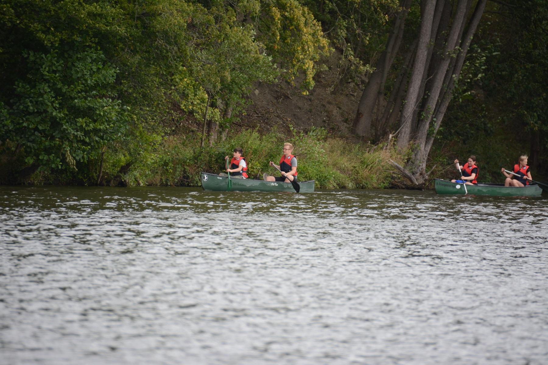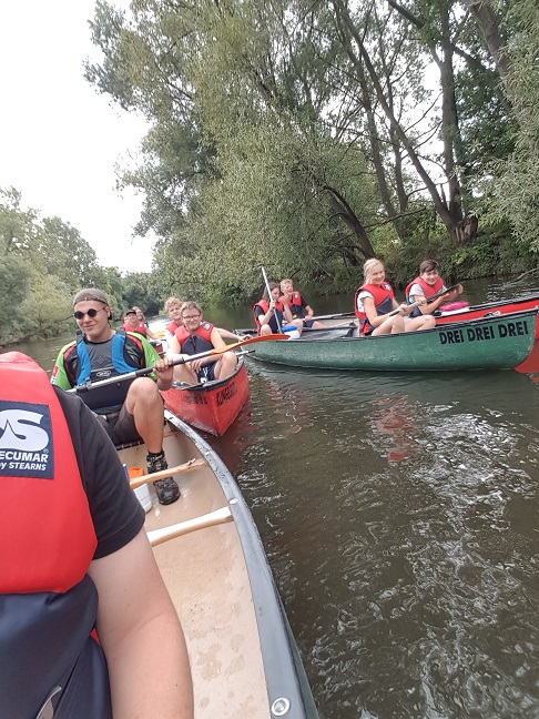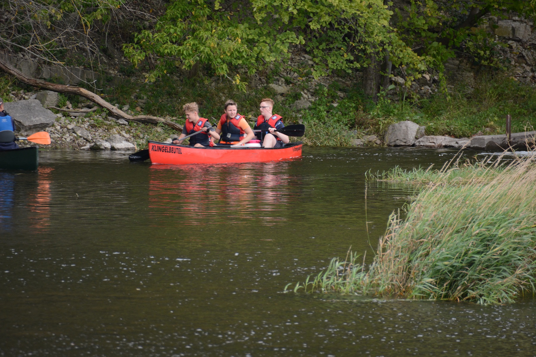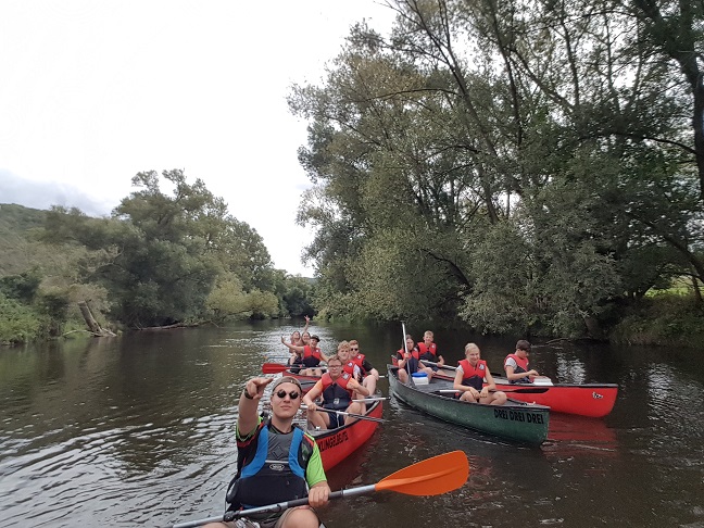 Zurück in unserem Camp wurden die restlichen Utensilien, wie Paddel und Schwimmweste, für unseren weiteren Tagesablauf, gepackt. Und auf ging’s in die zweite Runde unserer Kanutour. Auch heute wieder waren wir wieder fasziniert von den wunderhaften Wasserwegen. Joni verlangte heute von uns Freizeitteilnehmern alles: Wir sind die Saale ein stückweit flussaufwärts gefahren. Dies verlangte neben starken Nerven, Ausdauer und Kraft, vor allem Teamgeist, Empathie und Kommunikationsketten. Denn wir passierten durch äußerst mangrovenartige Wasserwege, um zu unserer Kanuanlegerstelle zu gelangen. Die hier anzutreffenden Hürden, wie hinabhängendes Geäst und Blätterwerk, haben uns heute nochmal mehr zu einem umsichtigen Team zusammenwachsen lassen. Einige von uns haben Ängste oder Zweifel, durch positives Zureden überwunden, und somit an Selbstwertgefühl gewonnen.