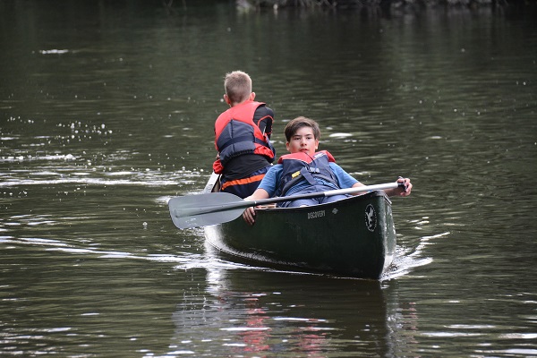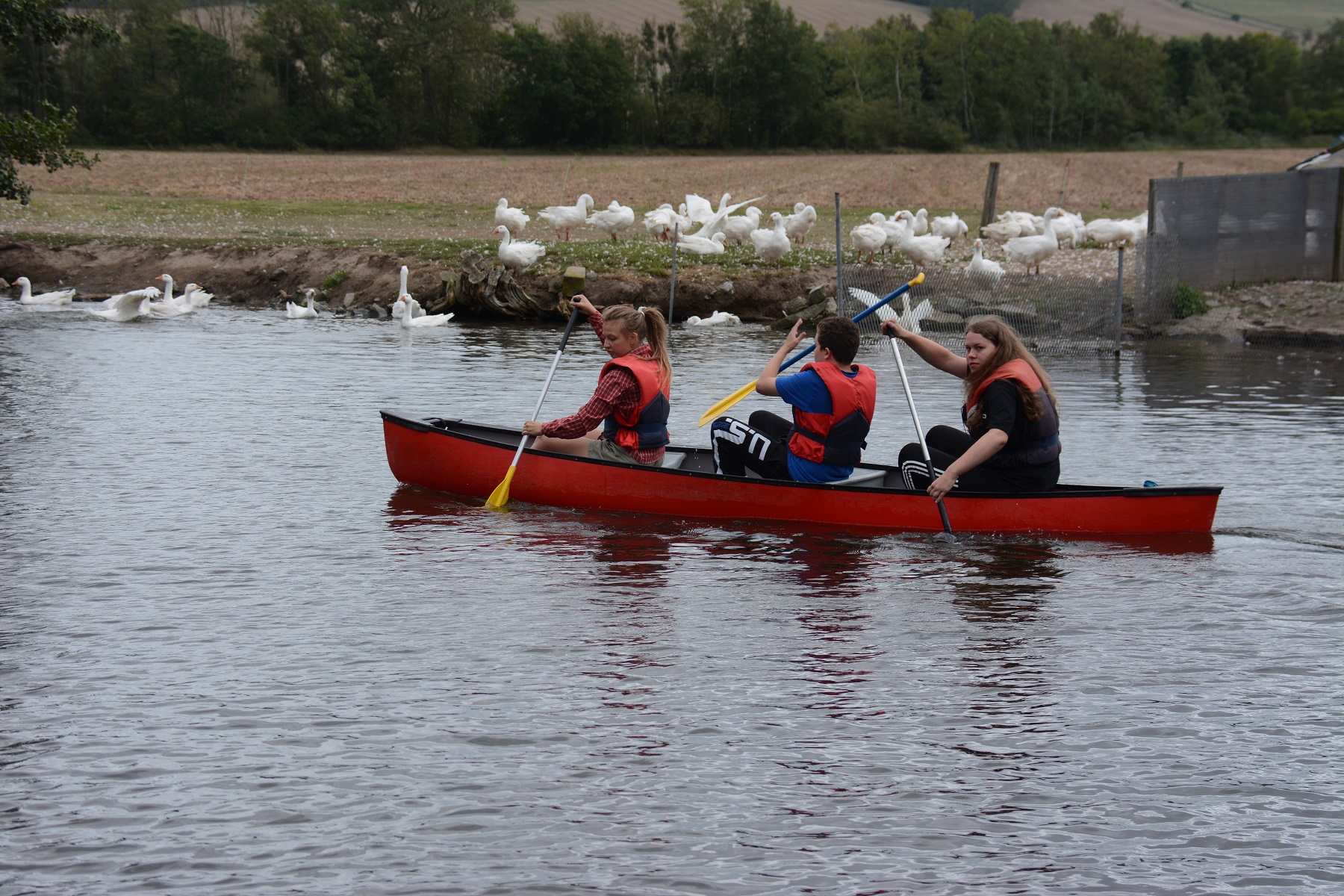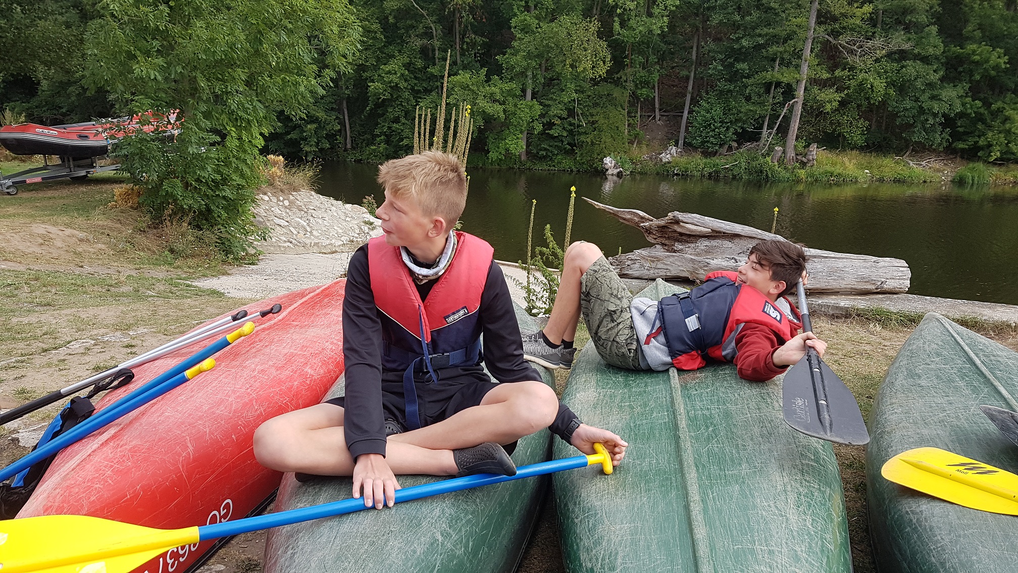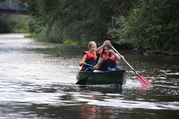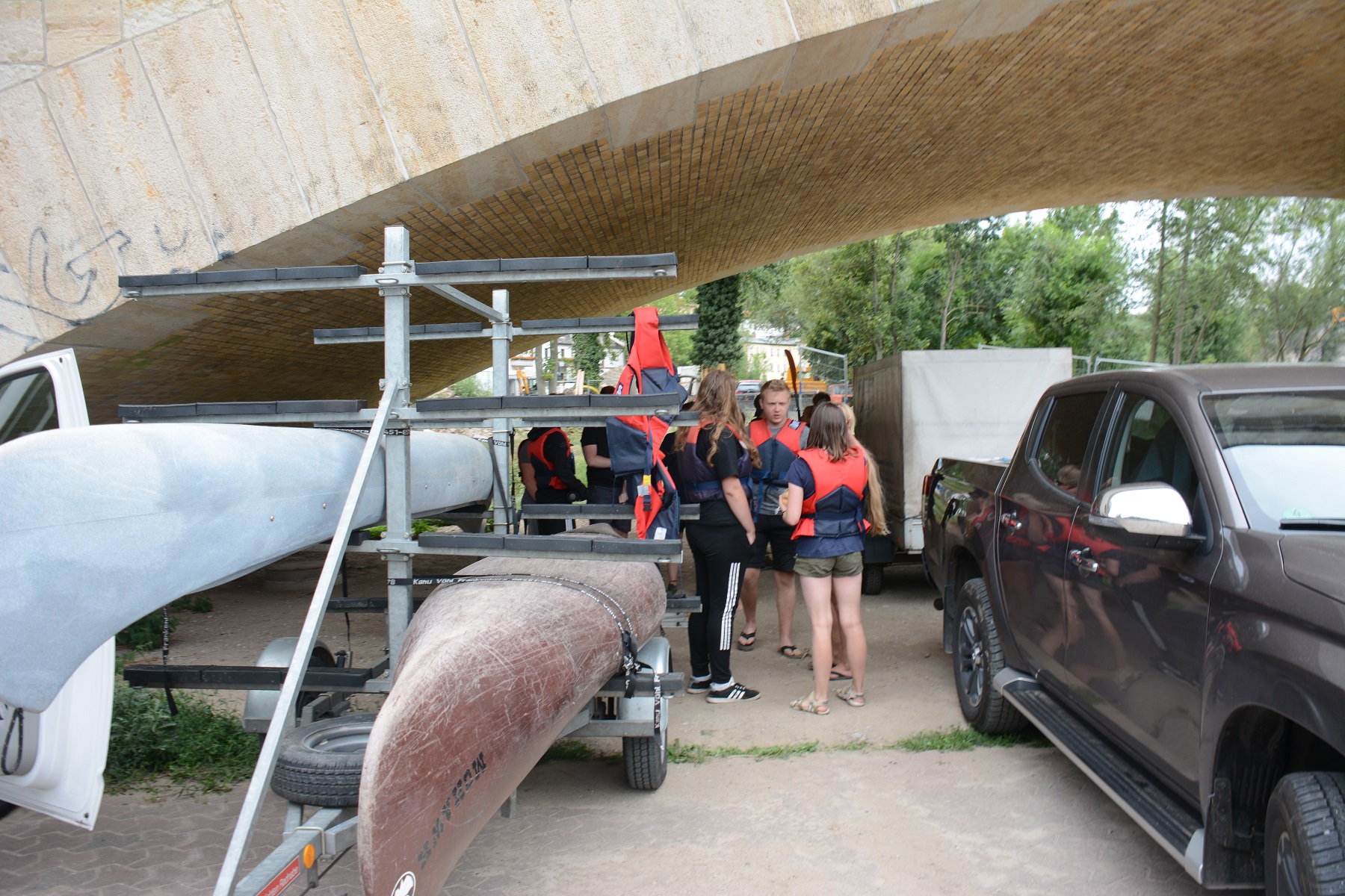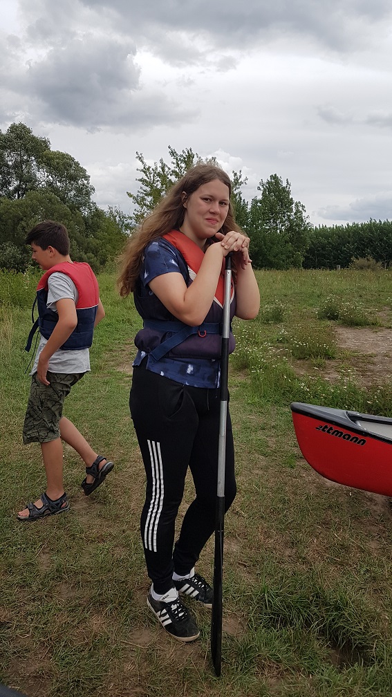 Zurück in unserem Camp wurden die restlichen Utensilien, wie Paddel und Schwimmweste, für unseren weiteren Tagesablauf, gepackt. Und auf ging’s in die zweite Runde unserer Kanutour. Auch heute wieder waren wir wieder fasziniert von den wunderhaften Wasserwegen. Joni verlangte heute von uns Freizeitteilnehmern alles: Wir sind die Saale ein stückweit flussaufwärts gefahren. Dies verlangte neben starken Nerven, Ausdauer und Kraft, vor allem Teamgeist, Empathie und Kommunikationsketten. Denn wir passierten durch äußerst mangrovenartige Wasserwege, um zu unserer Kanuanlegerstelle zu gelangen. Die hier anzutreffenden Hürden, wie hinabhängendes Geäst und Blätterwerk, haben uns heute nochmal mehr zu einem umsichtigen Team zusammenwachsen lassen. Einige von uns haben Ängste oder Zweifel, durch positives Zureden überwunden, und somit an Selbstwertgefühl gewonnen.