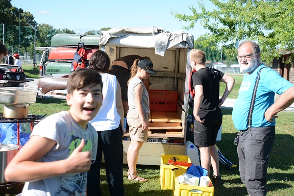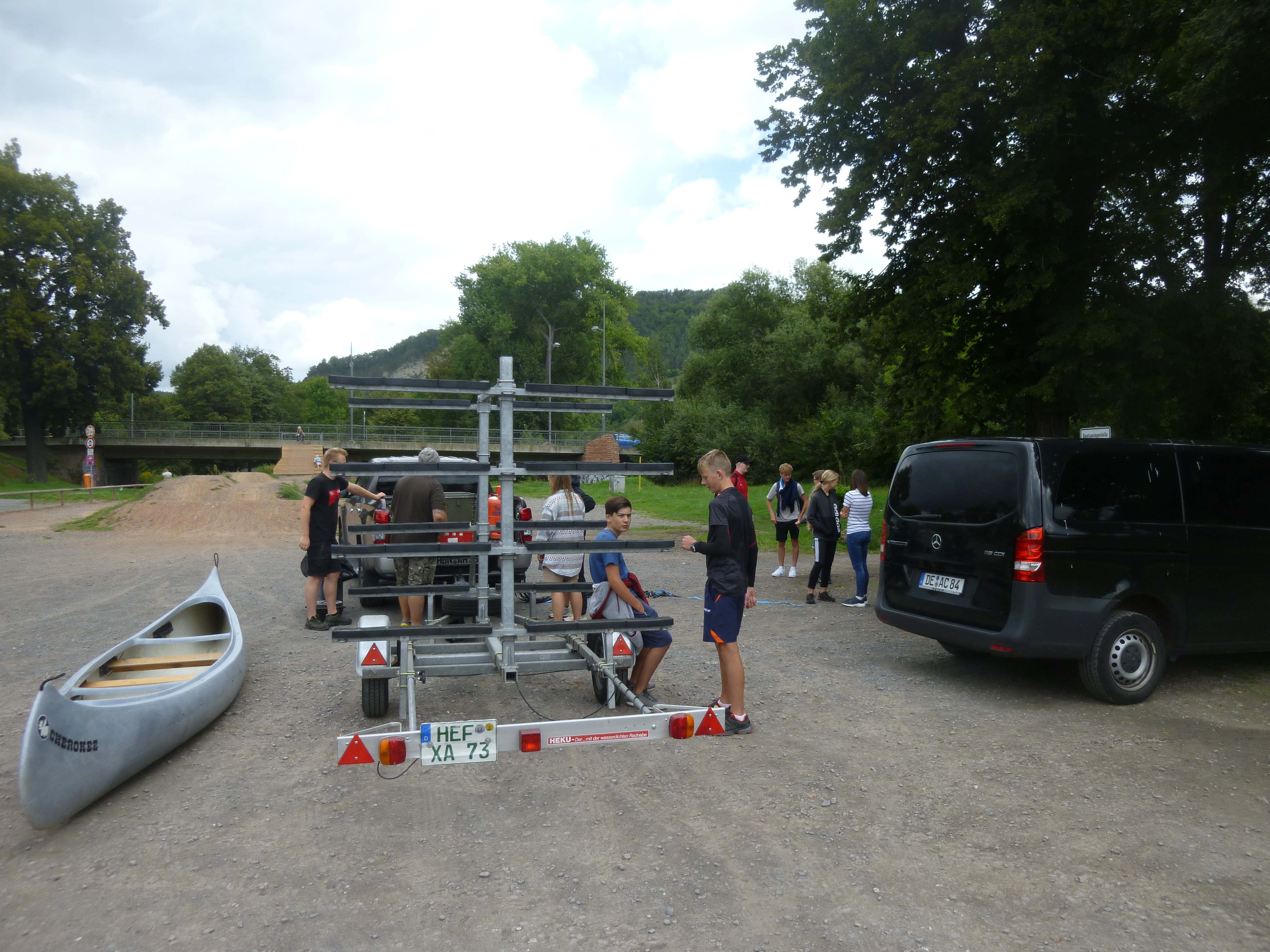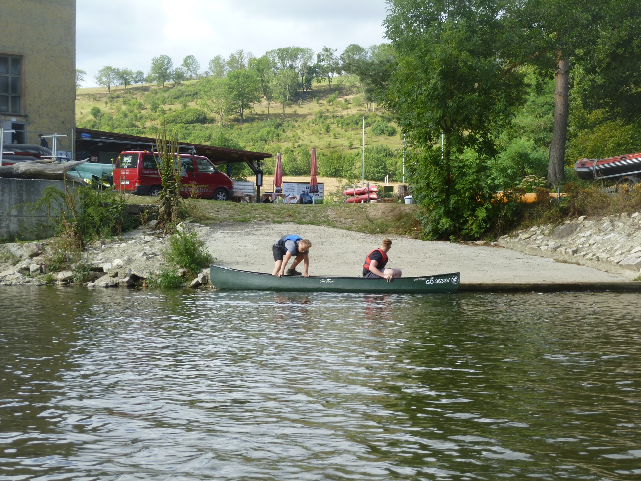 Etwas verzögert ging es heute los. Am Gemeindehaus hatten sich alle versammelt, wie man auf dem Gruppenbild sehen kann, wohlgemut. Die Fahrt nach Kala ging ohne Probleme, niemandem wurde schlecht… In Kala erwartete uns Joni, der den Einstieg organisierte. (Wie er heute Abend erst verriet, hat er heute auch Geburtstag) Da die Autos zum Pausenort Rothenstein umgesetzt werden mussten, kann ich nicht aus eigener Erfahrung berichten, aber kurz nach Beginn der Tour hat ein Dreierboot sich zu weit auf eine Seite gelehnt 😊Es soll sehr nass gewesen sein. Aber Daniela hat versprochen morgen einen kurzen Bericht zu liefern, wie so die Fahrt war. In Rothenstein, sehr idyllisch gelegen, haben wir uns mit Würstchen gestärkt. Für Frank und mich ging es weiter mit den Autos. Die Ankunft in Jena war auch für die Bootsfahrer unspektakulär, aber sie machten alle einen zufriedenen Eindruck. Dann wurden die Zelte aufgebaut und da Abendessen gekocht (Gulasch aus der Dose, nicht gerade Bocuse, aber es gab auch eine leckere vegetarisch Tomatensoße, die Frank zauberte).