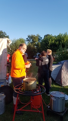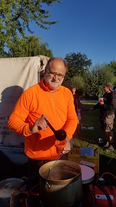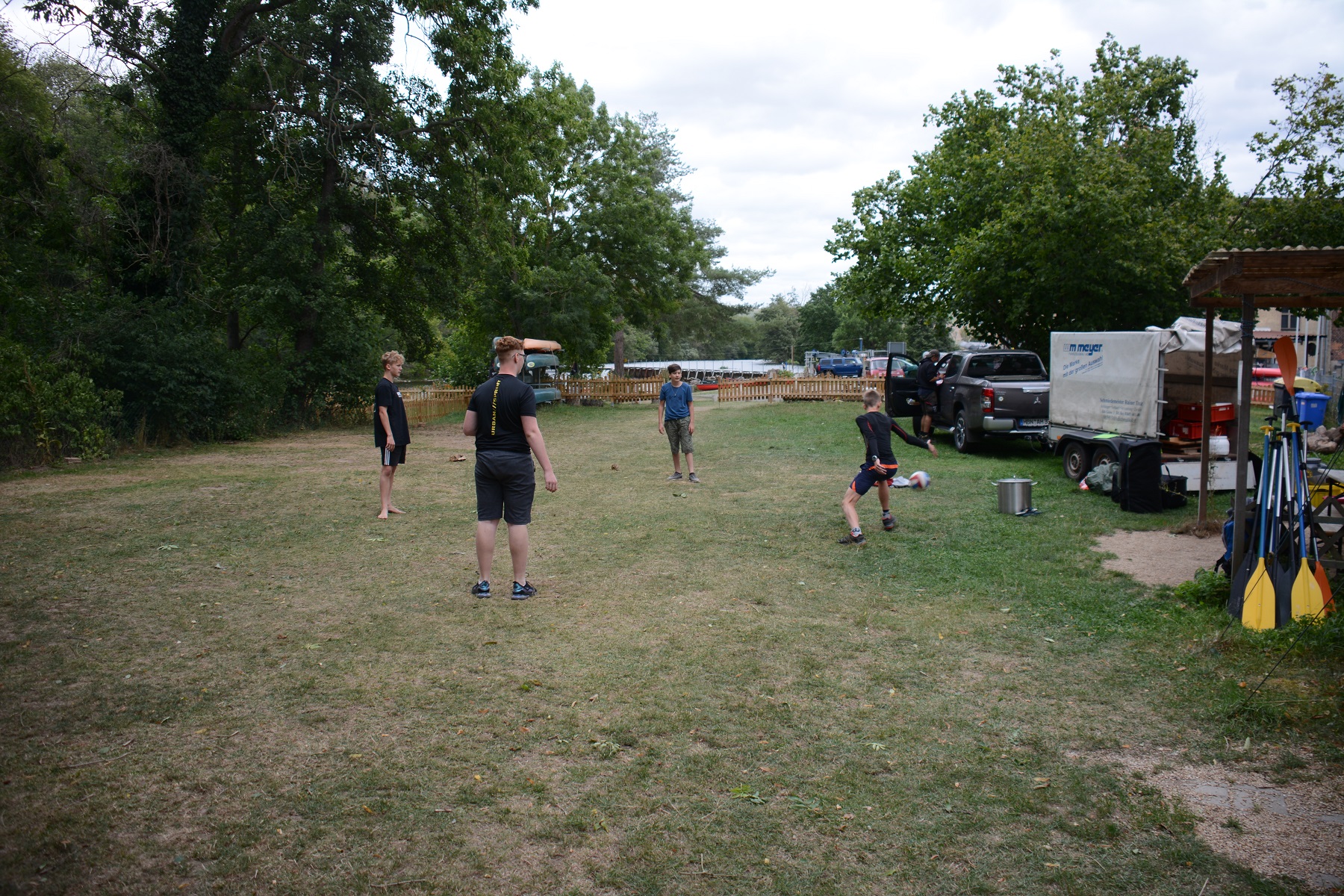 Die Nacht wurde in den großen Zelten für manch einen eine Herausforderung. Aber der morgen gestaltete sich recht entspannt, da wir keine Zelte abbauen mussten. Joni, der bislang die Führung auf dem Wasser übernommen hatte, musste für den Vormittag nach Jena. Jakob übernahm perfekt. Es war heute die längste Tour der Reise. Fast 33 km Saale waren zu bewältigen. Es ging nicht ohne eine beinahe Kenterung und eine Kenterung ab. Aber das einzige, was dabei passierte, waren die nassen Klamotten hinterher. Das Mittagessen hielt Frank in Bad Kösen bereit. Danach machte er sich mit auf das Wasser, während Sophie, Daniela und ich die Autos holten und zum Campingplatz nach Naumburg brachten. Das ging etwas länger, da ich zunächst den falschen Zielort in das Navi eingegeben hatte. Für das Abendessen auf dem sehr schönen Campingplatz sorgte Daniela: Spätzle mit Käsesoße. Nach der meditativen Andacht war es recht bald still in den Zelten und die großen Paddler vor dem Herrn schliefen bald. Nach den Absprachen für den morgigen letzten Tag bei einem Gläschen Unstruth-Wein ging auch für die Leitung der Tag zu Ende und die Isomatte ruft jetzt auch nach mir.