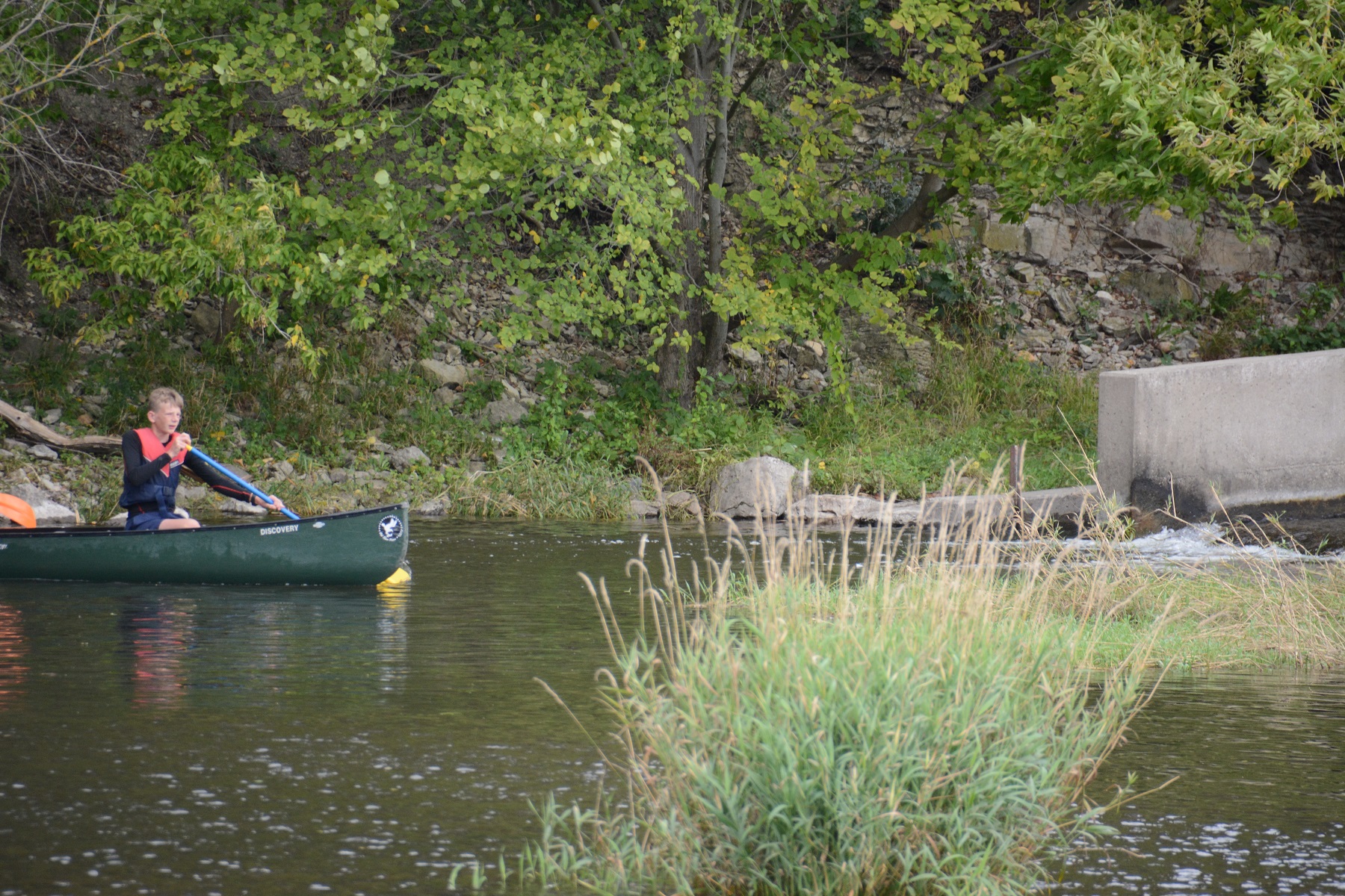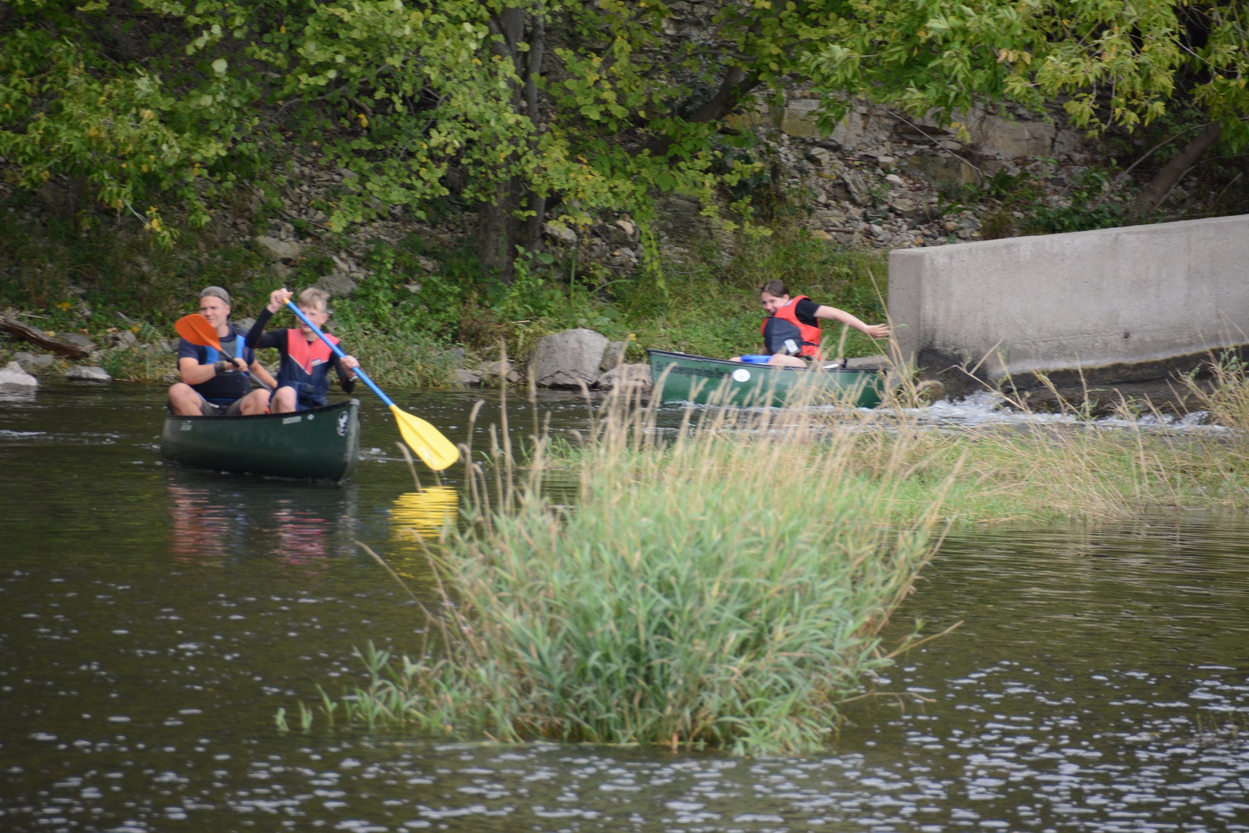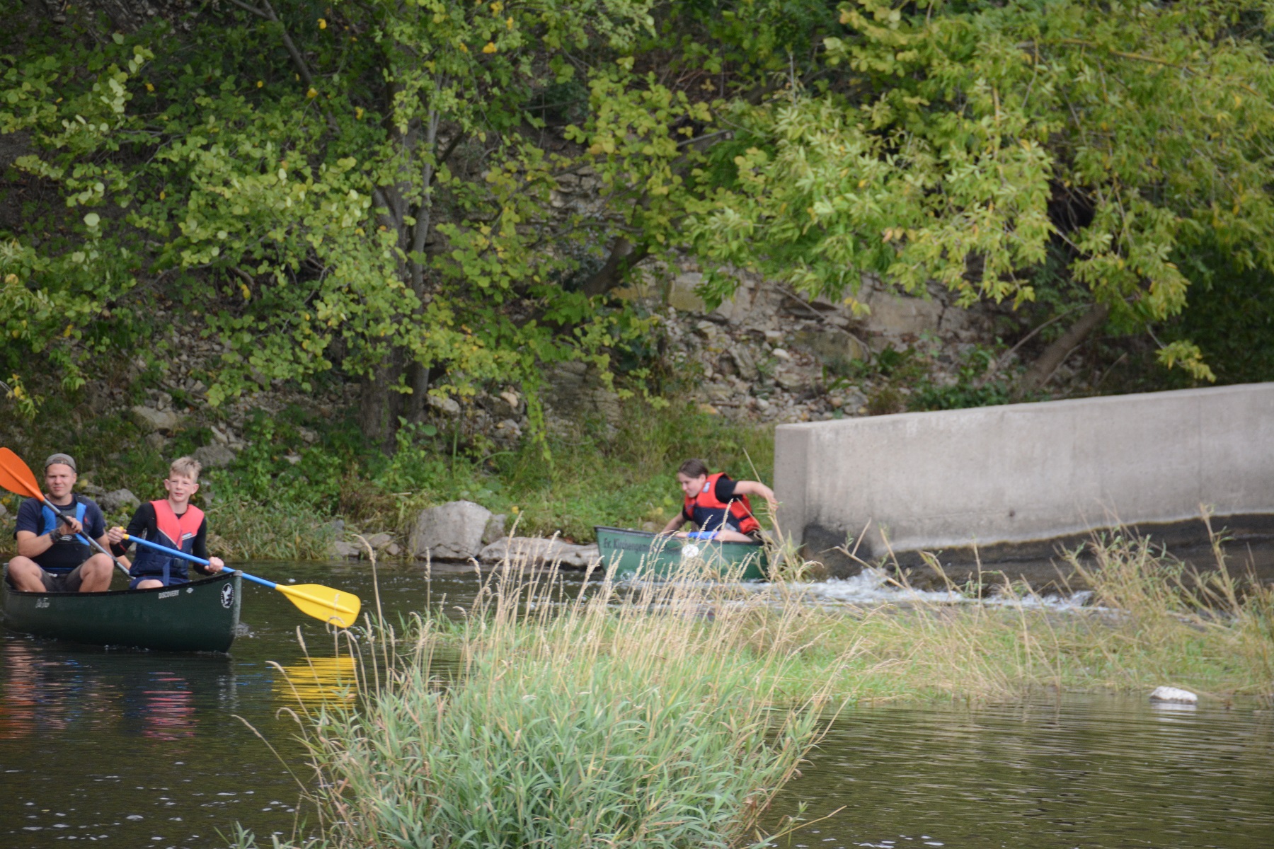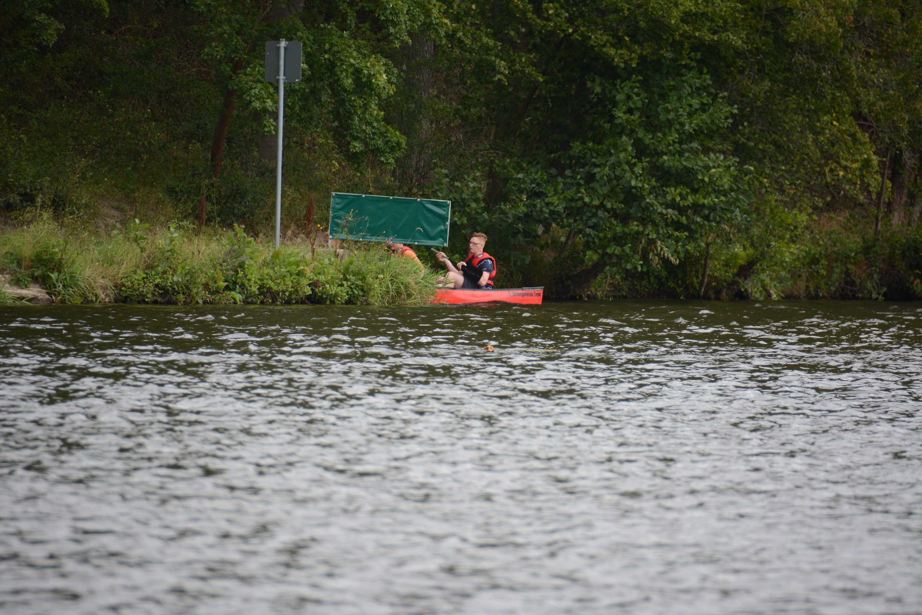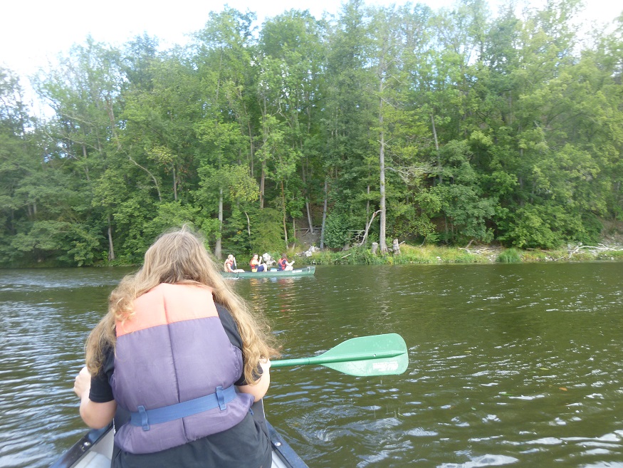 Heute begleitete uns den ganzen Tag auffrischender Wind. Aber er blies uns in den Rücken, jedenfalls zu meist. Nach der Tagesimpuls und dem Frühstück ging es auf die kürzeste Strecke der Reise, die heute zu paddeln war. Ein Teil durfte ich sogar dabei sein. Joni warnte uns zu Beginn der Fahrt vor herunterfallenden Ästen. Doch da wir uns an seine Anweisung hielten und in der Mitte der Saale fuhren ging keine Gefahr davon aus. Einige Engstellen entstanden durch umgestürzte Bäume, aber auch sie waren nur eine Herausforderung und kein Problem. Zum Abschluss der Fahrt kam auch die erste Kanurutsche. So mussten die Kanus nicht umgesetzt werden, sondern sie glitten in die nächste „Etage“. Da noch einiges an Zeit vom Tag übrig war, wurden Spiele gemacht, die Boote mit Nummern versehen und natürlich gekocht. Heute gab es Chili con carne. Und für unsere Vegetarierinnen (und nicht nur für diese) ein Chili sine carne. Diese Nacht verbringen wir in Mannschaftszelten. So ersparen wir uns Auf- und den Abbau unserer Zelte, was für den morgigen Tag ganz gut ist, da uns 33 Flusskilometer bevorstehen.