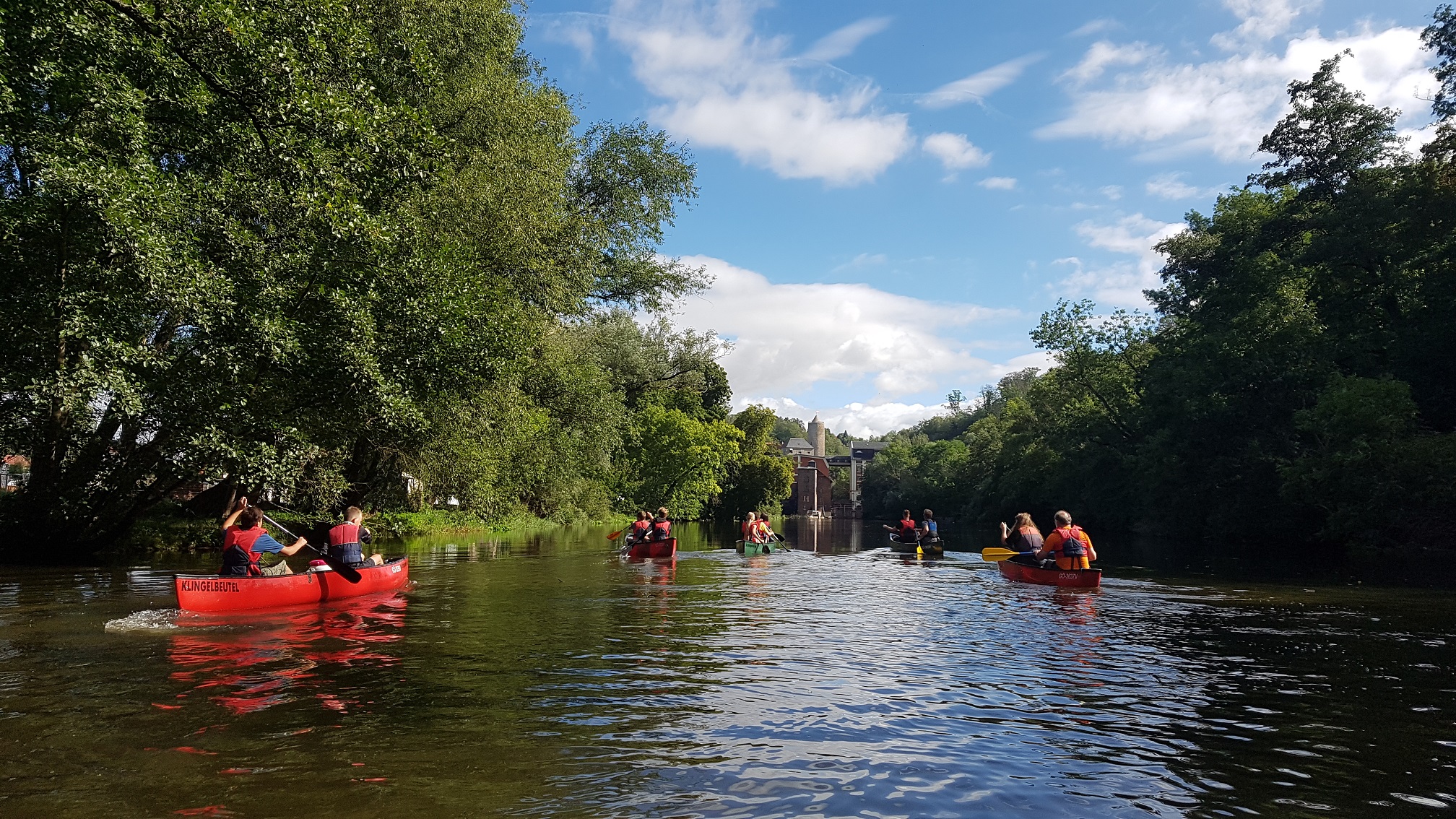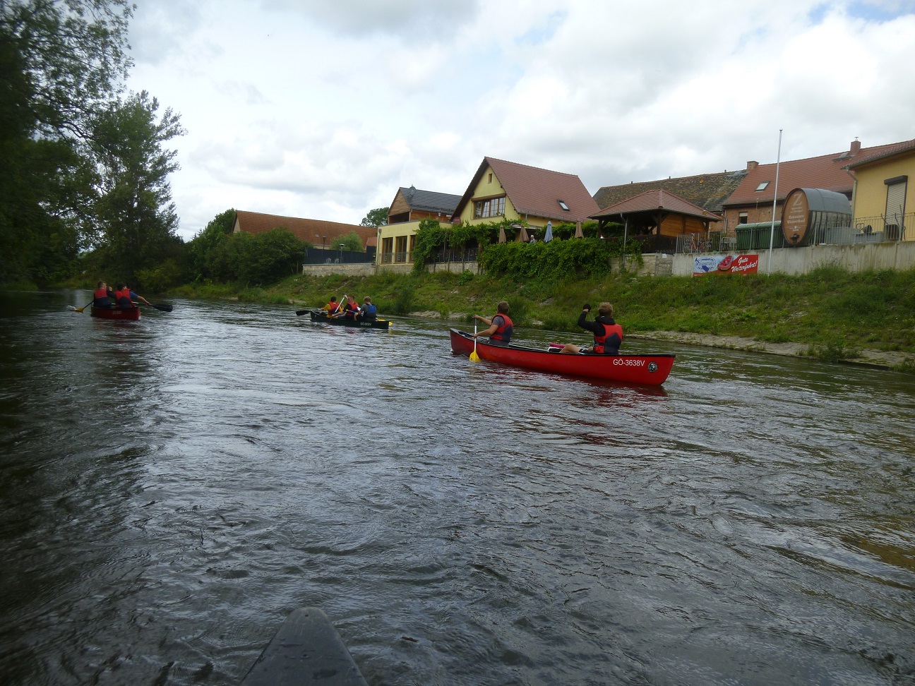 Unser Kanuweg führte uns weiter vorbei an idyllisch gelegenen Wasserpfaden, die nach mehreren Wehrübersetzungen volle Fahrt nehmen konnten. Am Ende des Tages kamen wir an unserer ersten Übernachtungsmöglichkeit nun endlich an: dem Campingplatz von Jena.