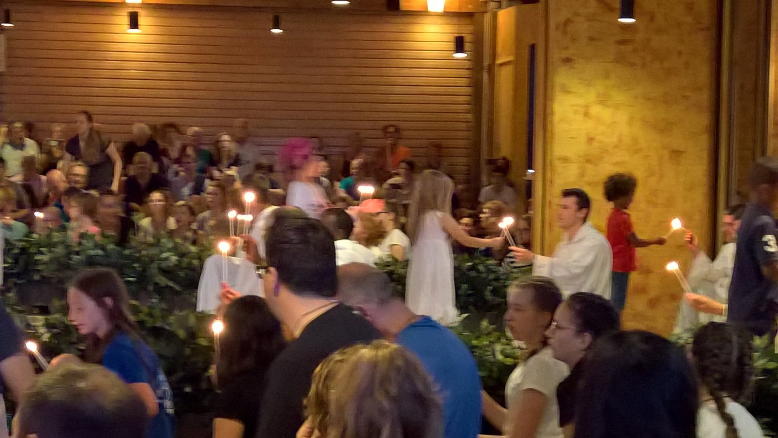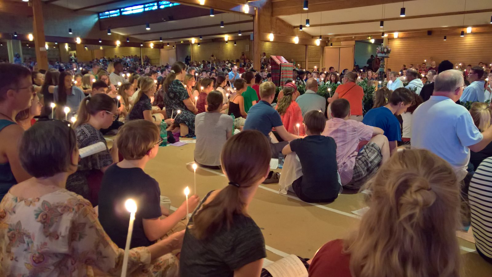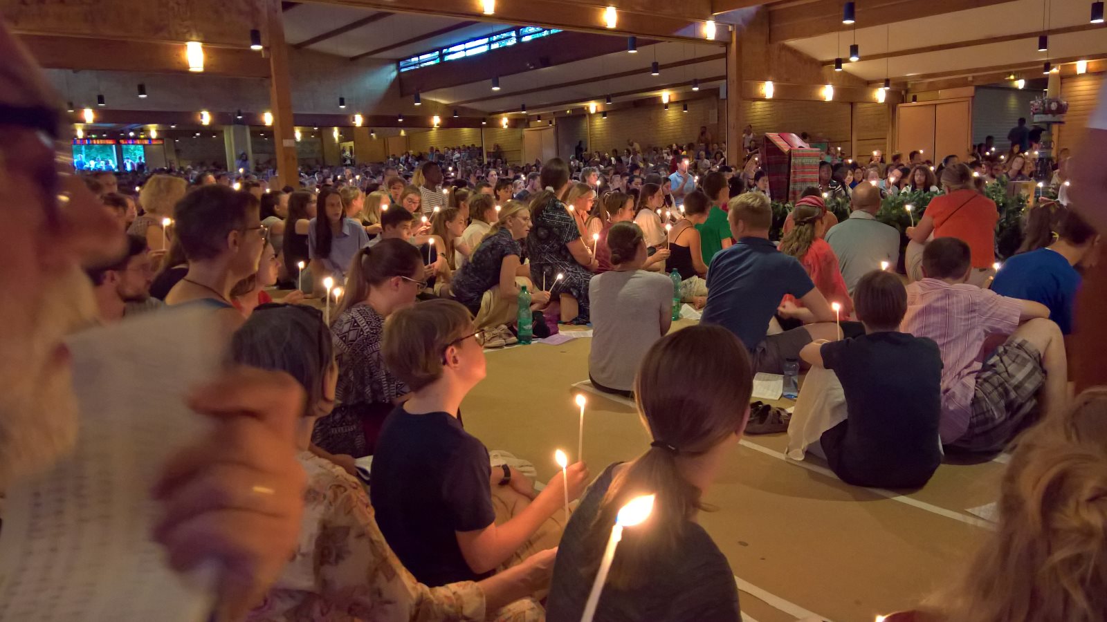 Bevor wir abgefahren sind, haben wir noch an der „Lichterkirche“ teilgenommen.  Es war eine sehr entspannende und schöne Andacht, bei der nun zum Tragen kam, dass wir und die Anderen die Lieder kräftig und laut mitsingen konnten. Der Klang der ca. 3500 jungen Leute klingt einem sicher noch lange im Ohr. Kleine Kinder sitzen bei den Brüdern und geben das Licht weiter an die Besucher des Gottesdienstes.