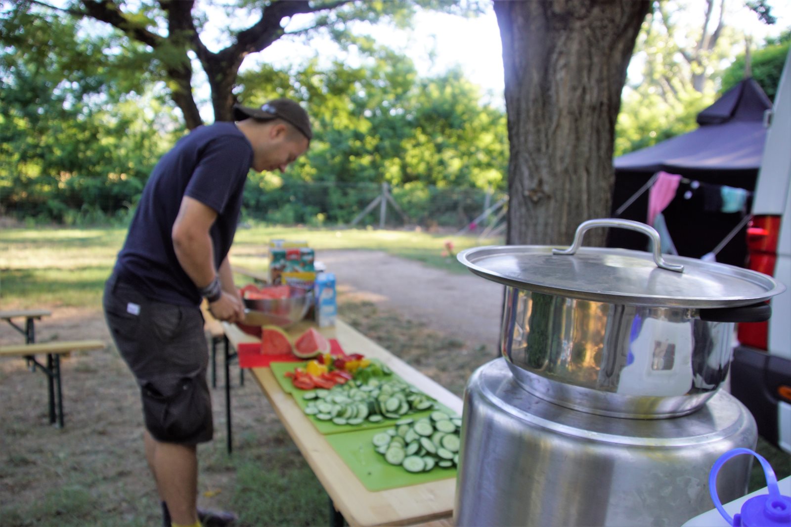 Am Abend gab es Chili con carne mit Couscous. Es kam extrem gut an, nachdem eine Busbesatzung Unmengen an Knoblauch, Zwiebeln und Tomaten schnitten und verkocht hatte.