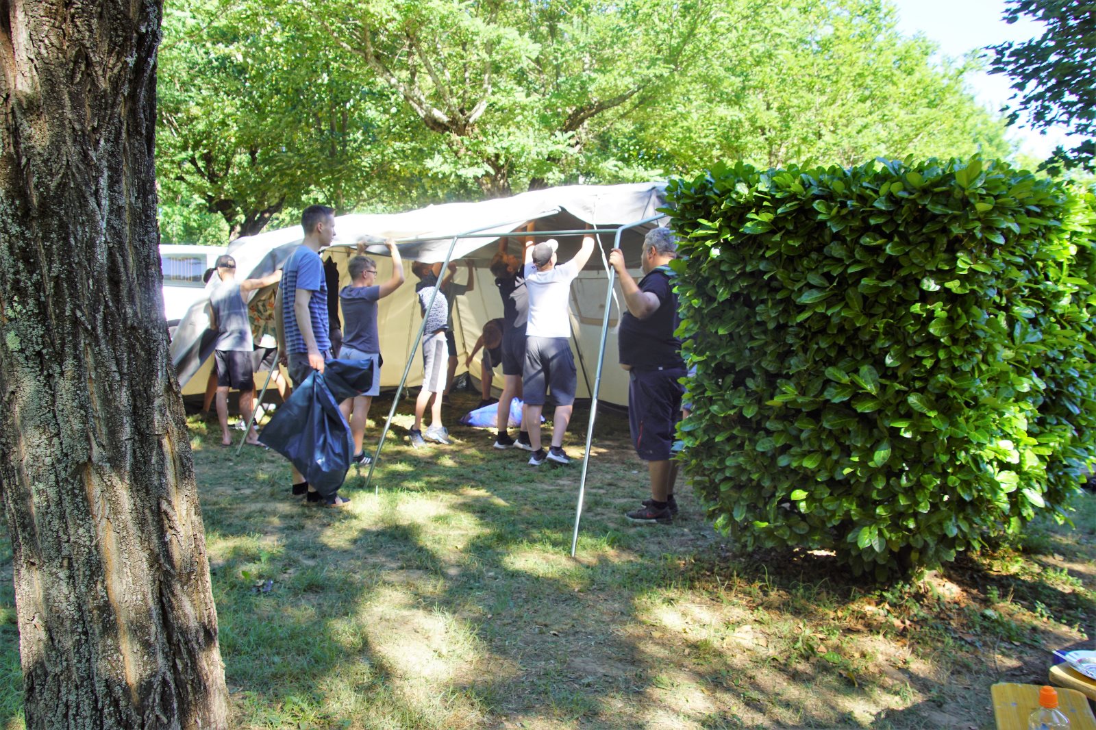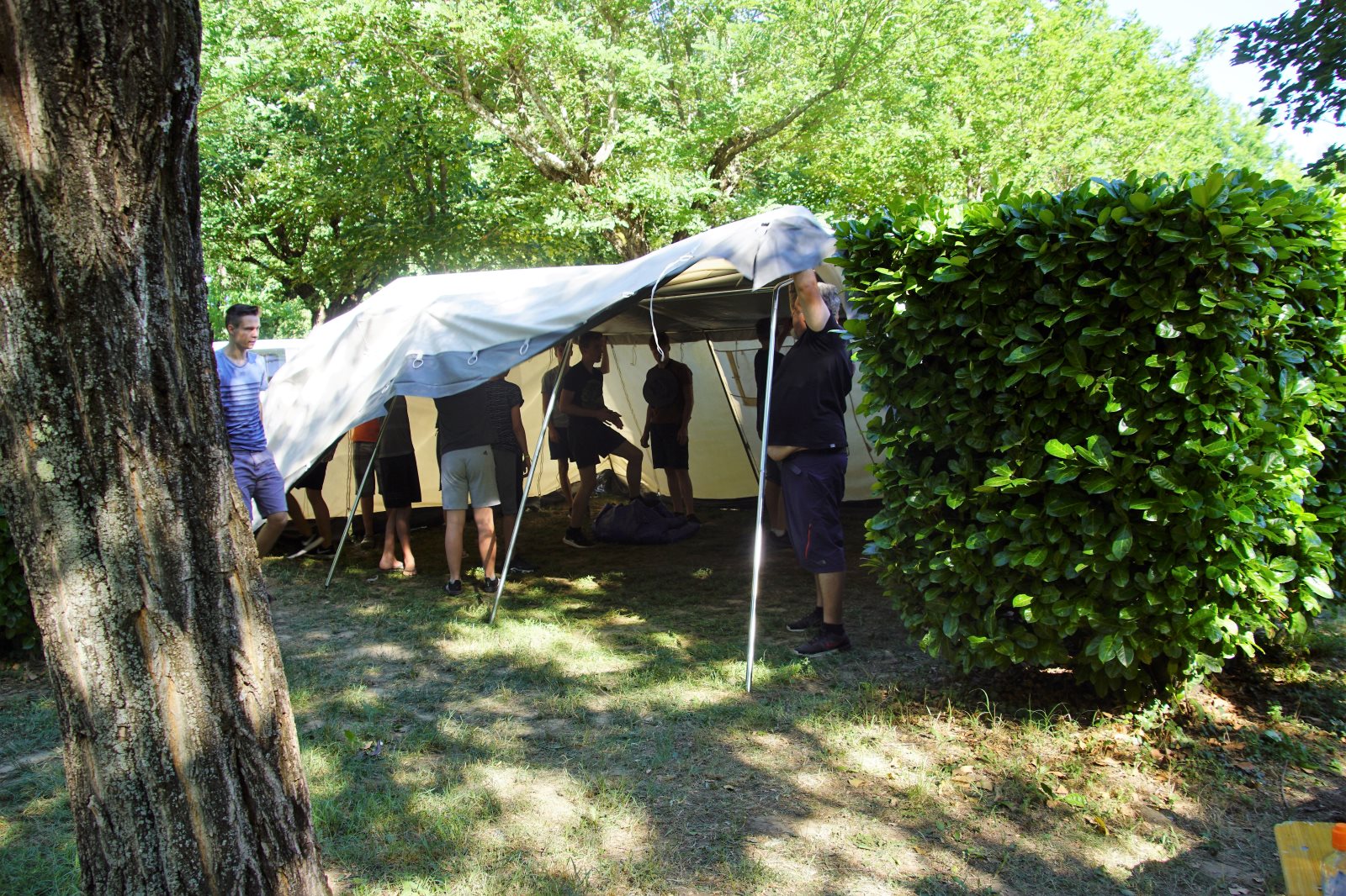 Die Fahrt war problemlos. Allerdings ist es hier nicht viel kühler als in Avignon und die Sonne bretzelt auf uns herunter.  Zum ersten Mal sind wir nicht in Zelten untergebracht, sondern in Zimmern. Sie sind sehr schlicht, aber erstaunlich kühl.
