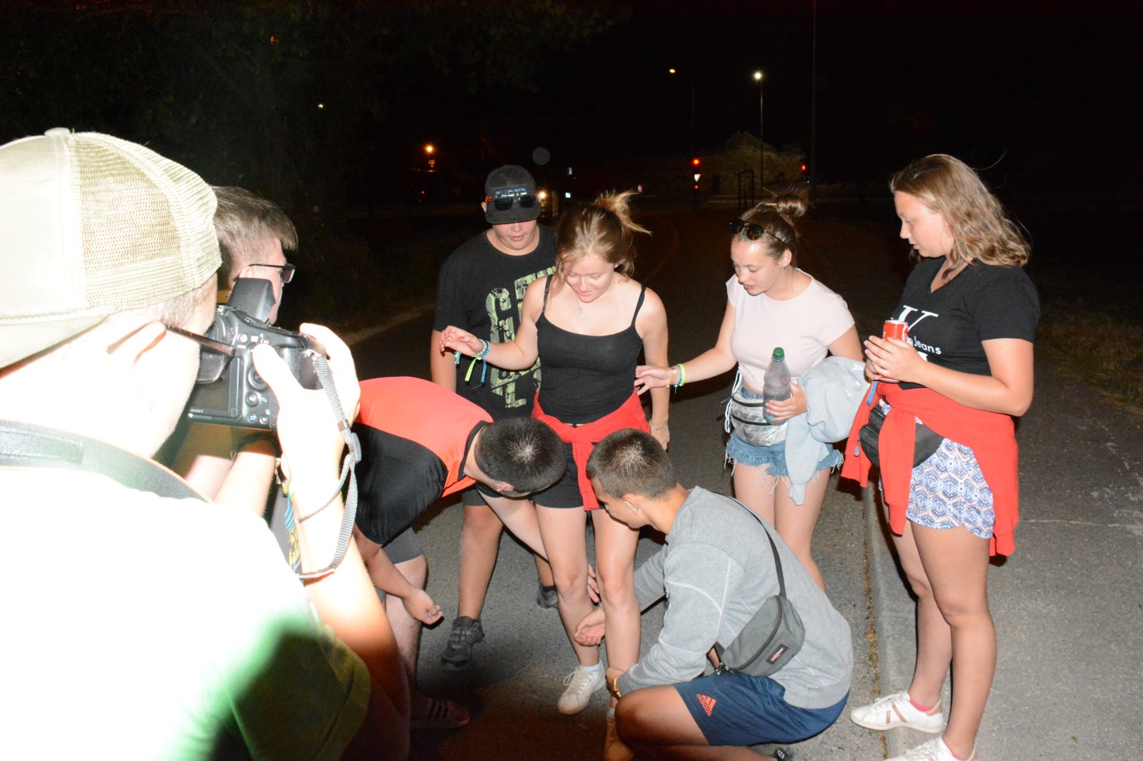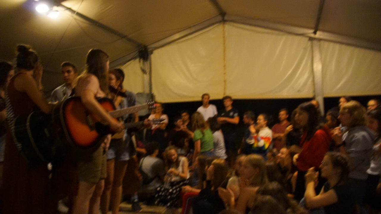 Am Abend waren wir alle im Zelt neben dem „Ojak“, wo man Eis, Pizza, Mr.Crock, Cola und eben auch Cidre extrem preiswert kaufen kann. Im Zelt haben sich die sangesfreudigen Leute getroffen. Hier habe ich einige Leute unserer Gruppe zum ersten Mal wiedergesehen. Aber das habe ich schon gelernt: Wenn sich niemand meldet, muss man sich keine Sorgen machen und sie sind gut beschäftigt. Es wurden Songs, Balladen, neuester Pop gesungen. Allerdings war heute ein extremer Wettbewerb. Die Spanier hatten ihre eigenen Lieder und wollten, dass alle anderen bei ihnen mitsangen. Also wurde gleichzeitig gesungen und getestet, wer die lauteren Stimmen hat. Die Spanier waren kaum zu toppen, trotzdem hatten sie keine Chance gegen die vielen anderen Stimmen. Auch wenn es etwas nervig war, so führte es dazu, dass jeder so kräftig mitsang, wie ich mir das bei anderen Gelegenheiten ansatzweise wünschte. Gestern hat übrigens auch unser Karl mit den Massen „Sweet home Alabama“ gesungen. Ich freue mich schon, wenn er morgen wieder seinen Auftritt hat, vielleicht mit noch ein oder zwei anderen Titeln. Er hat es so geplant.