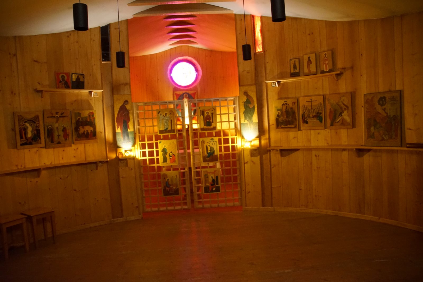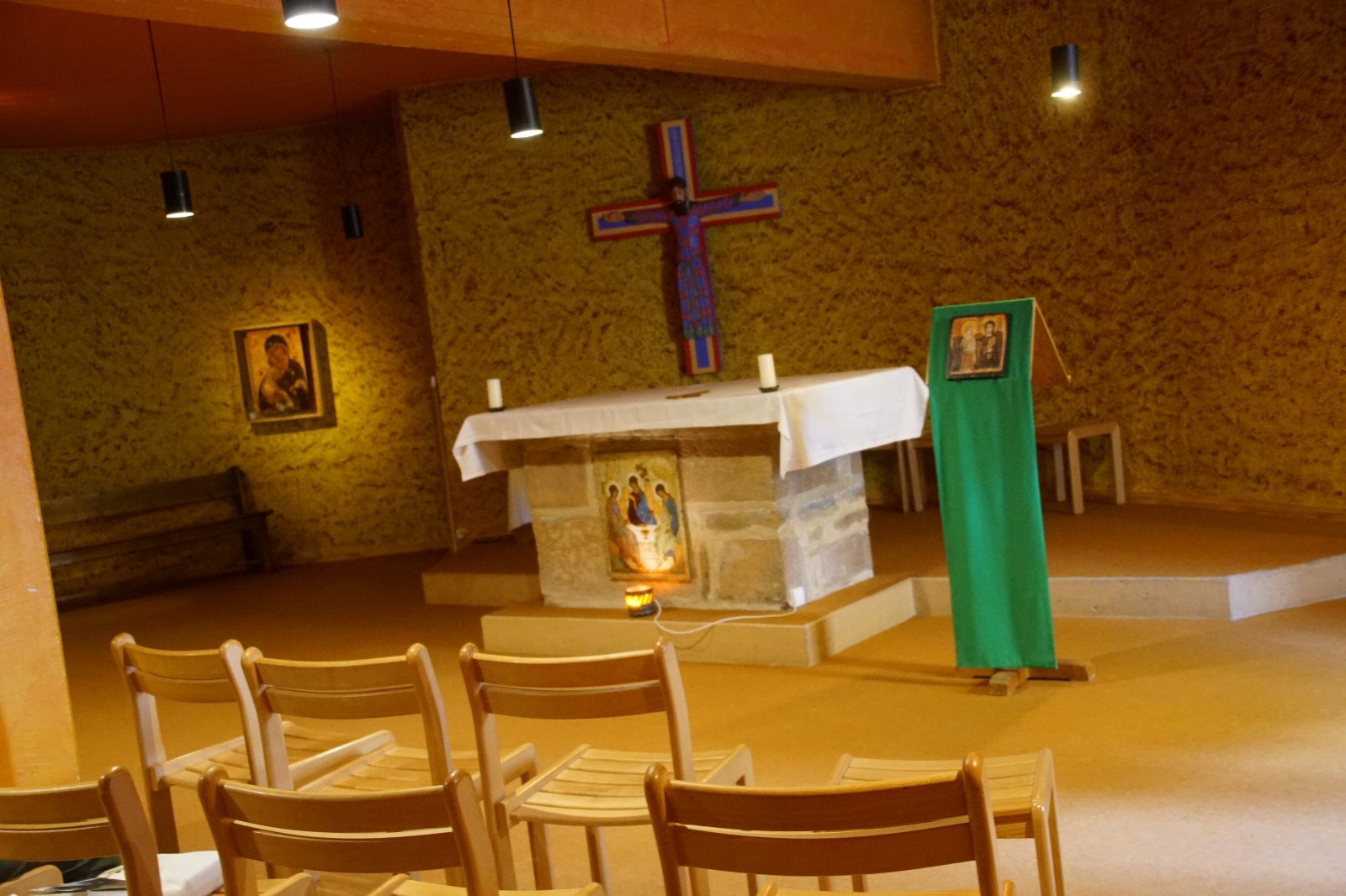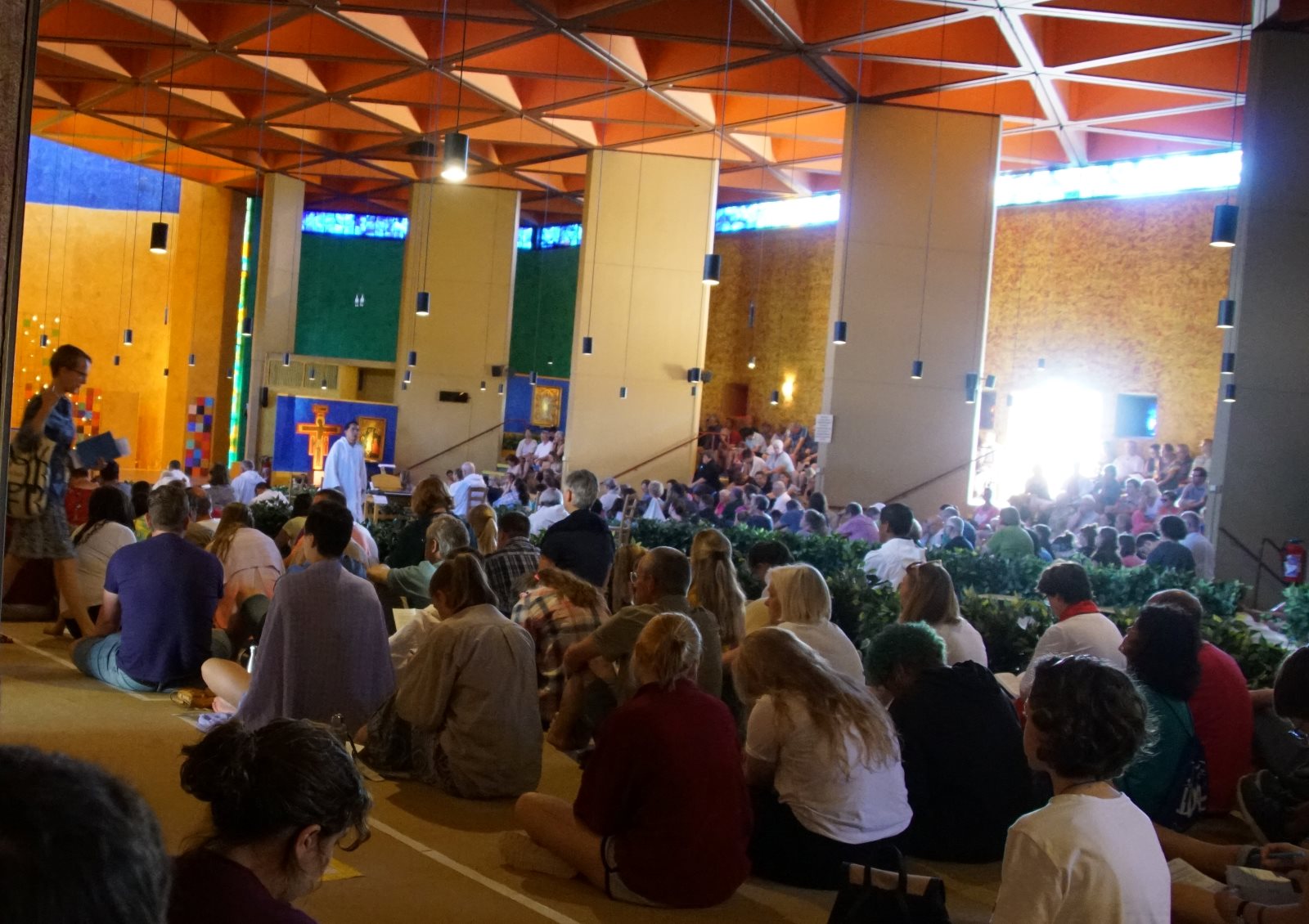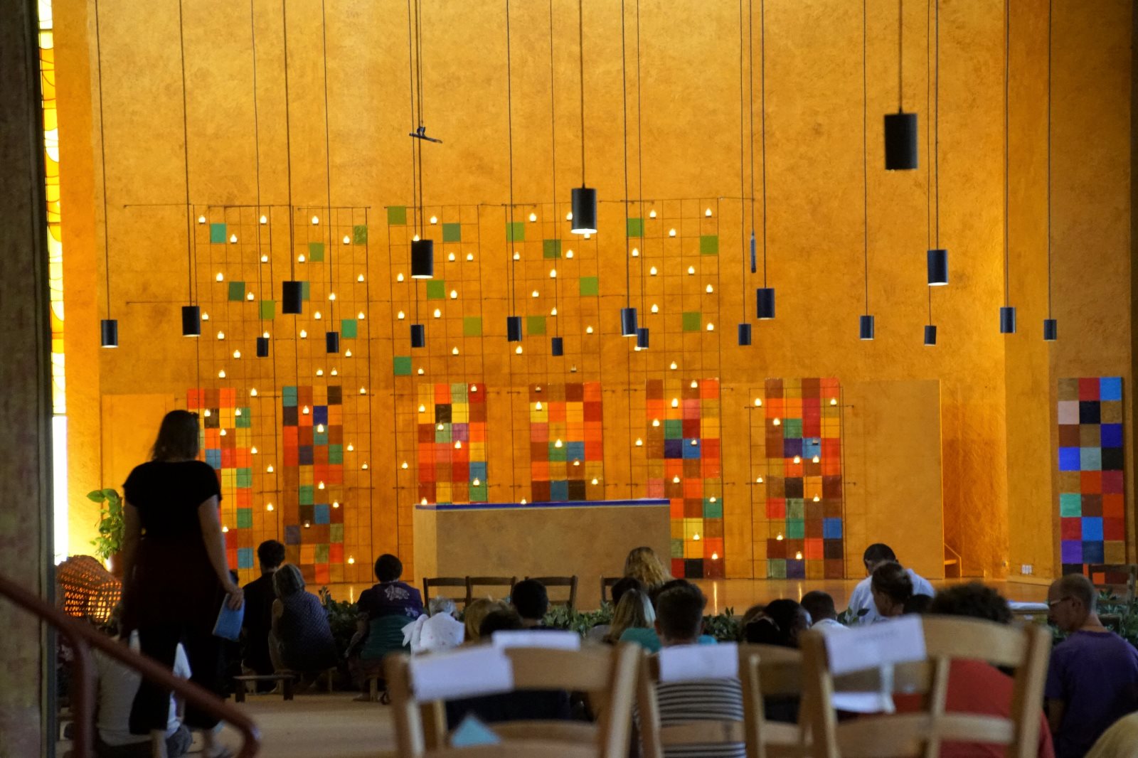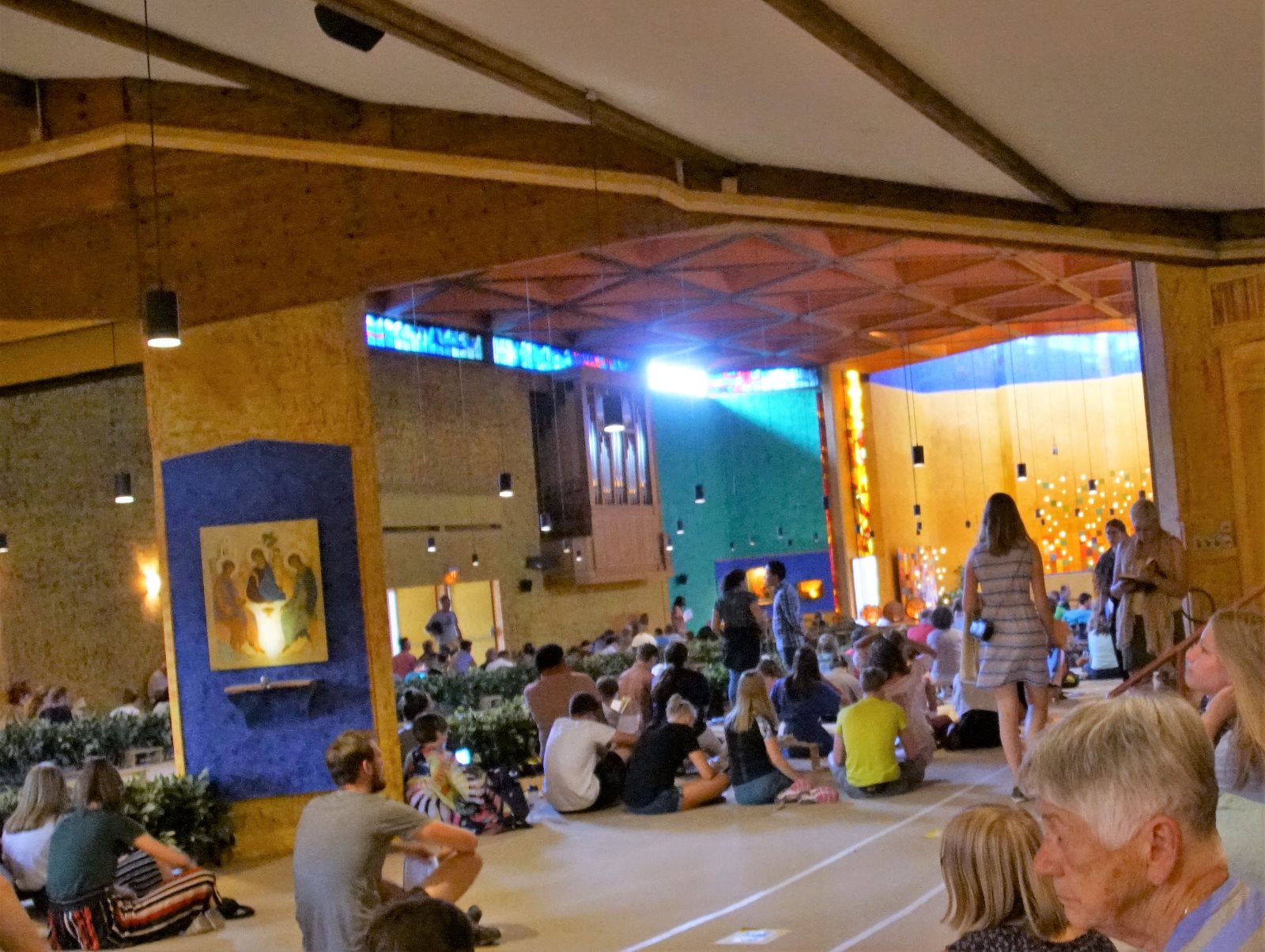In der Kirche merkt man, dass es dem Wochenende zugeht, denn es wird viel kräftiger gesungen. Soweit ich sehe, gefällt die einfach Art der Andacht allen recht gut, es ist viel Musik und eben jeweils Stille. (Drei Mal am Tag eine knappe Stunde ohne Handy und sonstige Ablenkung. Das ist schon eine erstaunliche Leistung. Sonst können sie sich das kaum vorstellen. Es geht eben, weil sich alle daran halten. Zudem sind nur in der Kirche Steckdosen. Dort kann man die Zeit nutzen, dass sie dann wieder geladen sind.