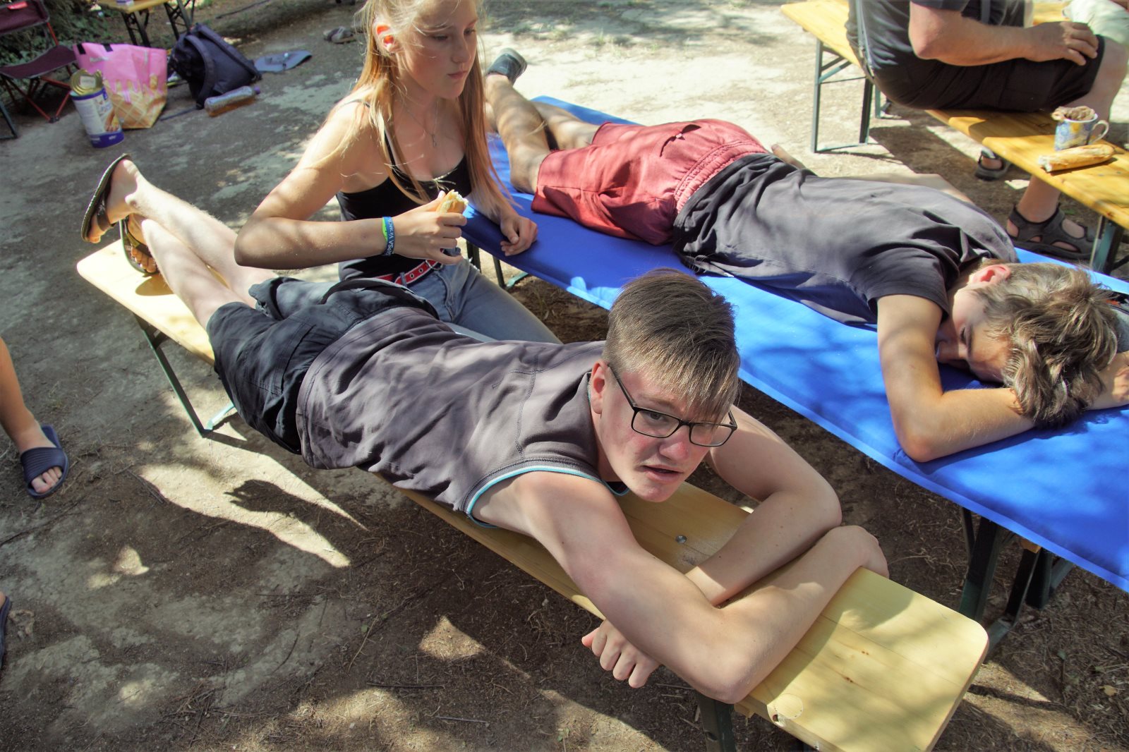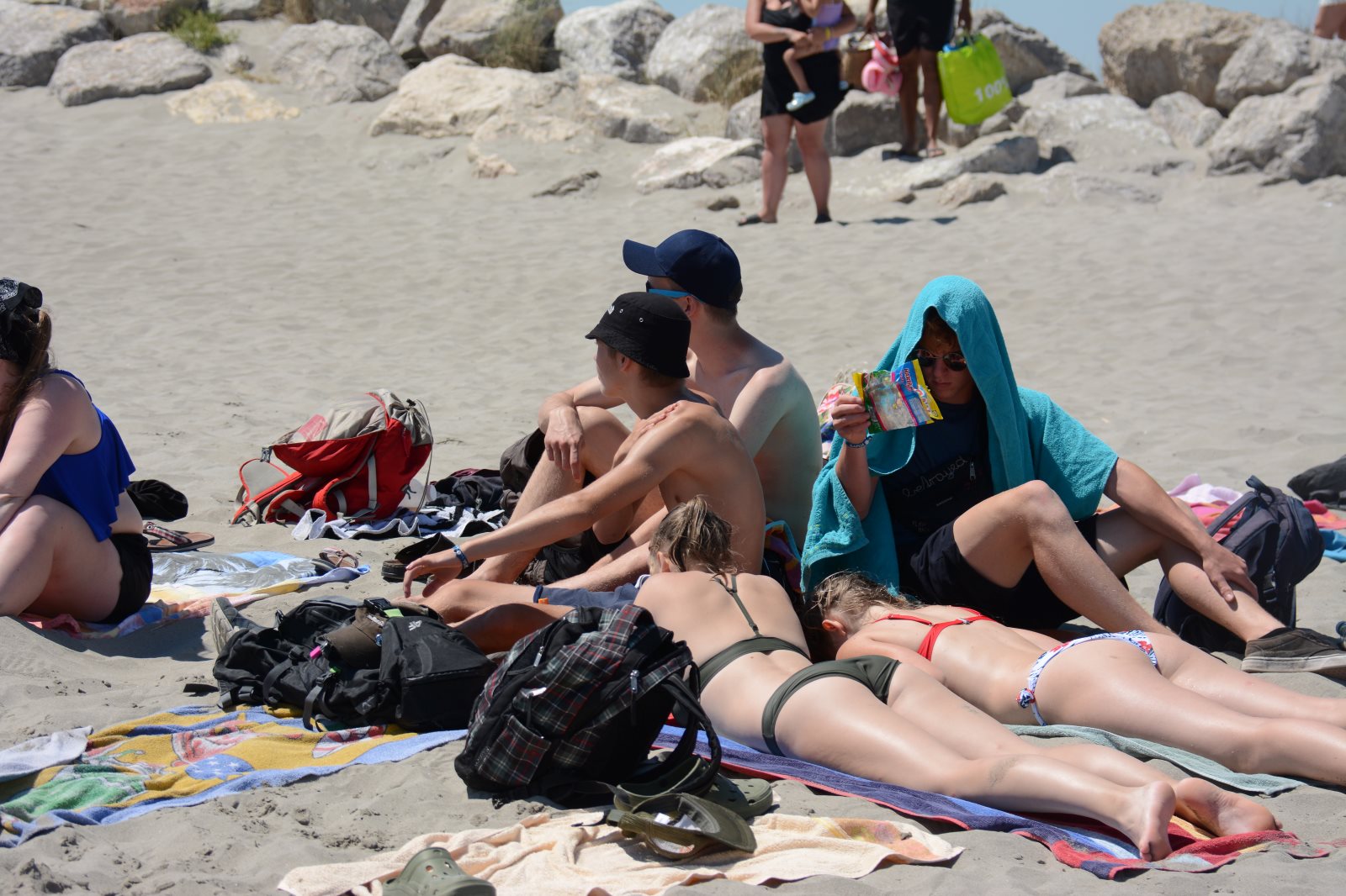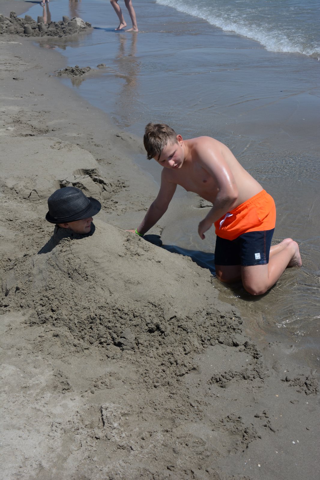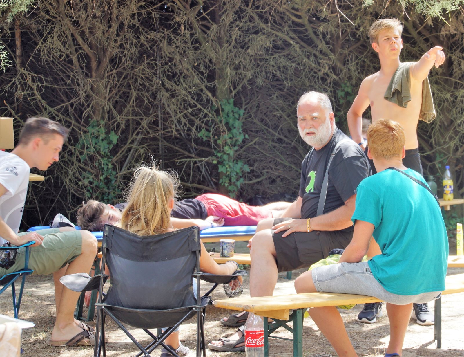 Unsere Jungs haben heute draußen geschlafen. Die Mädchen zum Teil auch. Wir haben uns an die französischen Gesetze gehalten. Das heißt die Mädchen haben hinter ihrem Zeot geschlafen und die Jungs bei uns. Ehrlich gesagt schlafen Frank und ich schon die ganzen Tage draußen. Wenn es nachts nicht abkühlt, möchte man nicht im Auto oder im Zelt schlafen. Zum Glück sind hier ständig Geräusche von Zügen, Autos und ein paar verrückten Autofahrern, die nebenan das „Driften“ üben, so dass die lauten Schnarcher gar nicht so auffallen. Die Zikaden könnten ja sonst noch in uns eine unliebsame Konkurrenz entdecken, die fast an die selbe Lautstärke wie sie kommt.