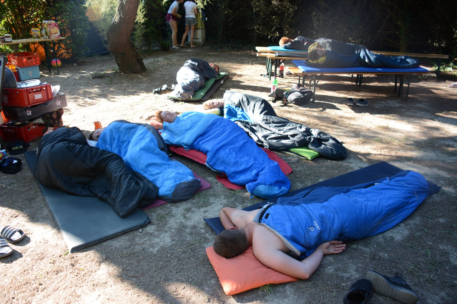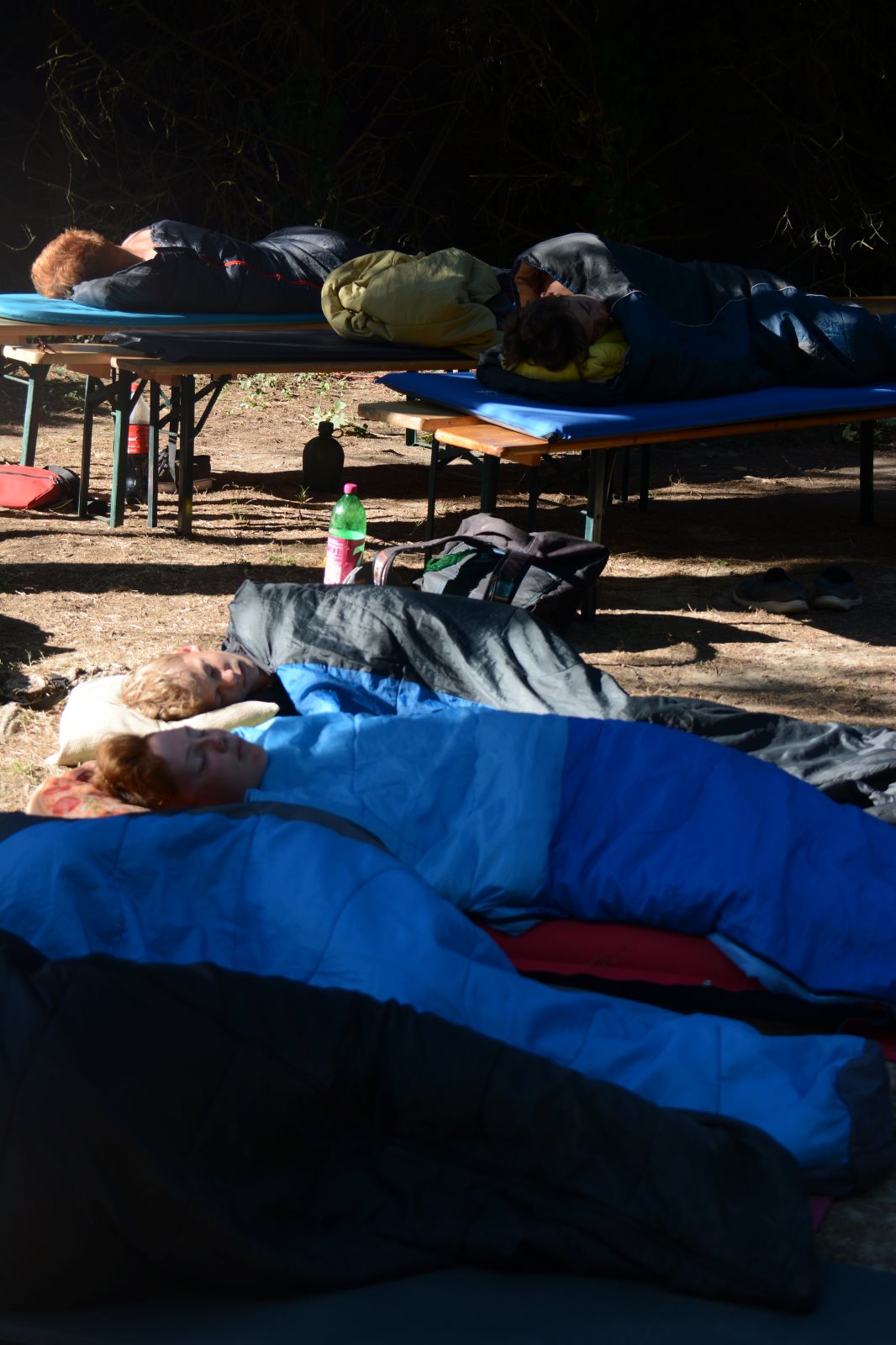 Spaß beiseite: Die sonne weckt dann recht schnell alle auf. Wenn sie erst den Schlafsack erwärmt, ist an Schlaf nicht mehr zu denken.