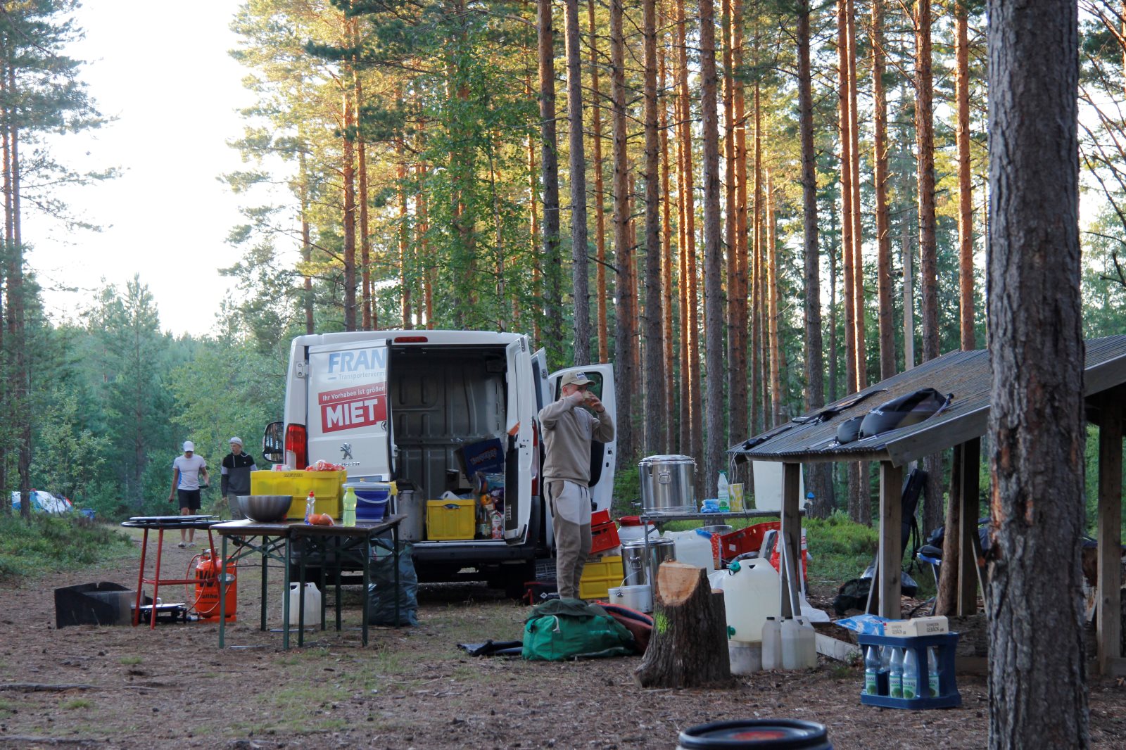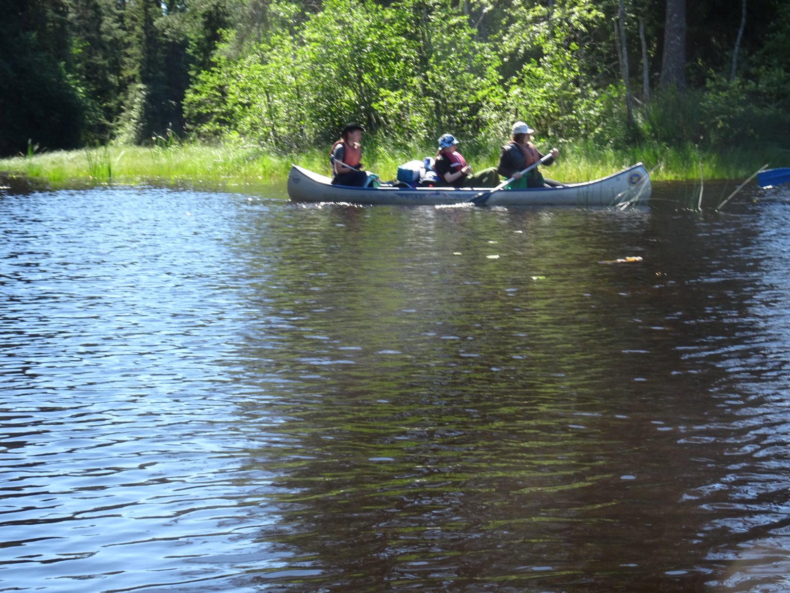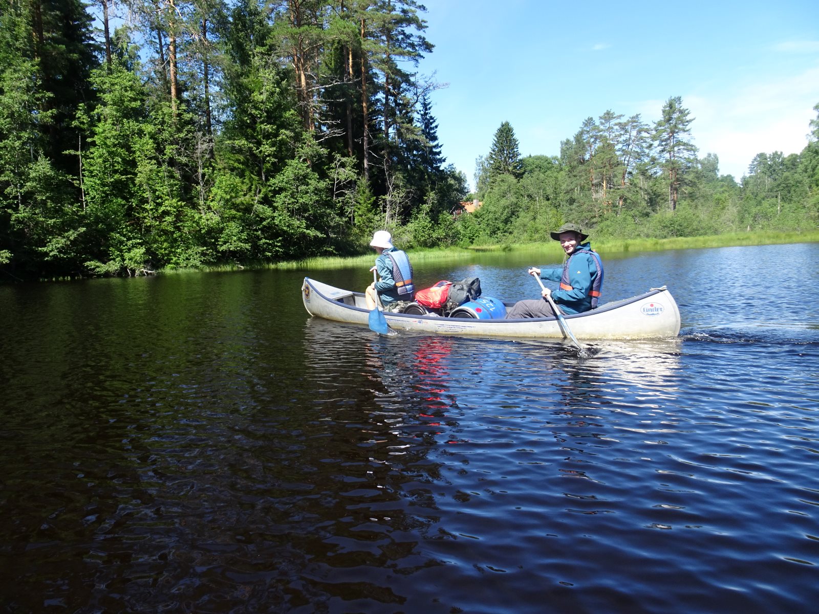 Früh morgens war sie zu sehen, die Sonne. Und sie blieb uns bis Abends erhalten. Aber kein Tag ohne einen neuen Rekord! Der erste war das Problem mit dem Auto am ersten Abend. Dann das Kentern am zweiten Tag und die Feststellung, dass am zweiten Frühstück noch keine Nutella offen war, dafür aber sechs Kilo Tortelini vertilgt wurde (reicht üblicher weise für 50 Personen). Heute kam das zweite Kentern hinzu. Und es ist der zweite Tag auf dem Wasser ohne einen Fischfang. (Obwohl die Angel häufig im Wasser waren.) Das Paddeln verlief gut ansonsten gut. Tim ist allerdings erkrankt, hoffen wir das Beste. Gut, dass wir morgen sowieso erst einmal hier bleiben wollten. Auf unserem Biwak ist auch eine Gruppe aus Berlin.
