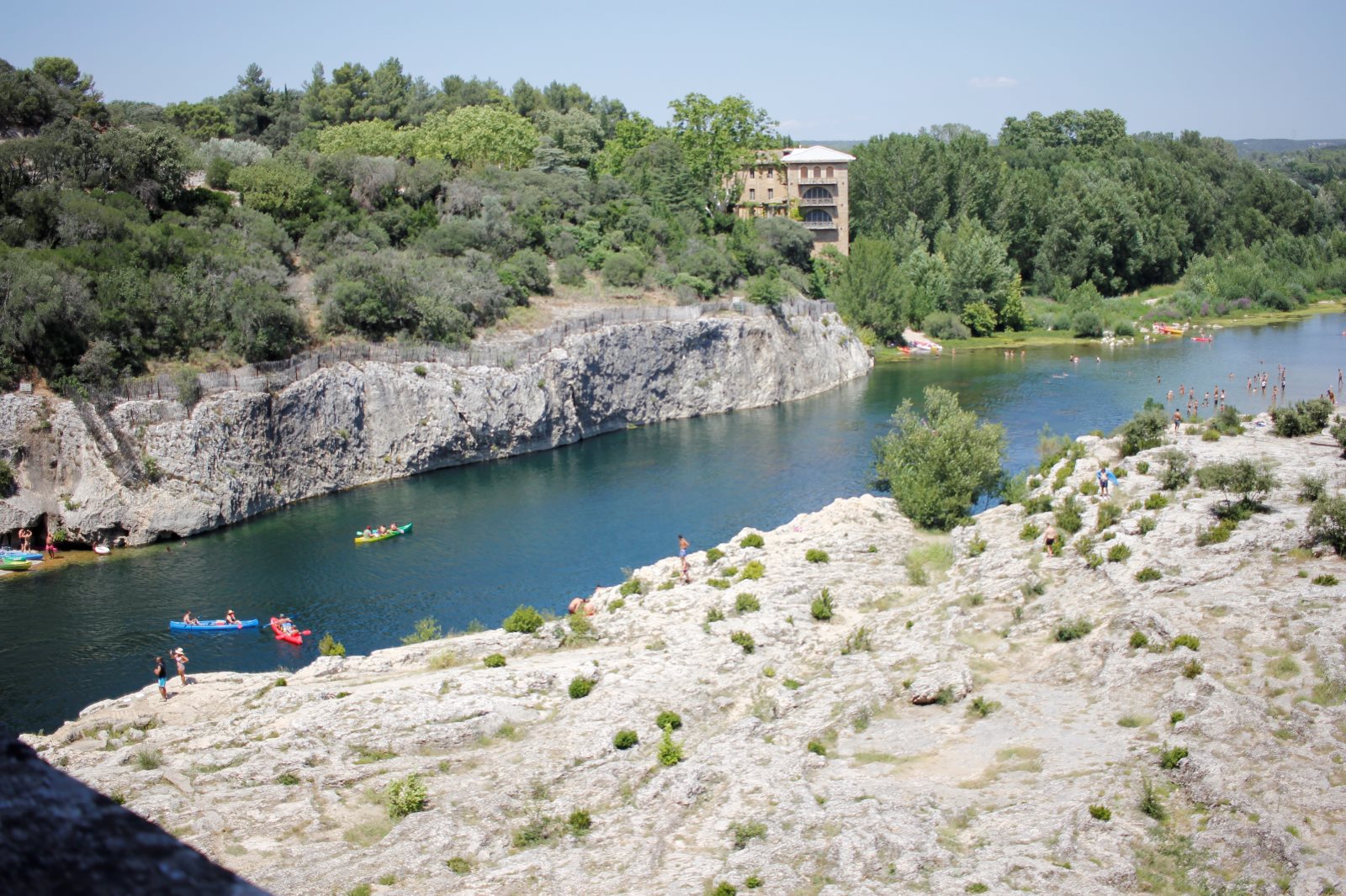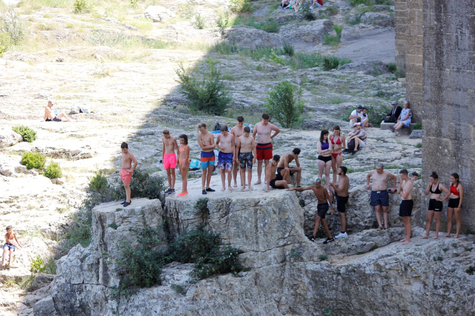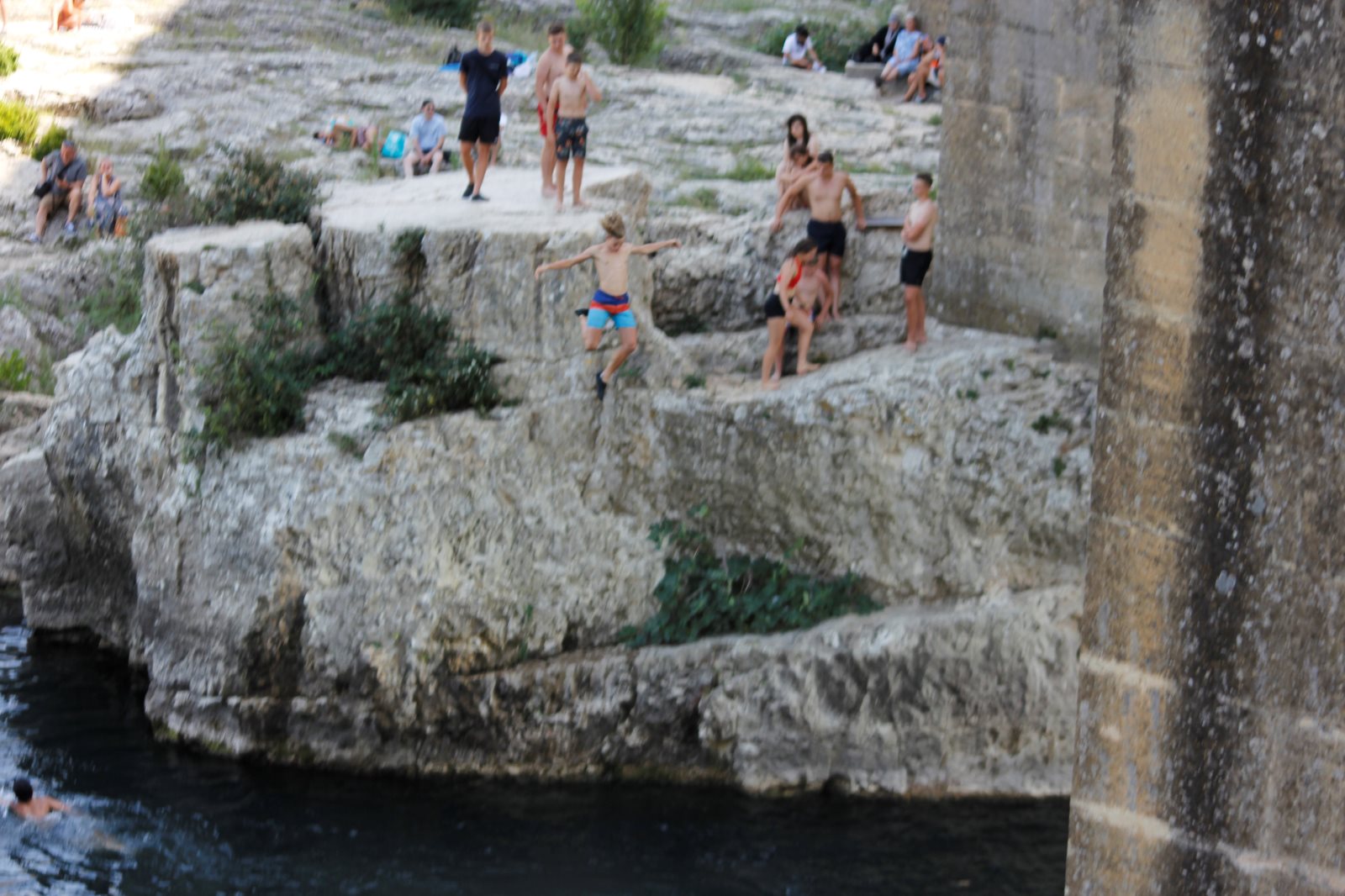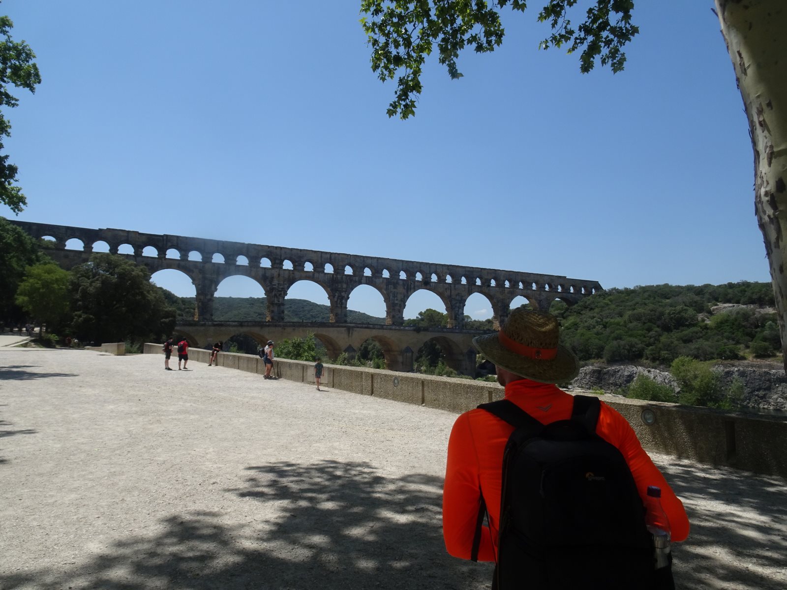 Das Aquädukt zeigte sich im strahlenden Sonnenschein. Nach einer kurzen Einleitung von Frank ging es auf Entdeckungstour. Ein paar erklommen das Aquädukt, ein paar suchten Schatten und genossen den Blick und anderer erkundeten des Gardon und sein kaltes Wasser.
