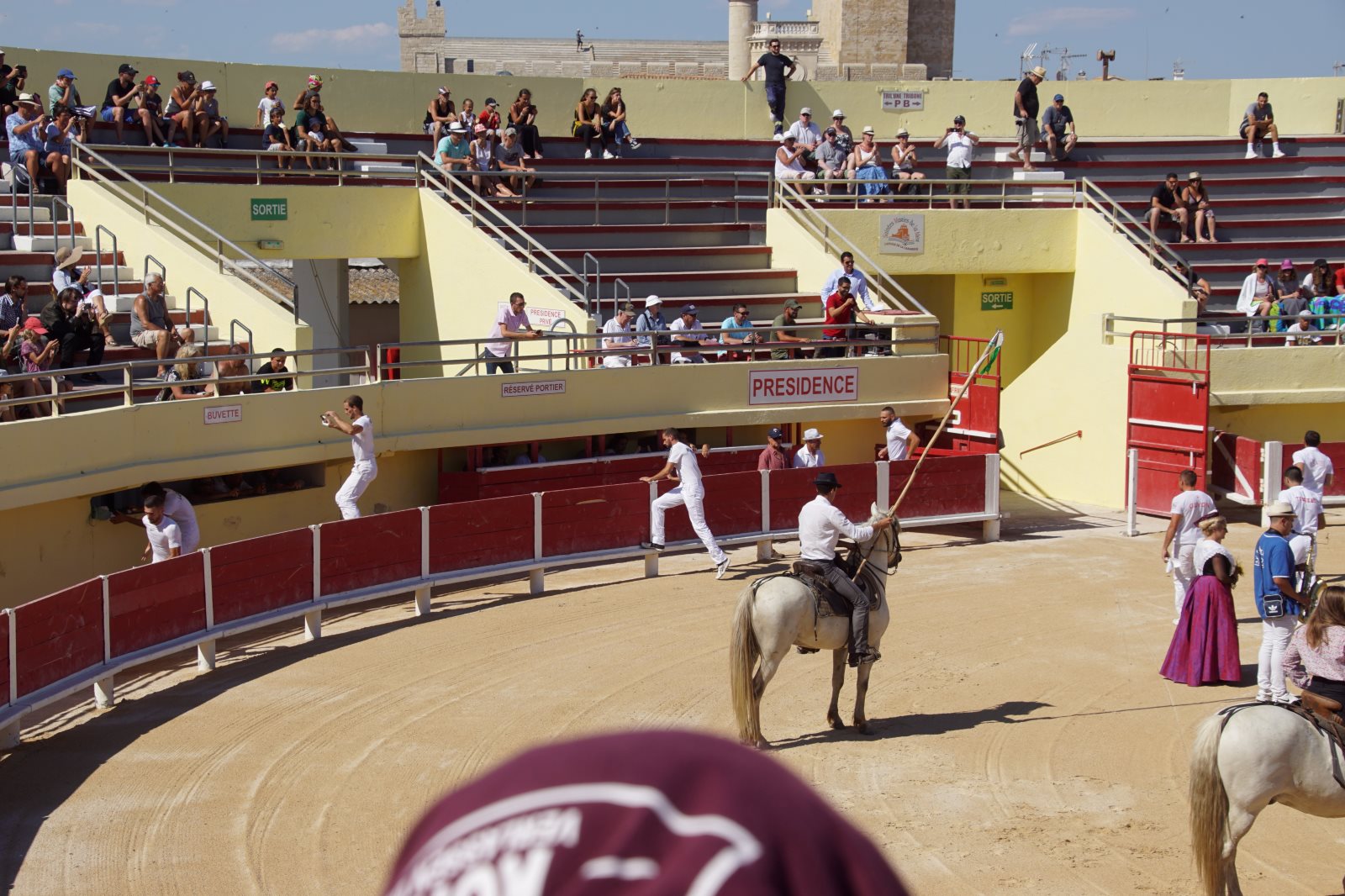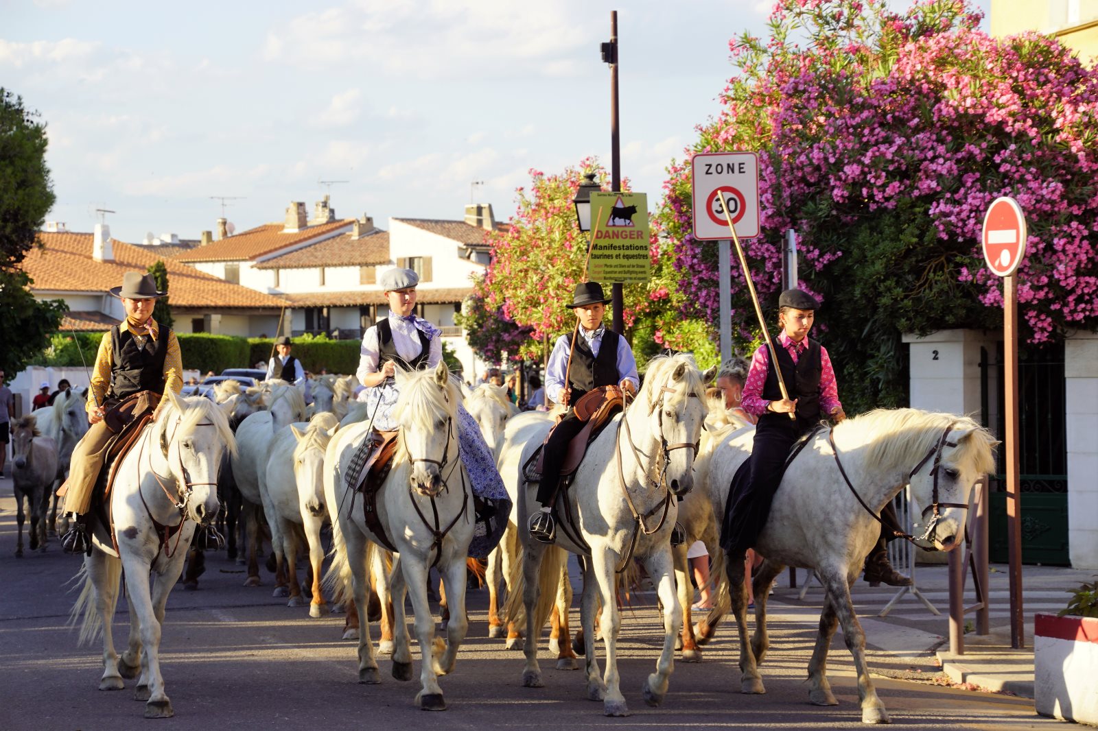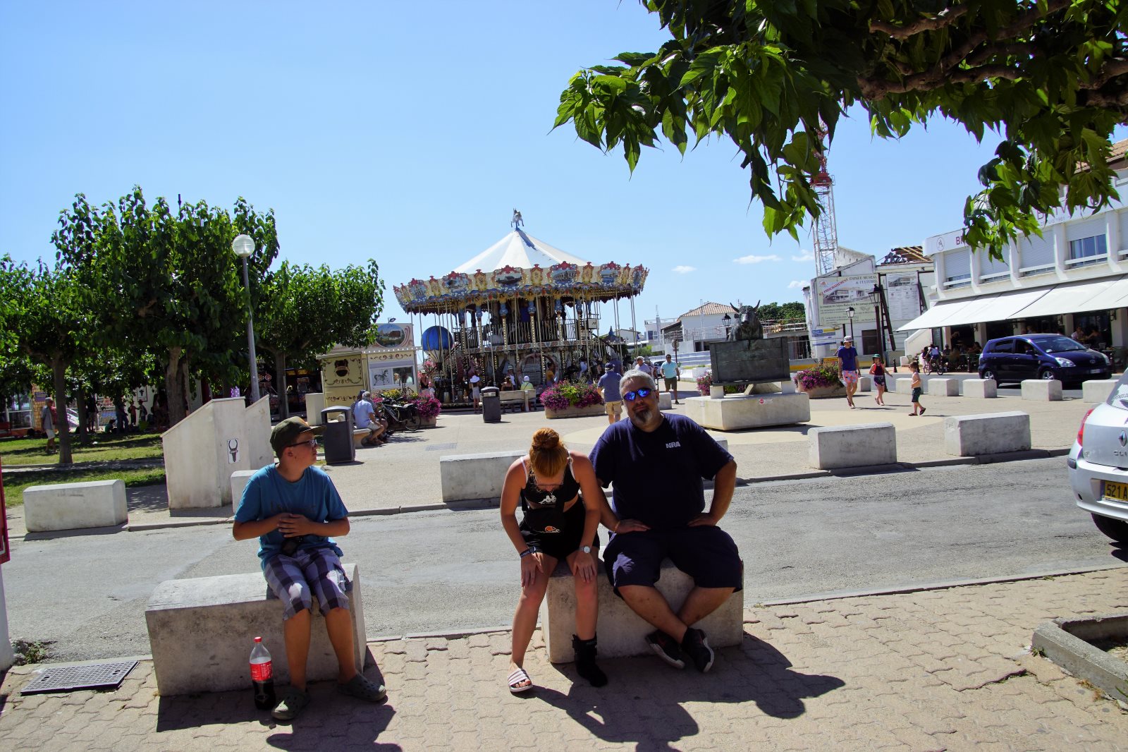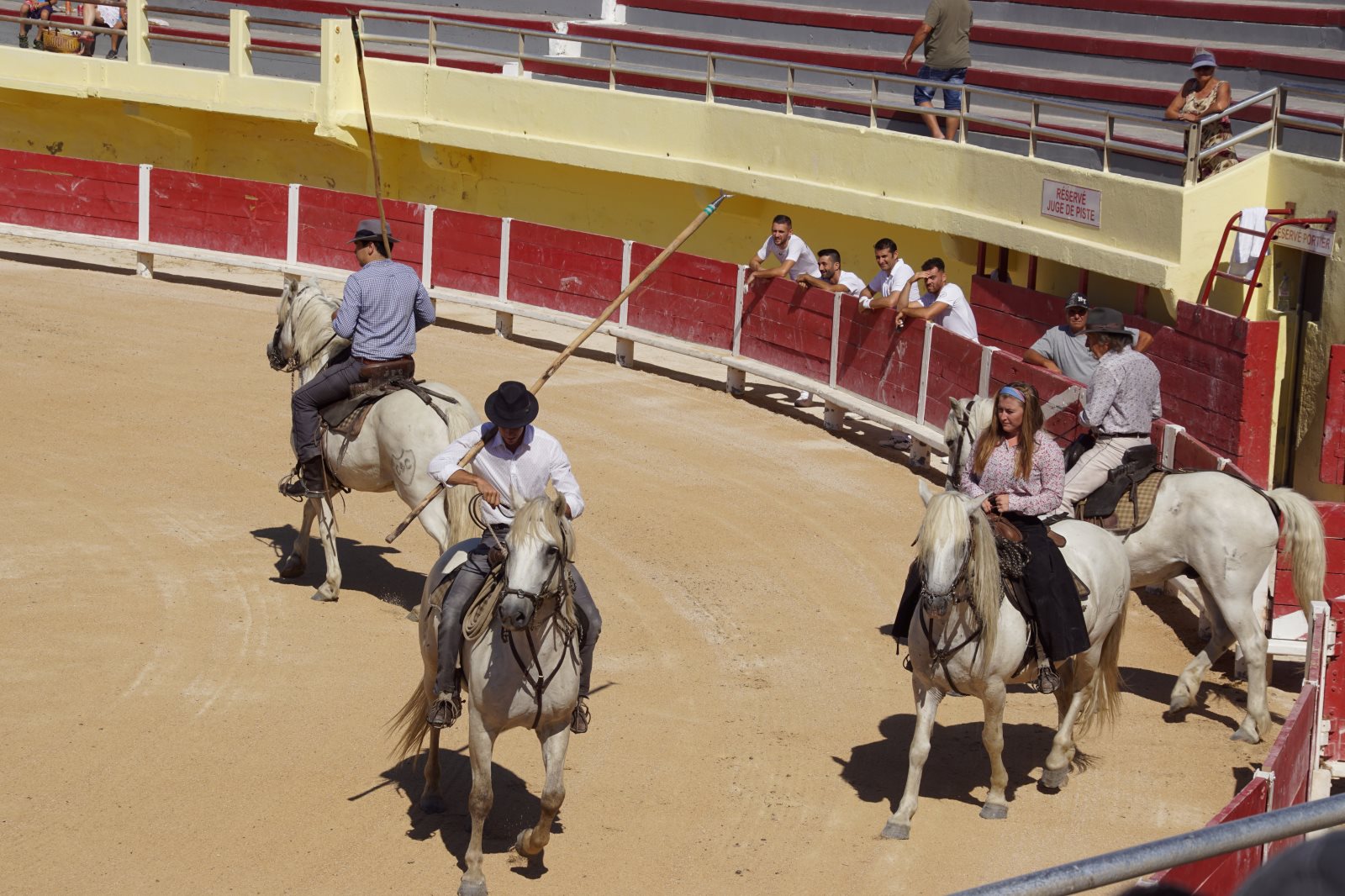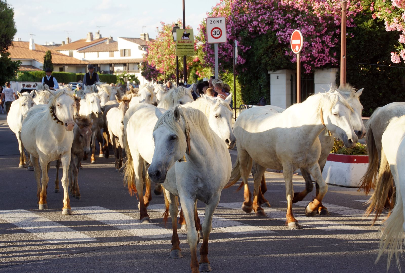 Nach diesem zweistündigen Spektakel wollten wir dann zur Käsesauce nach Hause aufbrechen. Clever wie wir nun mal sind, haben wir die Autos vom Parkplatz am Strand hergeholt und wollten an der Arena vorfahren. Gerade zu dieser Zeit wurde die Straße aber wegen eines Umzuges der weißen Pferde der Camargue gesperrt und wir kamen nicht in die Innenstadt. Frank hat sich freundlich an einen Polizisten gewandt, um ihm klarzumachen, dass wir unsere Kids abholen müssten. Der Versuch einer Frage wurde aber mit Klopfen auf den Kühler beantwortet und er zückte den Block… Da haben wir es lieber gelassen und einer ist durch die Stadt gelaufen und hat die Kids dorthin geholt. Zum Glück dauerte der Umzug gerade so lange, wie sie für den Weg brauchen. Dann wurden wir mit kräftigem Winken des Polizisten aufgefordert endlich weiterzufahren. Es sind eben Respektspersonen (s.o.). Aber das kann auch nicht alle Probleme lösen, wie man daraus ersieht.