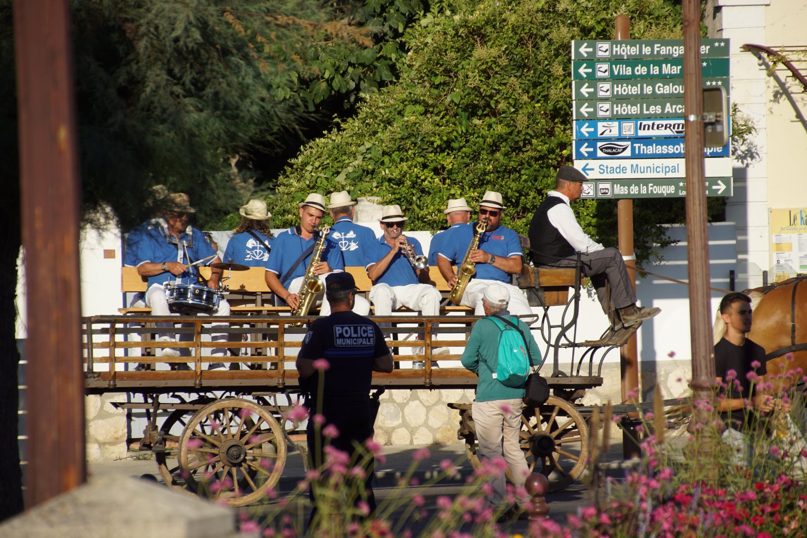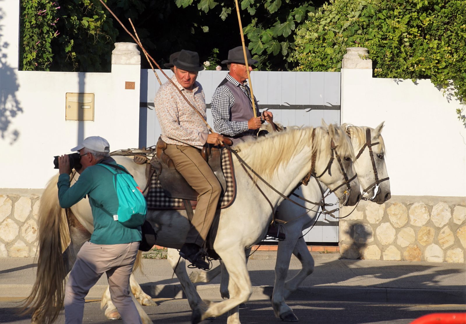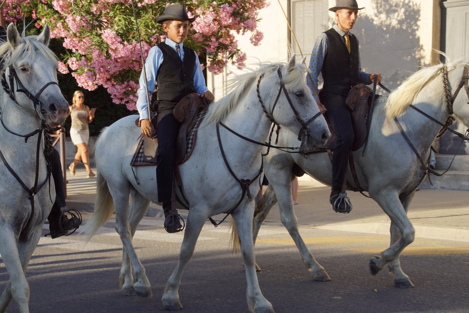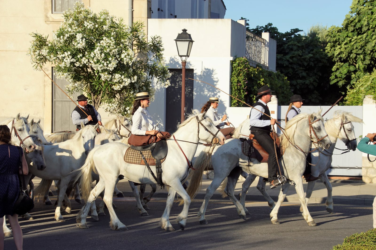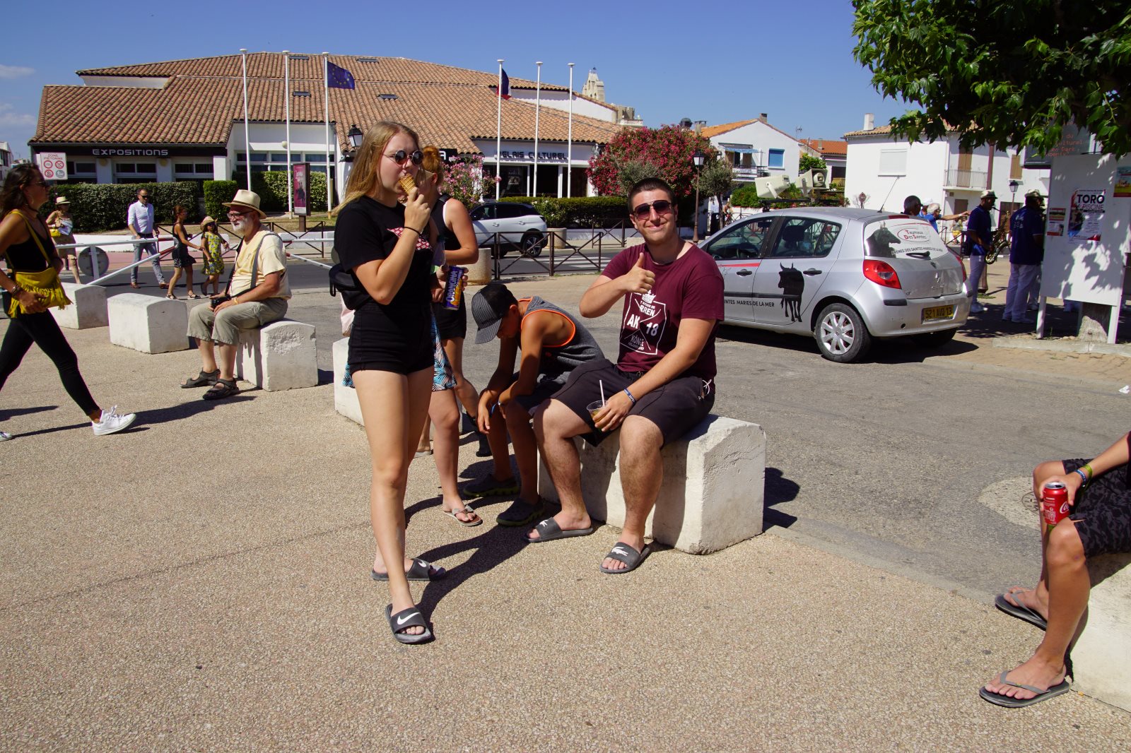 Nach diesem zweistündigen Spektakel wollten wir dann zur Käsesauce nach Hause aufbrechen. Clever wie wir nun mal sind, haben wir die Autos vom Parkplatz am Strand hergeholt und wollten an der Arena vorfahren. Gerade zu dieser Zeit wurde die Straße aber wegen eines Umzuges der weißen Pferde der Camargue gesperrt und wir kamen nicht in die Innenstadt. Frank hat sich freundlich an einen Polizisten gewandt, um ihm klarzumachen, dass wir unsere Kids abholen müssten. Der Versuch einer Frage wurde aber mit Klopfen auf den Kühler beantwortet und er zückte den Block… Da haben wir es lieber gelassen und einer ist durch die Stadt gelaufen und hat die Kids dorthin geholt. Zum Glück dauerte der Umzug gerade so lange, wie sie für den Weg brauchen. Dann wurden wir mit kräftigem Winken des Polizisten aufgefordert endlich weiterzufahren. Es sind eben Respektspersonen (s.o.). Aber das kann auch nicht alle Probleme lösen, wie man daraus ersieht.