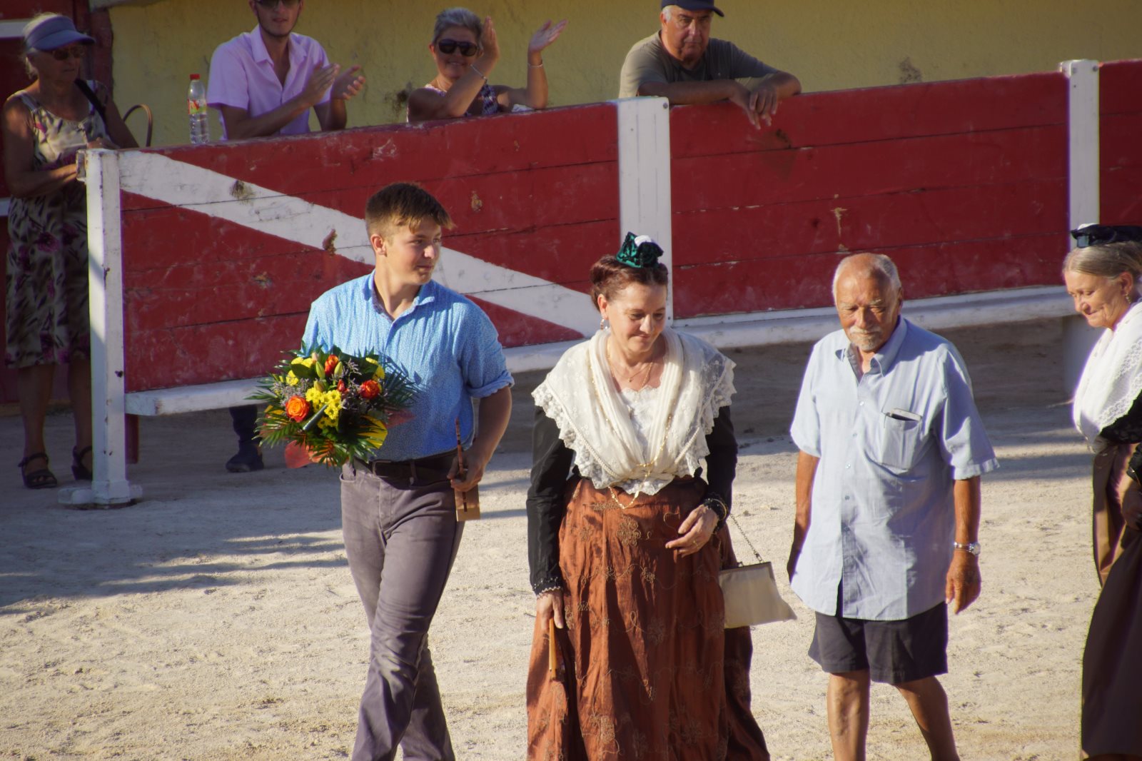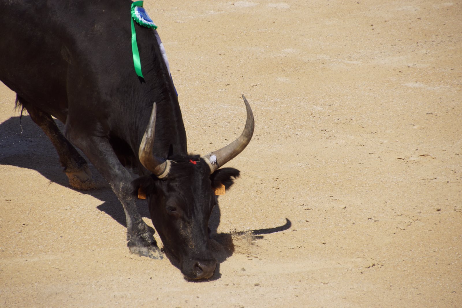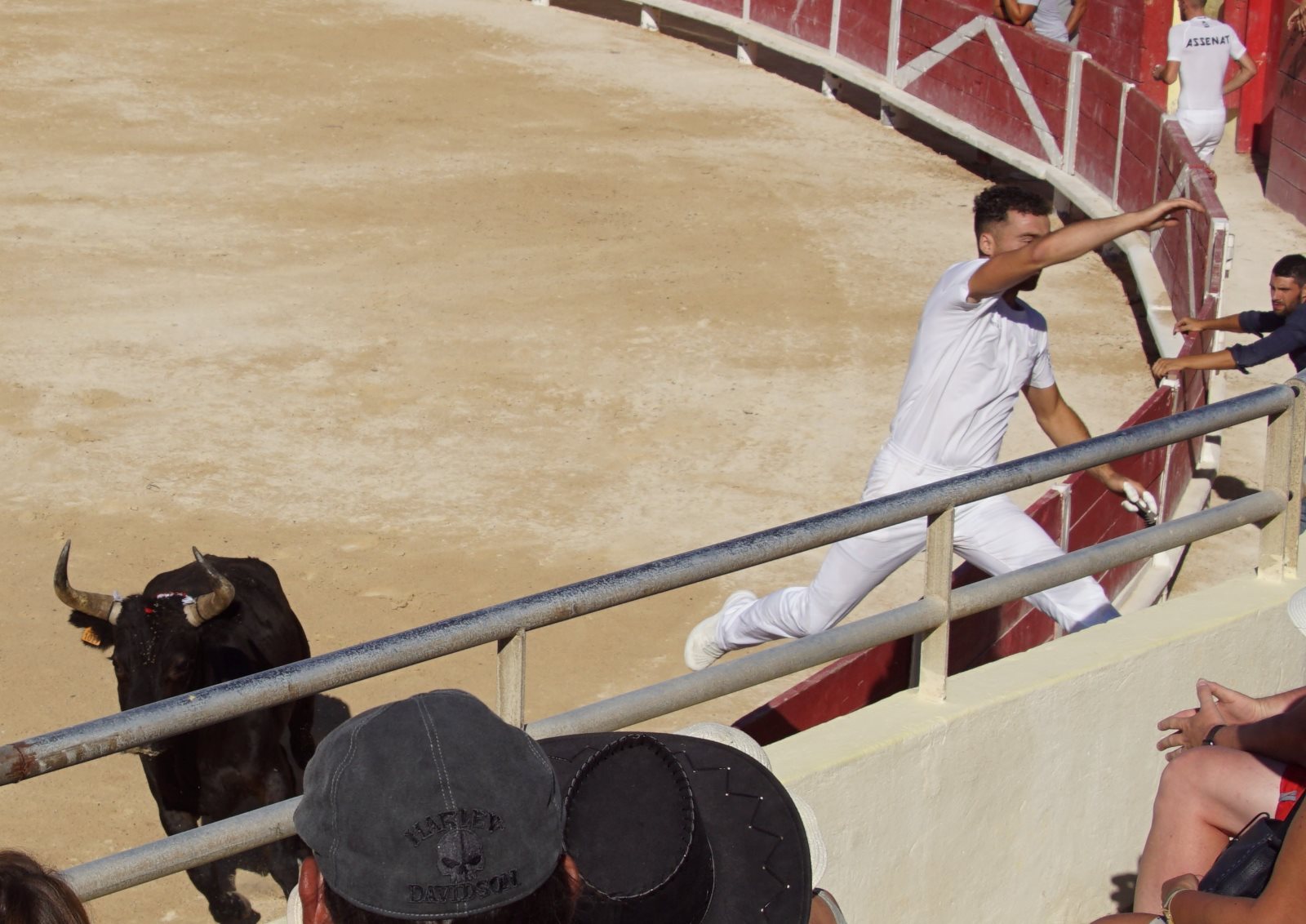 Ich hatte den Mädchen erzählt, dass sie nun Jungs sehen werden, die diesen Namen verdienen und alles in den Schatten stellen, was sie bisher gesehen haben 😊. Natürlich würden unsere Jungs blass aussehen. Wie wir nun aber feststellen mussten, war es nicht (wie sonst) die junge Mannschaft, sondern es waren die „älteren Herren“ zwischen (25 und 30 Jahren). Prompt beklagte sich ein Mädchen, dass nur einer richtig toll ausgesehen hätte, alle anderen wären doch so wie unsere Fußballer zu Hause. Irgendwie hatte sie ja recht, auch wenn die Jungs die kühnsten Sprünge machten, um vor dem Stier zu fliehen. Von 6 Stieren haben sie aber nur 4 wirklich „besiegt“ -also die Bändel vom Kopf gezogen. Zwei Mal haben die Stiere gewonnen. Sie haben keinen an sich herangelassen. So ein gewisser Stolz und Beherrschung der Beiden haben alle Cleverness der 16 Torreros aufgewogen. Also habend die Züchter den Preis bekommen. Ich musste bei den Vorführungen an die Situation der Lehrer denken, die auch die Störversuche der Schüler parieren müssen. Einigen Stieren haben wir deswegen auch Namen von Lehrern gegeben… Ich werde mich aber hüten, sie hierher zu schreiben.😊