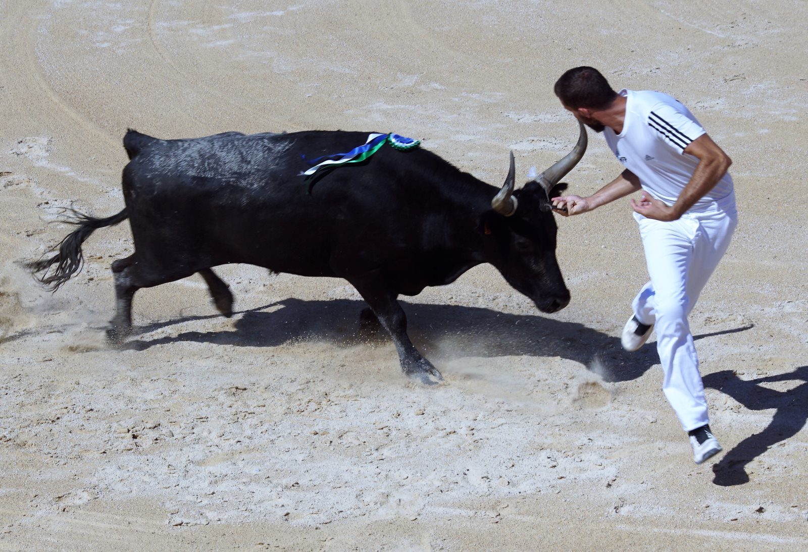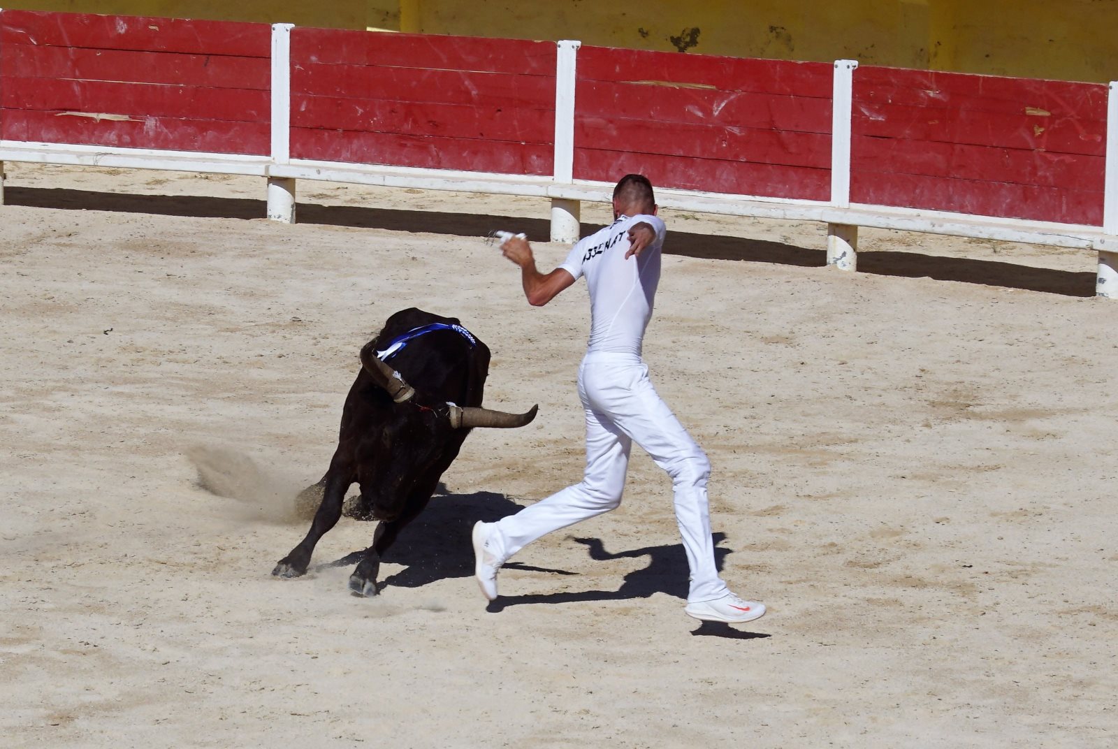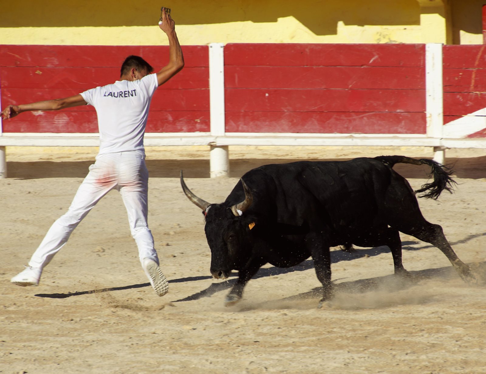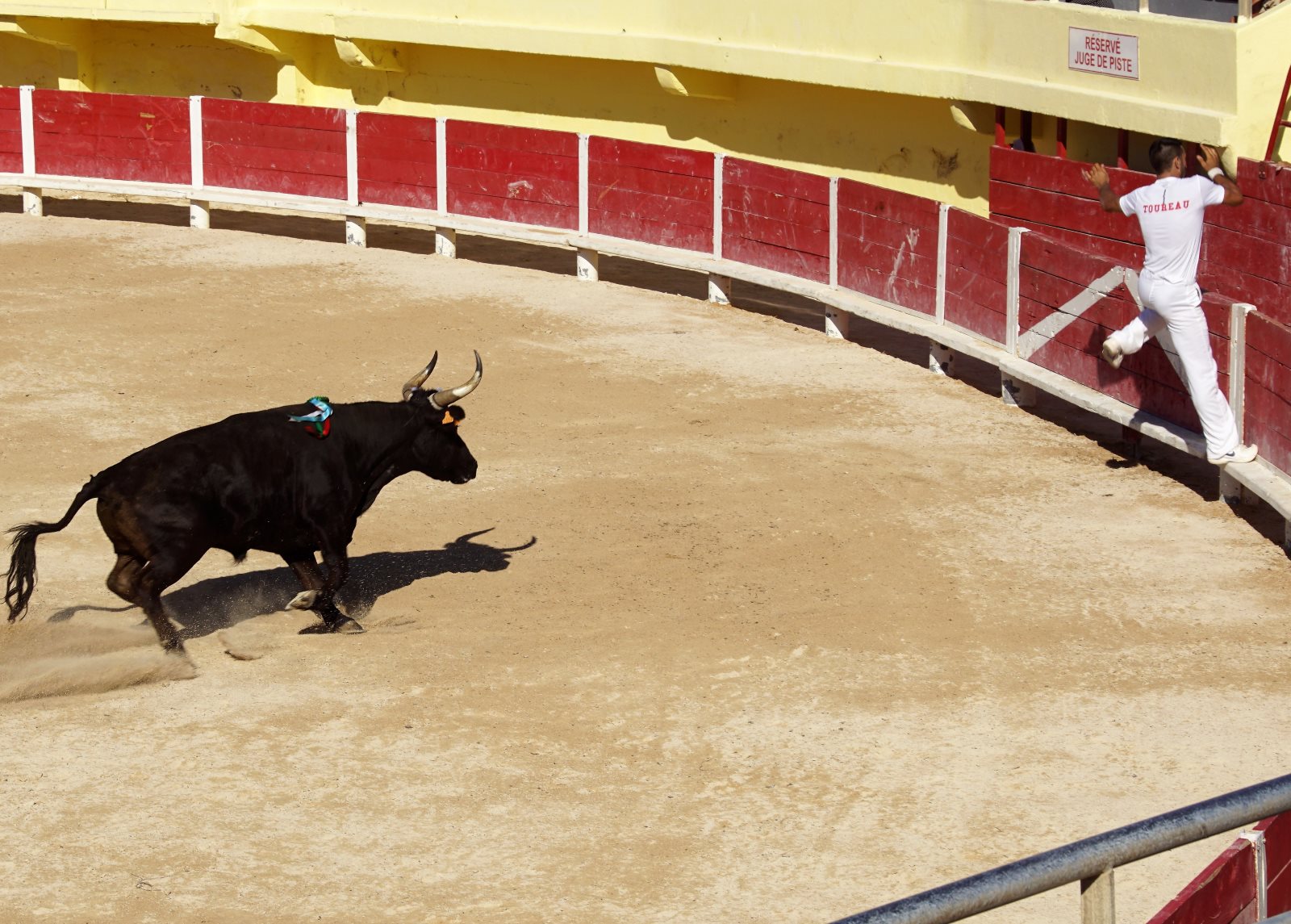Ich hatte den Mädchen erzählt, dass sie nun Jungs sehen werden, die diesen Namen verdienen und alles in den Schatten stellen, was sie bisher gesehen haben 😊. Natürlich würden unsere Jungs blass aussehen. Wie wir nun aber feststellen mussten, war es nicht (wie sonst) die junge Mannschaft, sondern es waren die „älteren Herren“ zwischen (25 und 30 Jahren). Prompt beklagte sich ein Mädchen, dass nur einer richtig toll ausgesehen hätte, alle anderen wären doch so wie unsere Fußballer zu Hause. Irgendwie hatte sie ja recht, auch wenn die Jungs die kühnsten Sprünge machten, um vor dem Stier zu fliehen. Von 6 Stieren haben sie aber nur 4 wirklich „besiegt“ -also die Bändel vom Kopf gezogen. Zwei Mal haben die Stiere gewonnen. Sie haben keinen an sich herangelassen. So ein gewisser Stolz und Beherrschung der Beiden haben alle Cleverness der 16 Torreros aufgewogen. Also habend die Züchter den Preis bekommen. Ich musste bei den Vorführungen an die Situation der Lehrer denken, die auch die Störversuche der Schüler parieren müssen. Einigen Stieren haben wir deswegen auch Namen von Lehrern gegeben… Ich werde mich aber hüten, sie hierher zu schreiben.😊